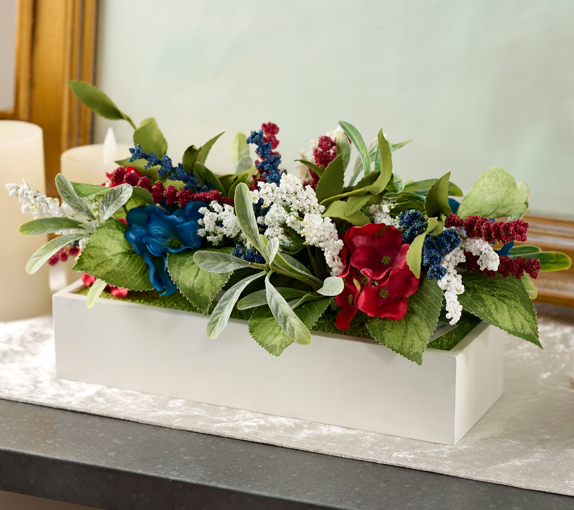 • Lifelike red and blue hydrangea with clusters of red, white, and blue berries and lifelike green foliage