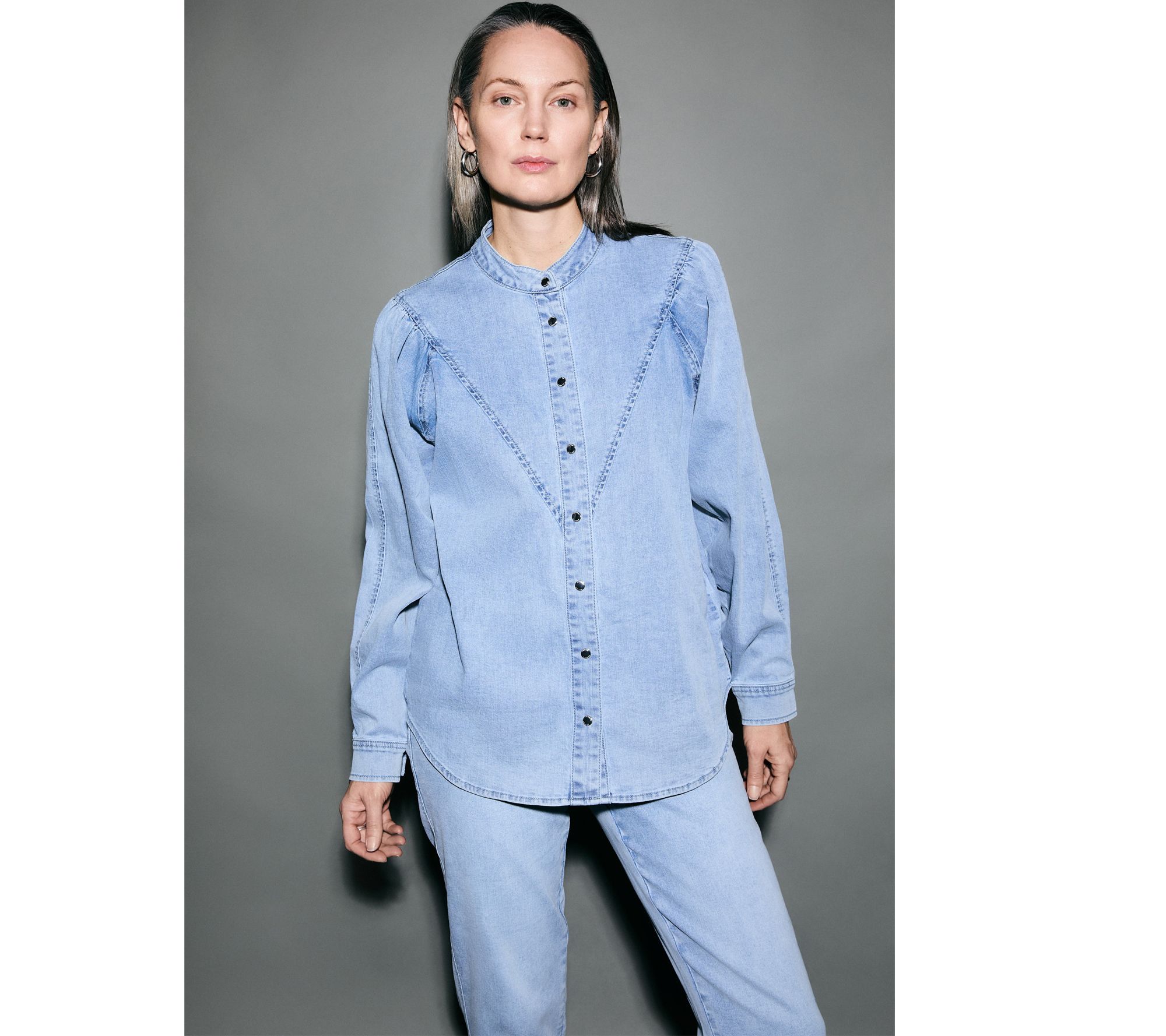 Commuting to the city, meeting friends for dinner, or relaxing during weekend errands, this stretch denim shirt pairs classic structure with effortless versatility. A mandarin collar and extended front yoke accented with topstitching give it a touch of contemporary charm, while gathered shoulders create an easygoing silhouette you can style up or down. From RM Studio x Rebecca Minkoff.
