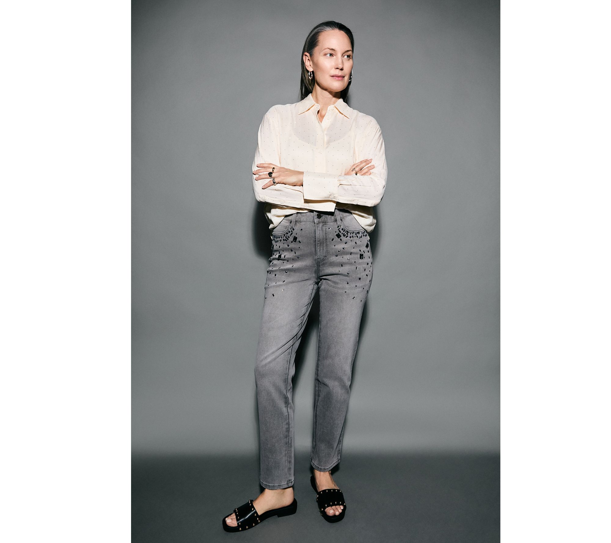 Polished details and playful embellishments lend instant personality to these Micha jeans, ready to turn heads on outings or energize casual Fridays. A sleek, straight leg and classic five-pocket style pair with artful sparkle for a look that balances comfort and standout charm. From RM Studio x Rebecca Minkoff.