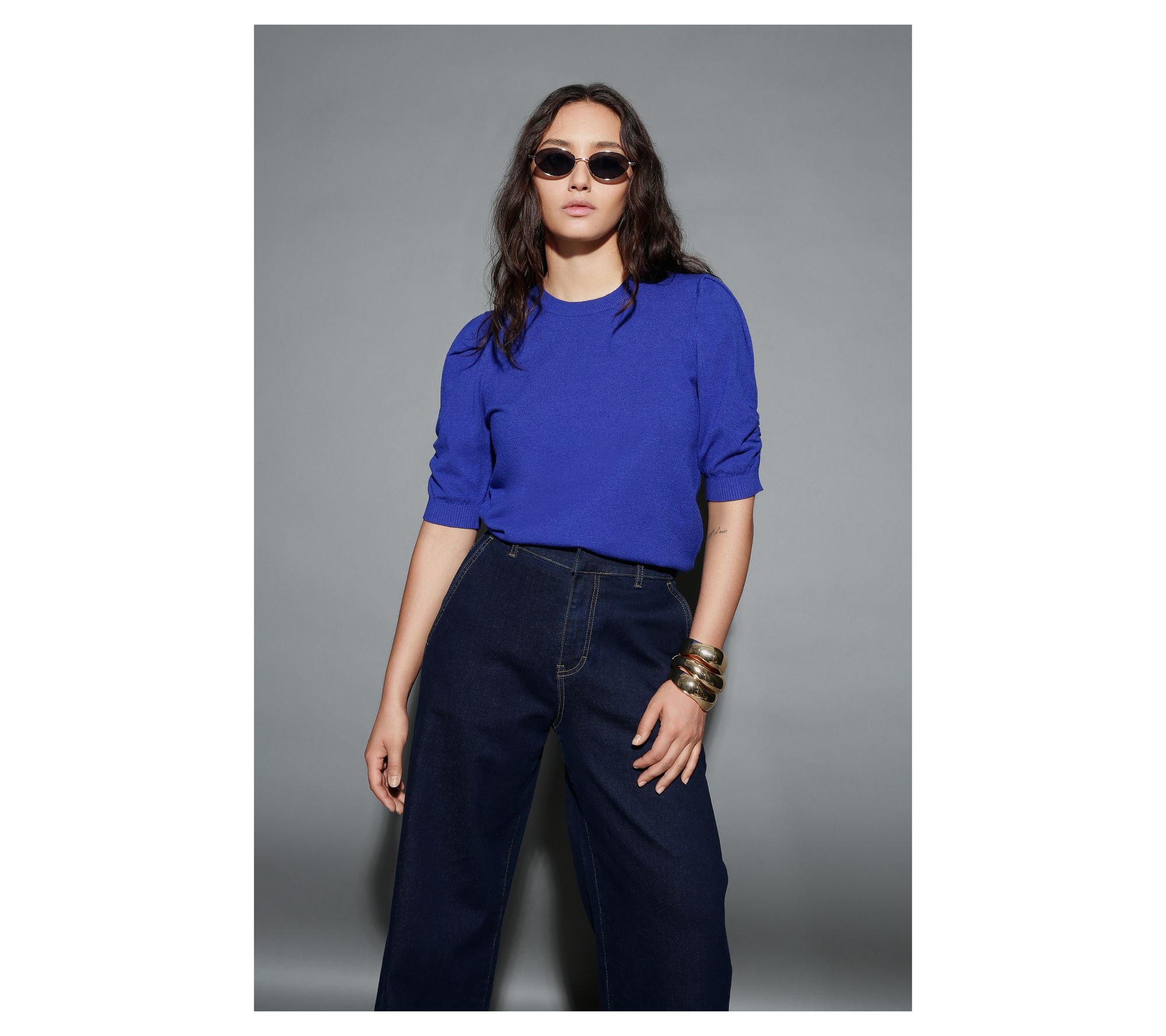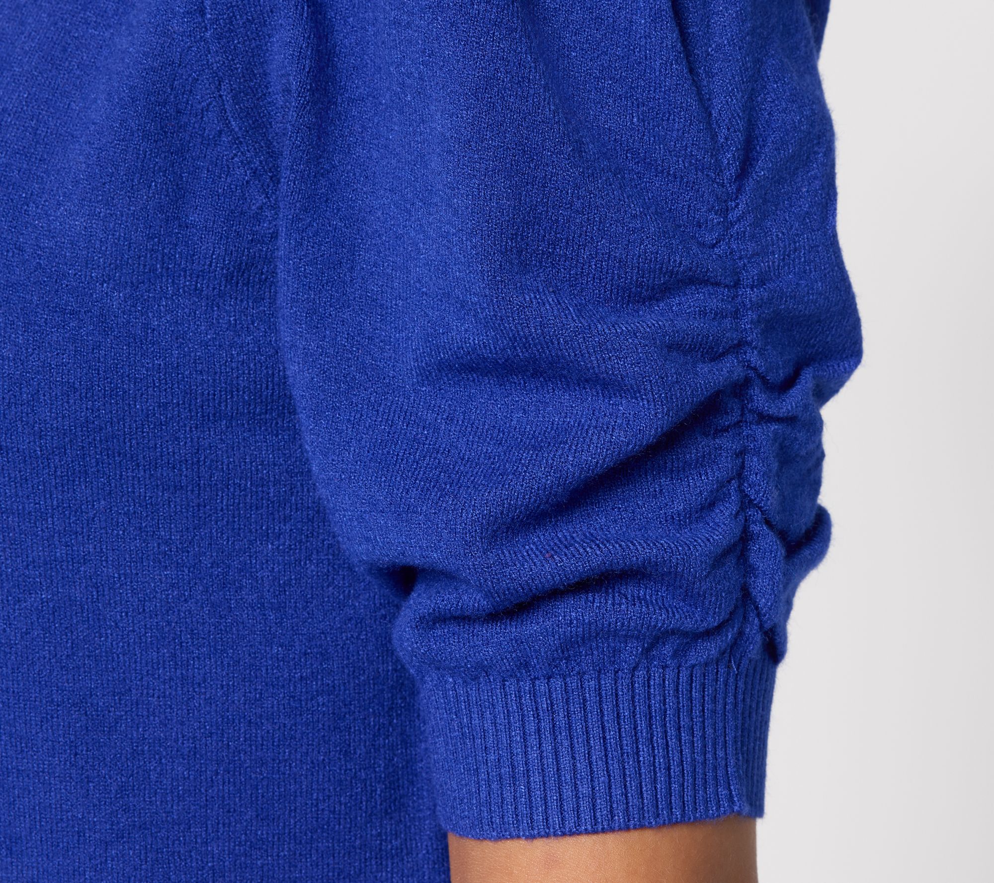 • Features: elbow-length puff sleeves with ruching, ribbed sleeve cuff and bottom hem
