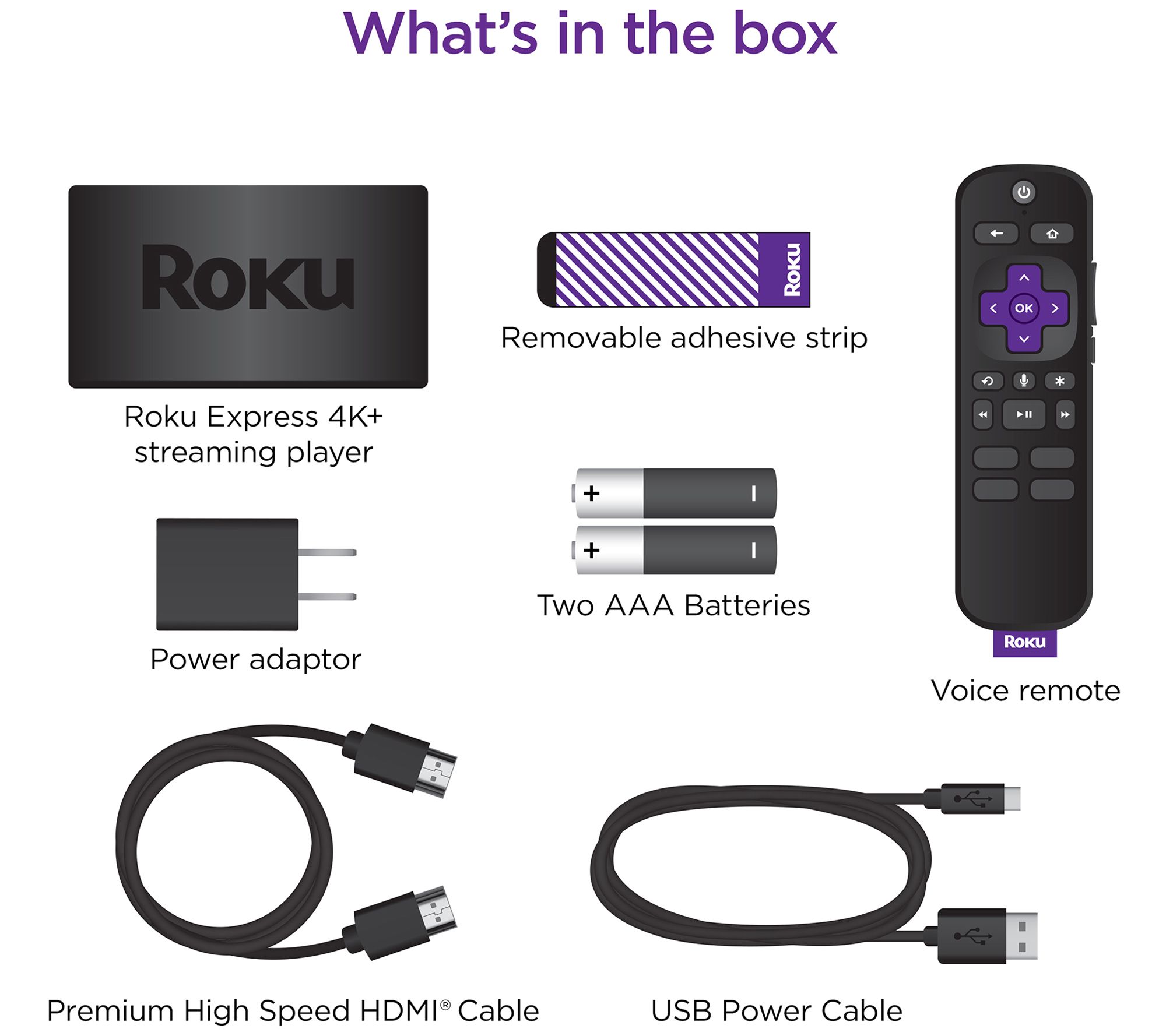 • Includes Roku Express+ 3941R streaming device with remote control, 2 AAA batteries, AC adapter, USB cable, HDMI cable, and adhesive strip; voucher