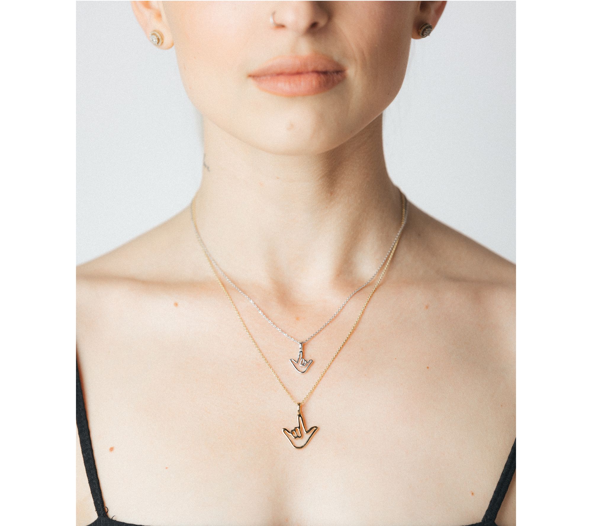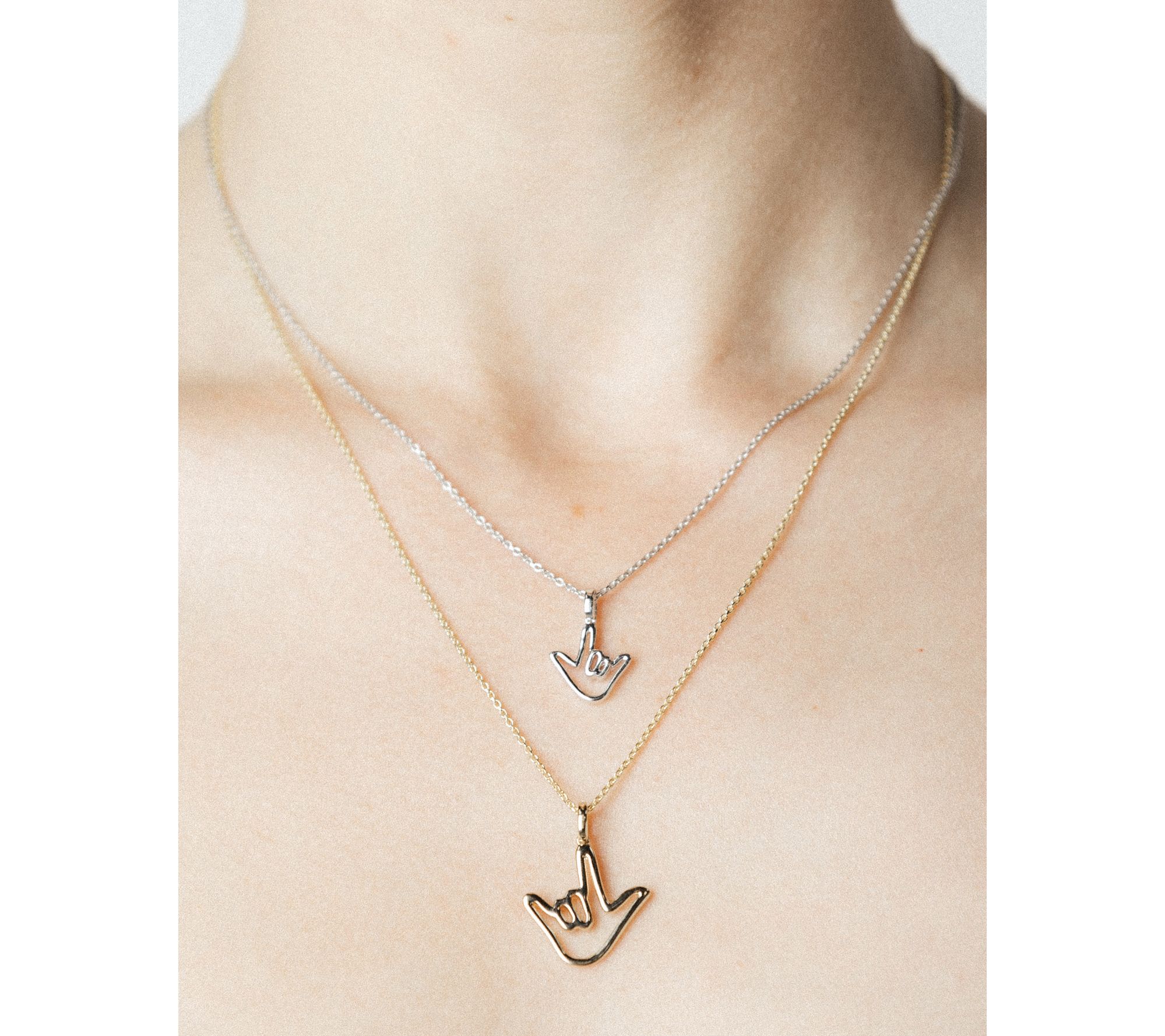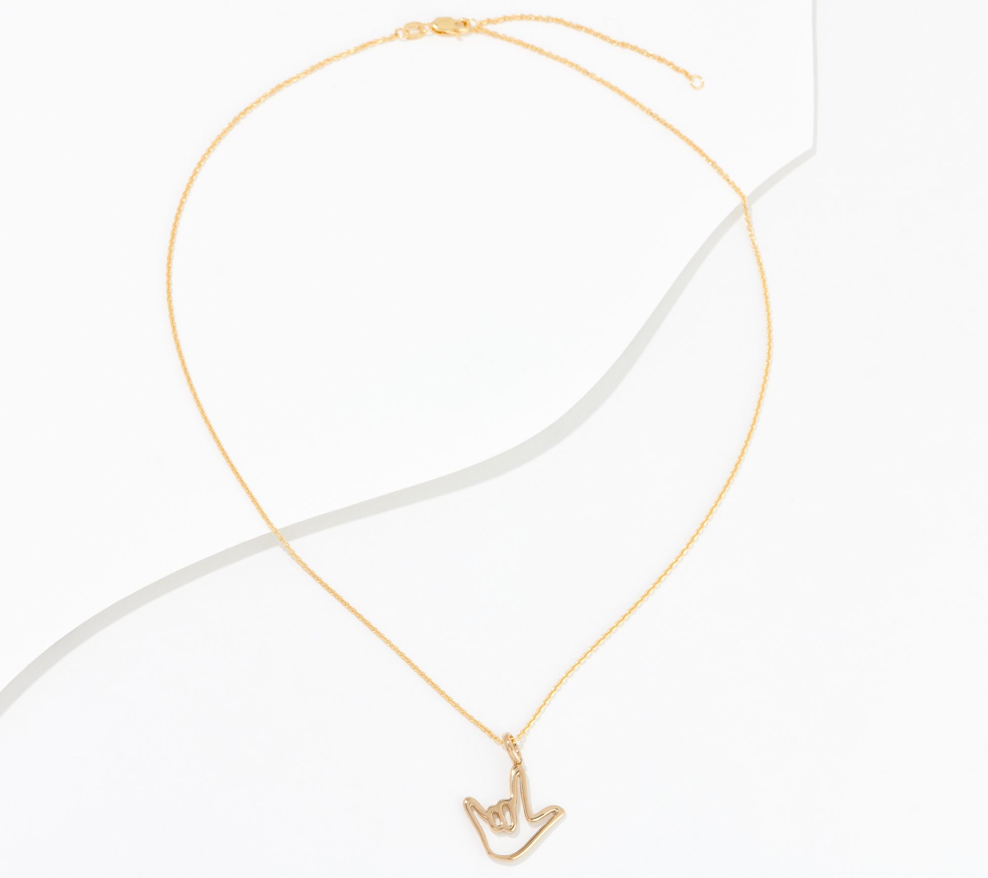 A heartfelt style statement, this pendant necklace expresses "I love you" in American Sign language. The polished hand symbol dangles from a shimmering diamond-cut chain. From RoseBYANDER.