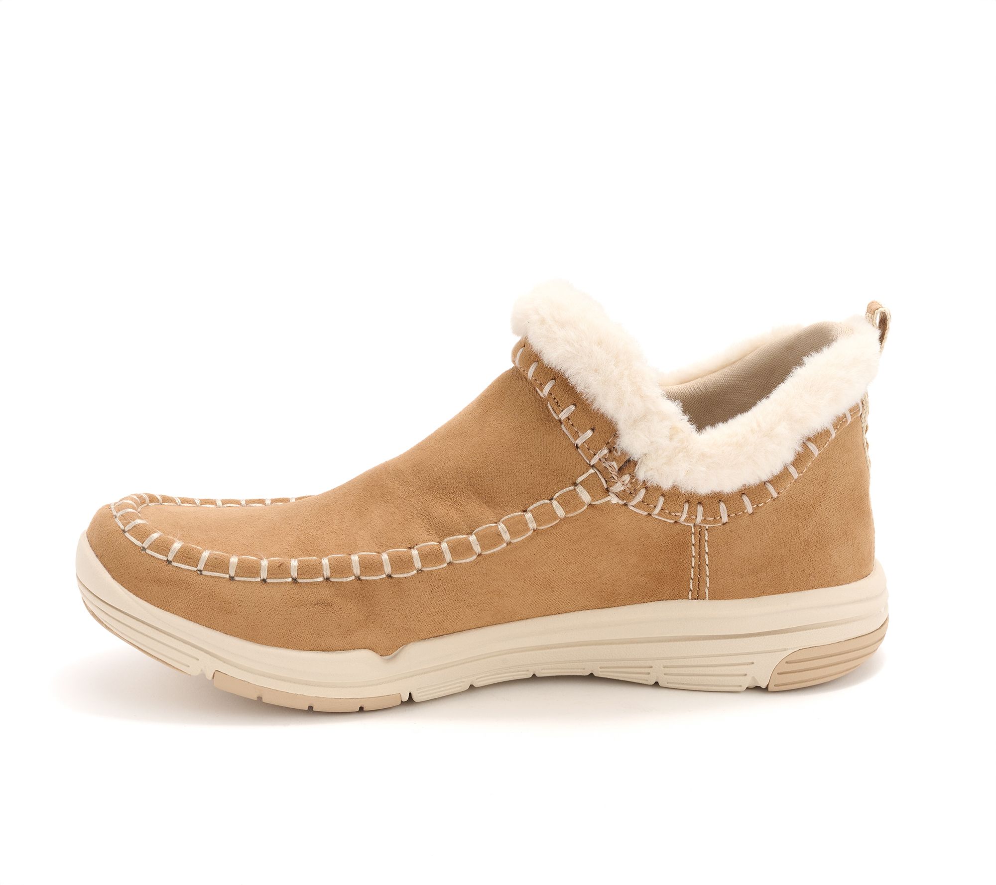 • Water-repellent microfiber upper, moc stitch details, faux-fur collar with webbing, slip-on style, stretch gore