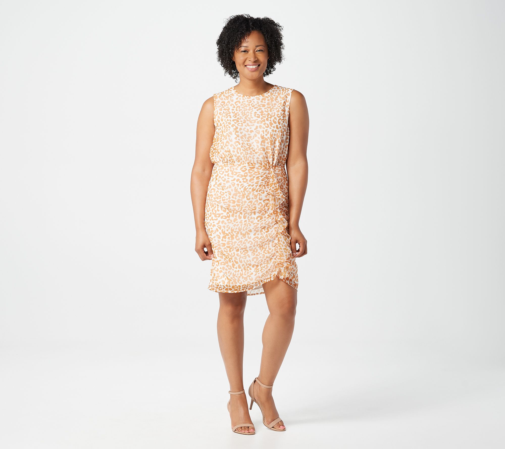 • Features: crew neckline, allover animal print, sleeveless, elastic waist, cascade ruffle detail on side front skirt, button closure at back neckline