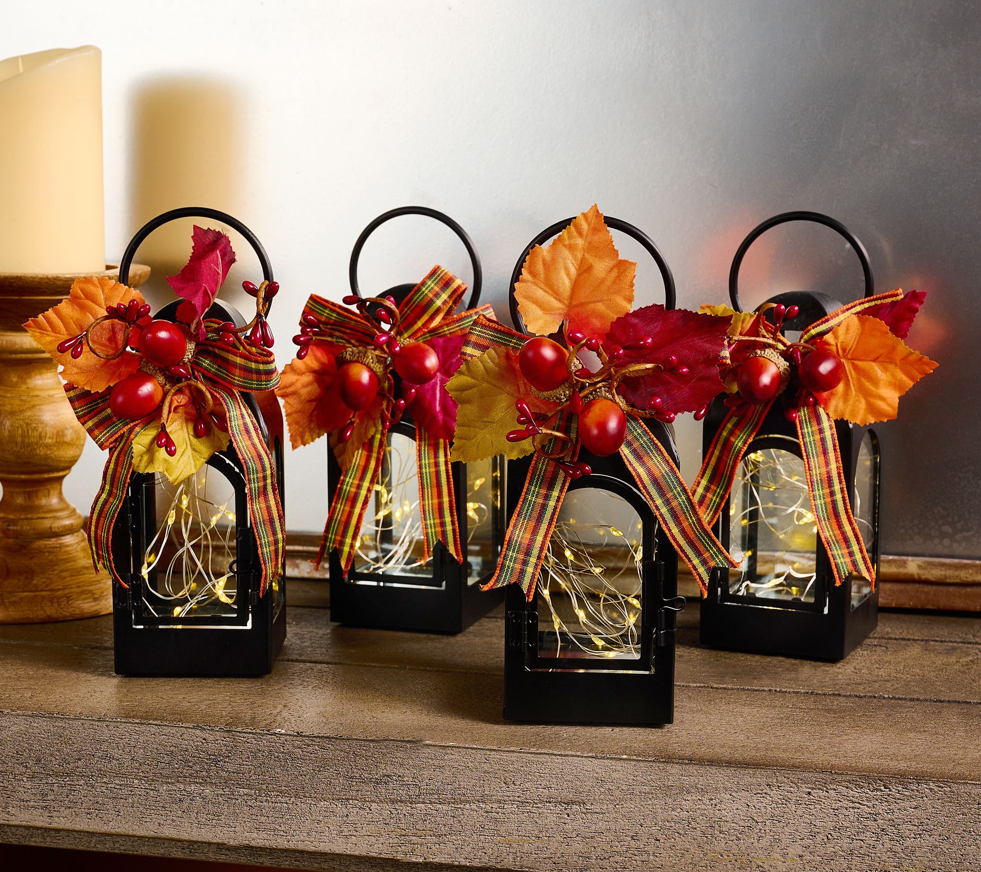 • Includes four fairy light lanterns with removable winter toppers and four bonus harvest toppers