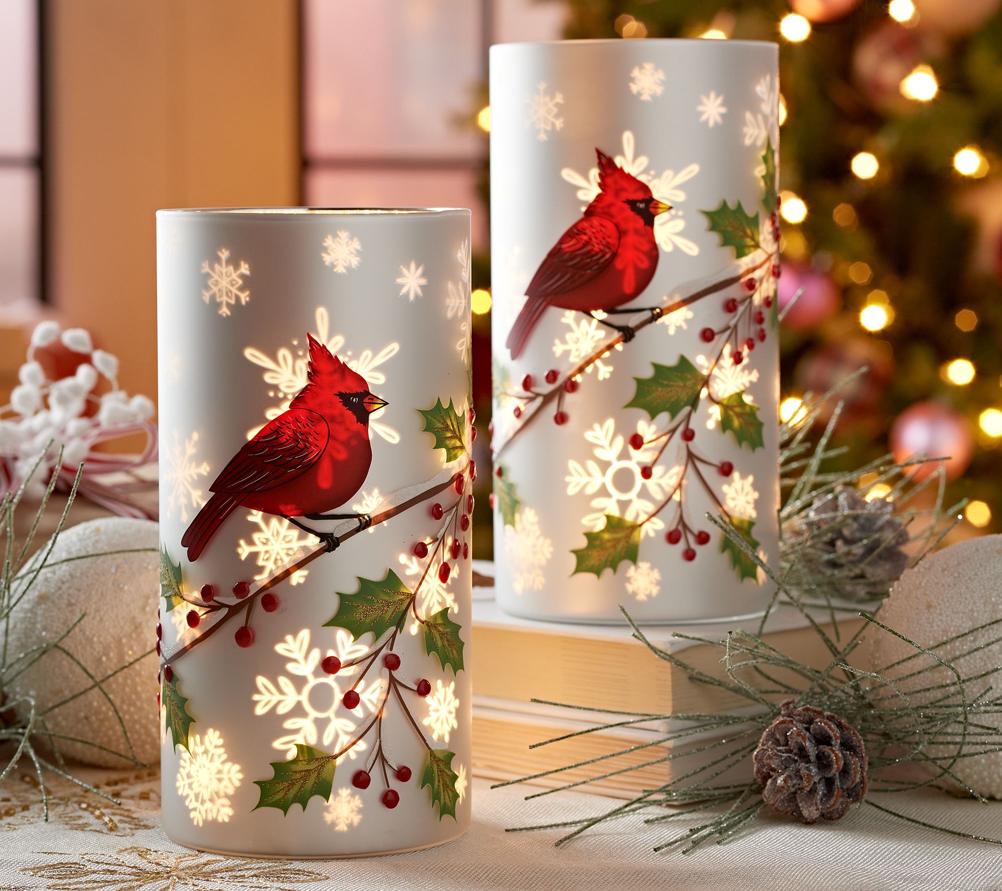 Featuring a frosted finish, etched design, and painted bird scene, these undeniably elegant illuminated hurricanes are essential for haute holiday decor. From the Valerie Parr Hill Collection.