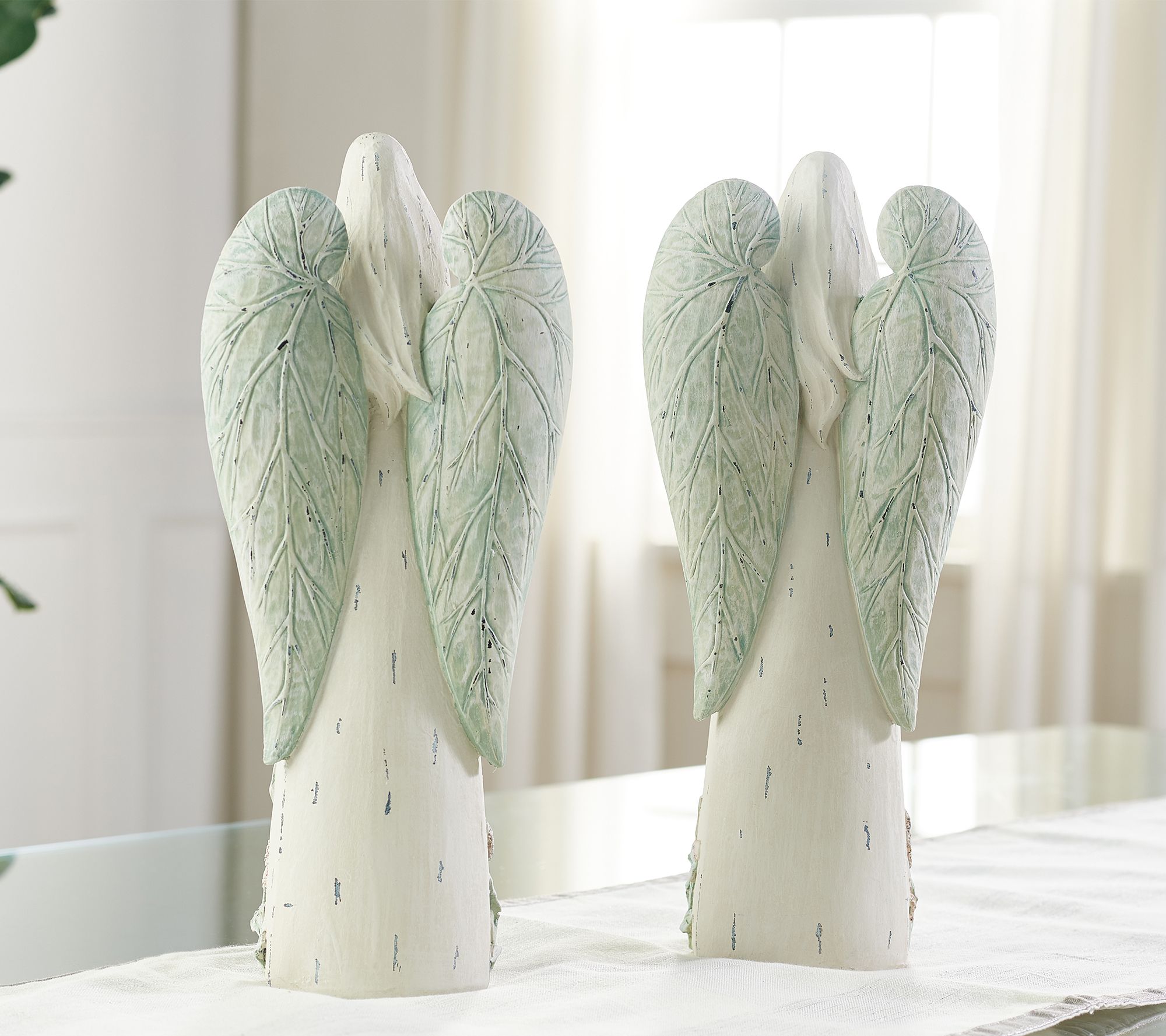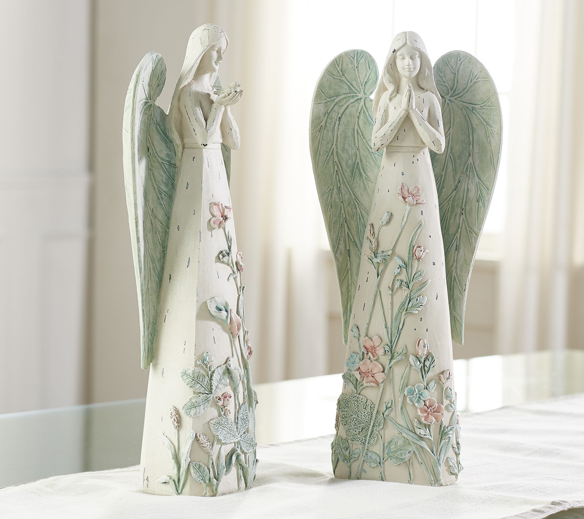 Your prayers for two floral-embossed figures have been answered. This pair of pretty angels are ready to gracefully accent your home. From the Valerie Parr Hill Collection.