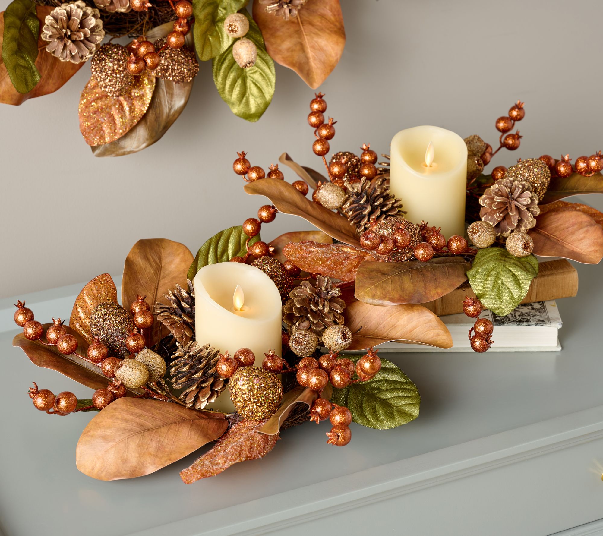 These chic and elegant candle rings feature magnolia leaves, beaded acorns, glittered berries, and pine cones. Display the autumnal hues in your home for a vibrant, upscale look. From the Valerie Parr Hill Collection.