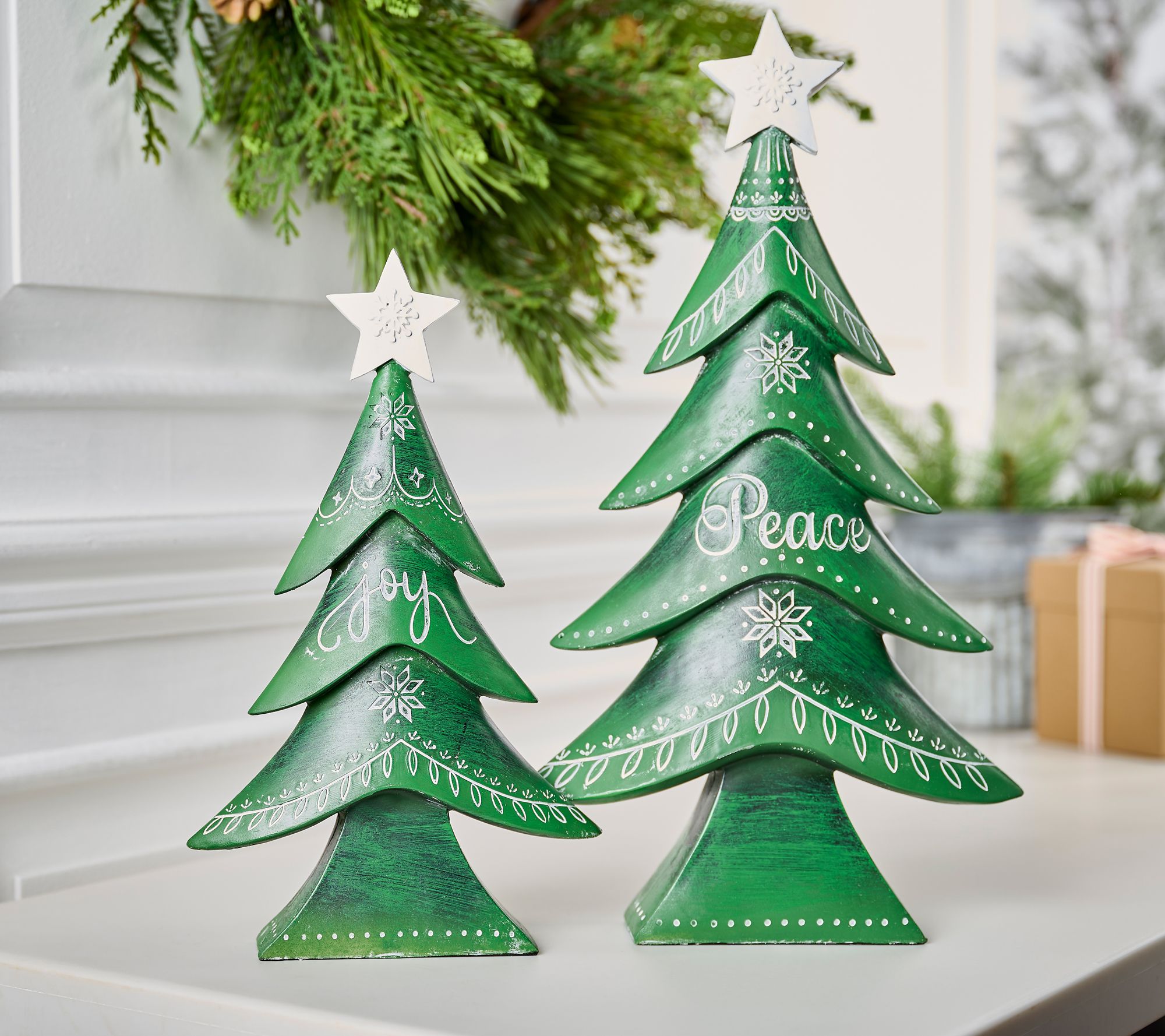 Take a bough. You've just found the perfect festive accents to mix into your seasonal decor with these "Peace" and "Joy" resin trees. From the Valerie Parr Hill Collection.