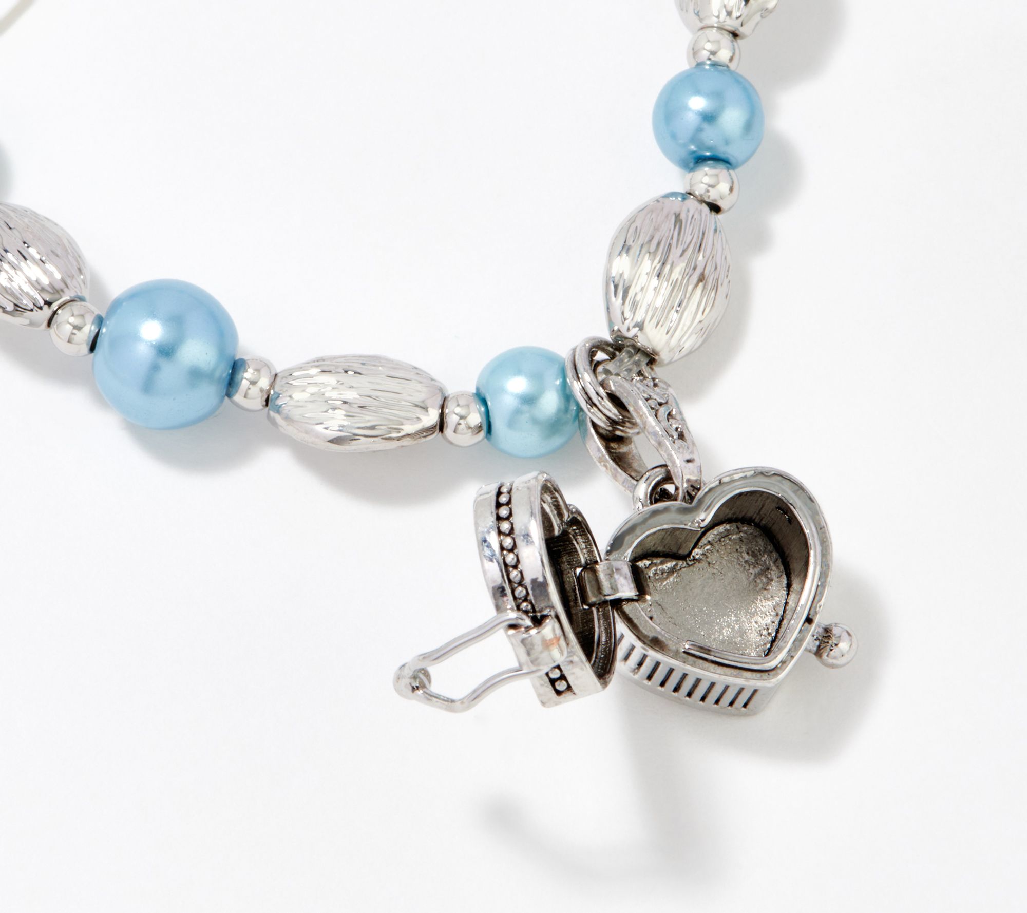 • Stretch style; beads mixed with heart, round, and oblong silvertone spacers; heart-shaped box drop