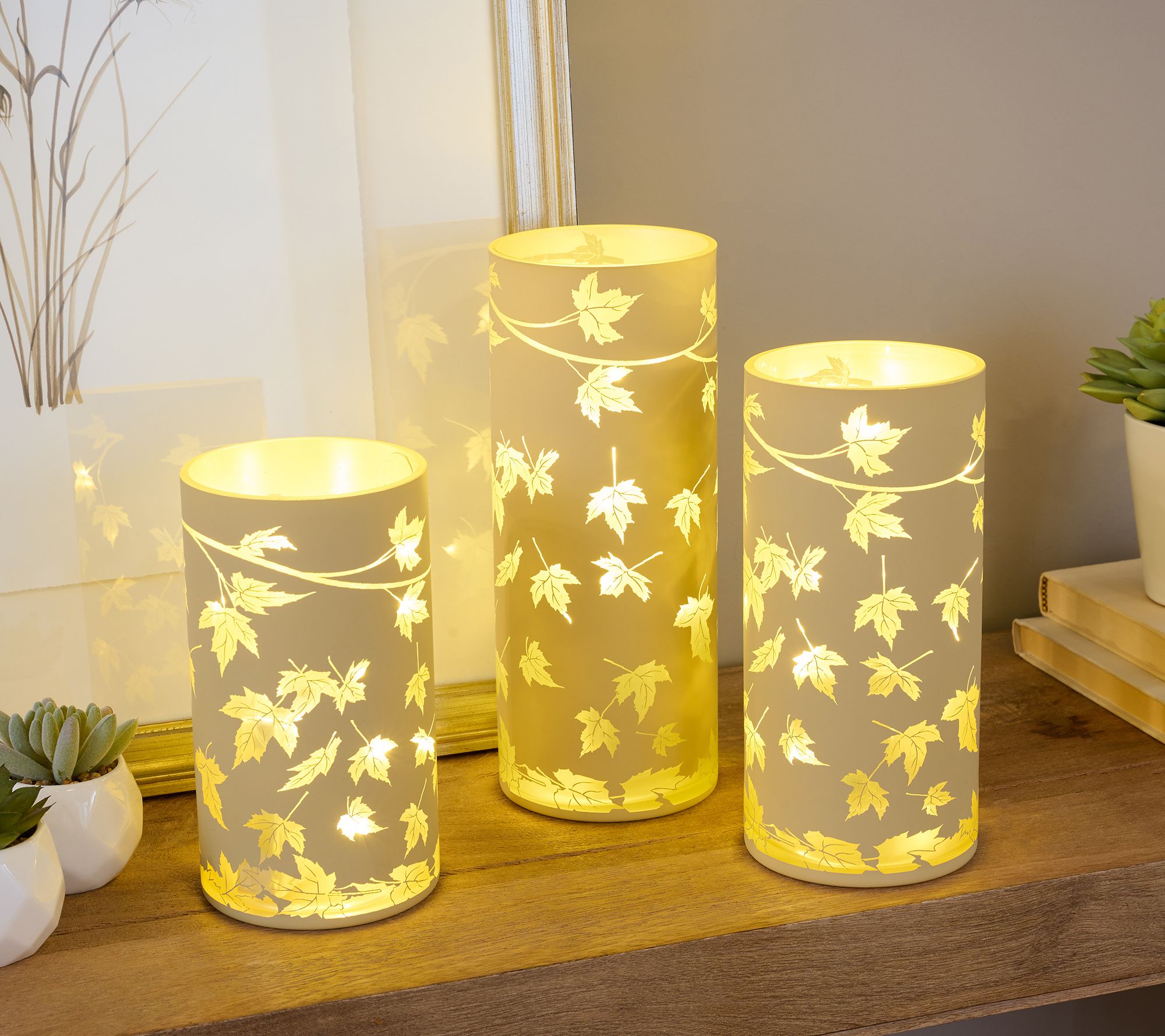 Bring a touch of autumn charm to your home with this set of glass hurricanes Each features a beautifully etched leaf design and a high-shine interior finish, perfect for creating a warm, inviting glow from within. The removable light strands add a magical touch to any setting. Enjoy the cozy ambiance. From the Valerie Parr Hill Collection.