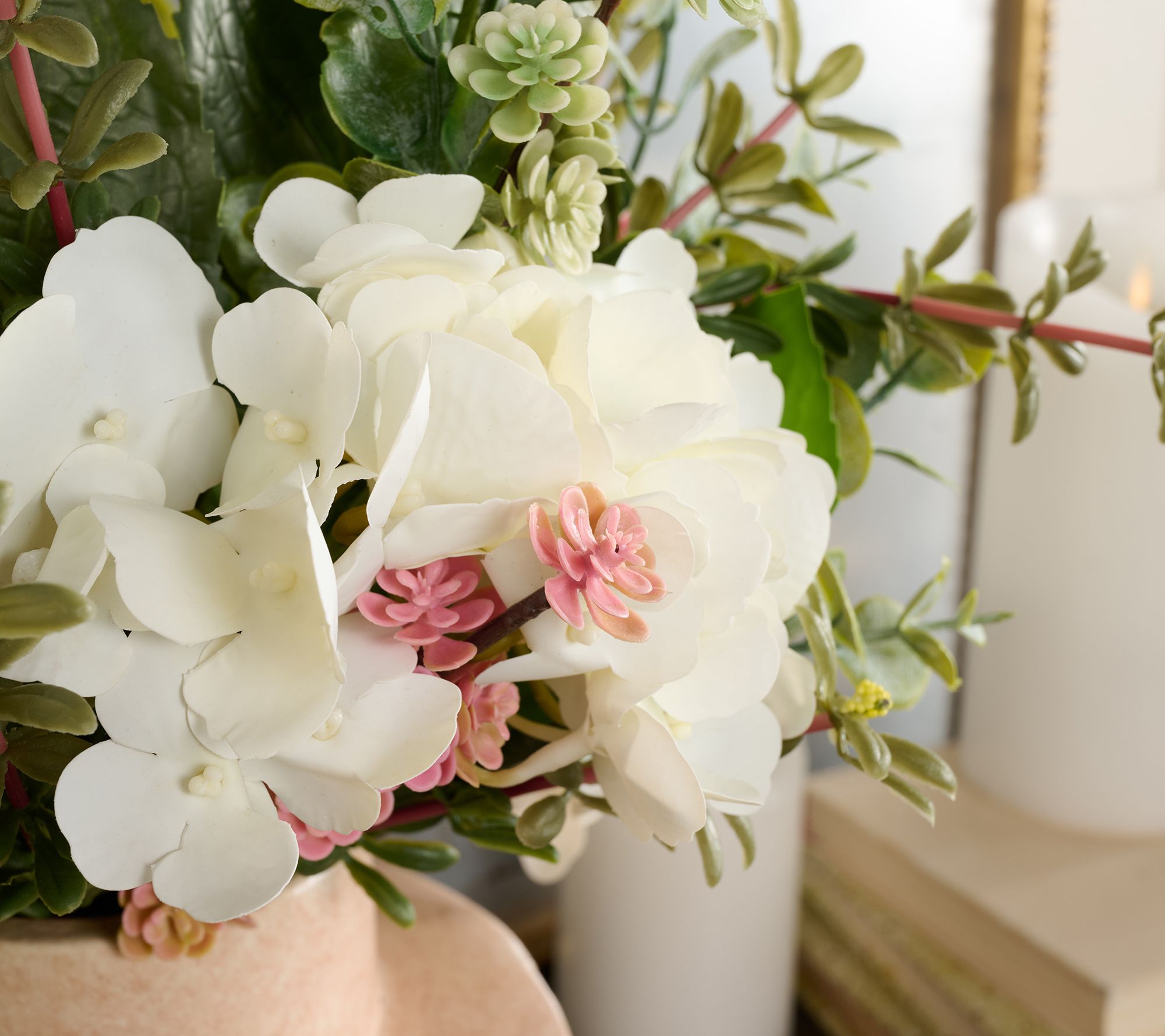 • Features lifelike white hydrangea, eucalyptus, and succulent branches
