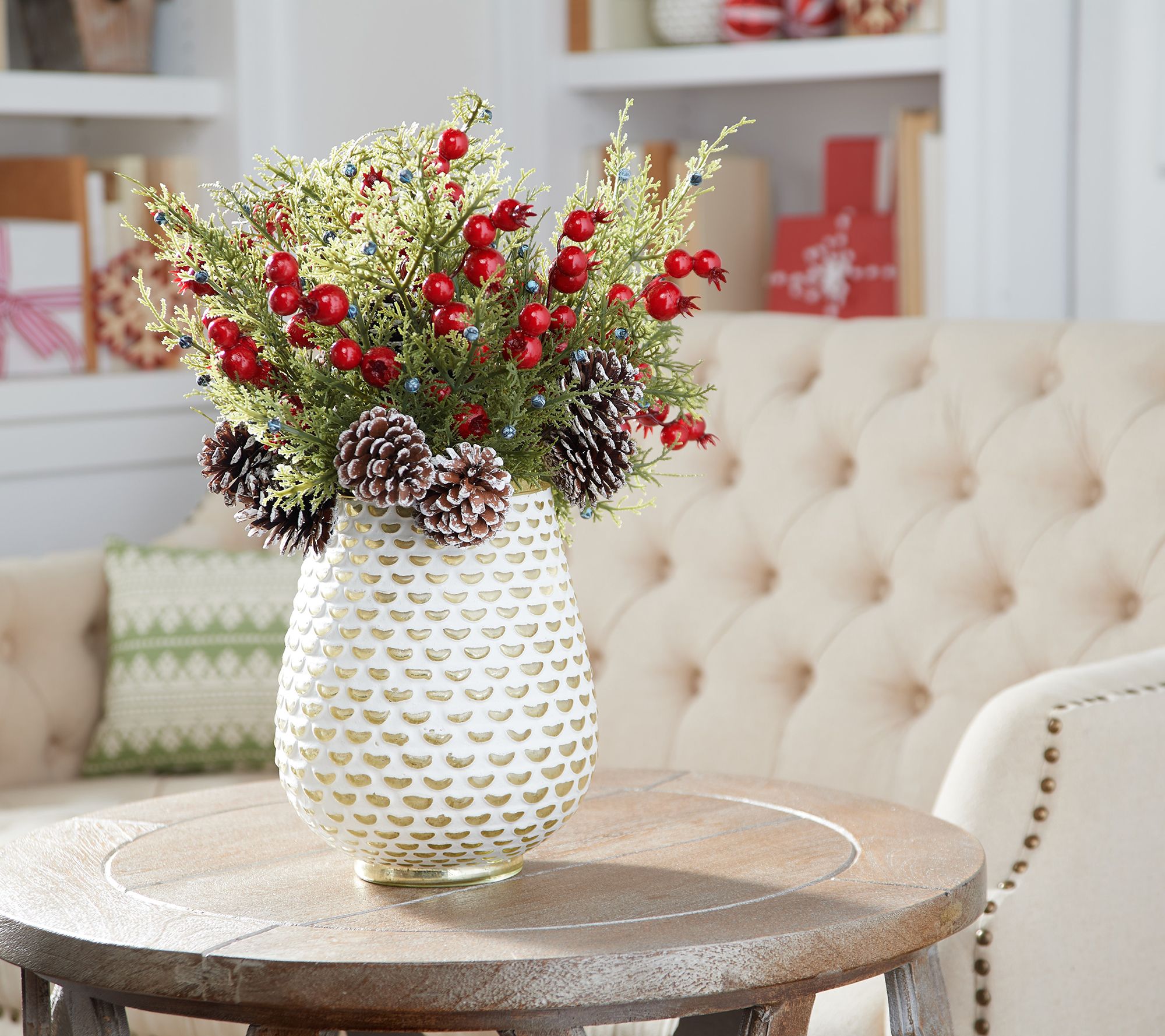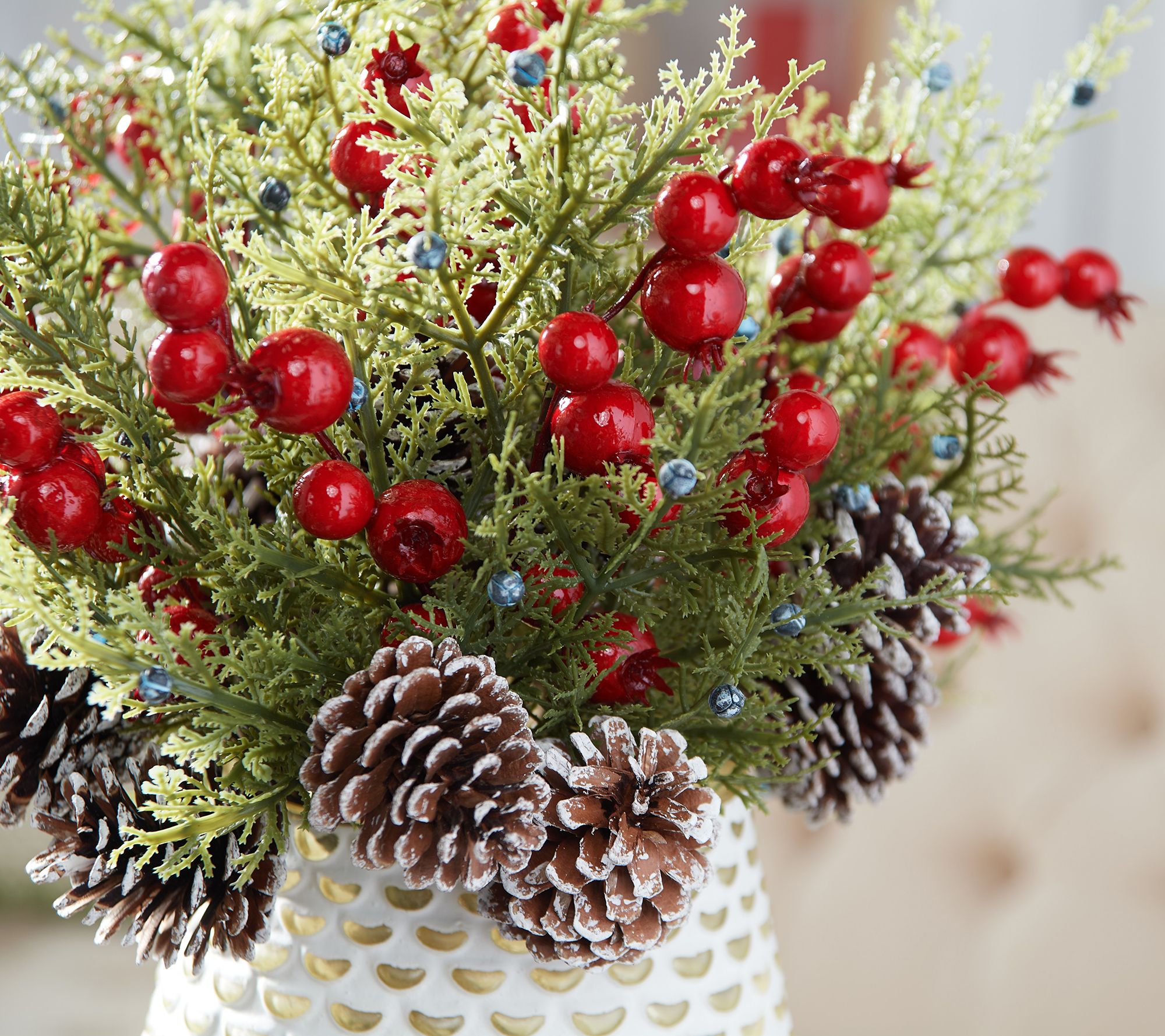 Place these holiday picks in your Christmas tree or make a gorgeous centerpiece for your dining room table -- the juniper branches, red berries, and pine cones make a festive display. From the Valerie Parr Hill Collection.