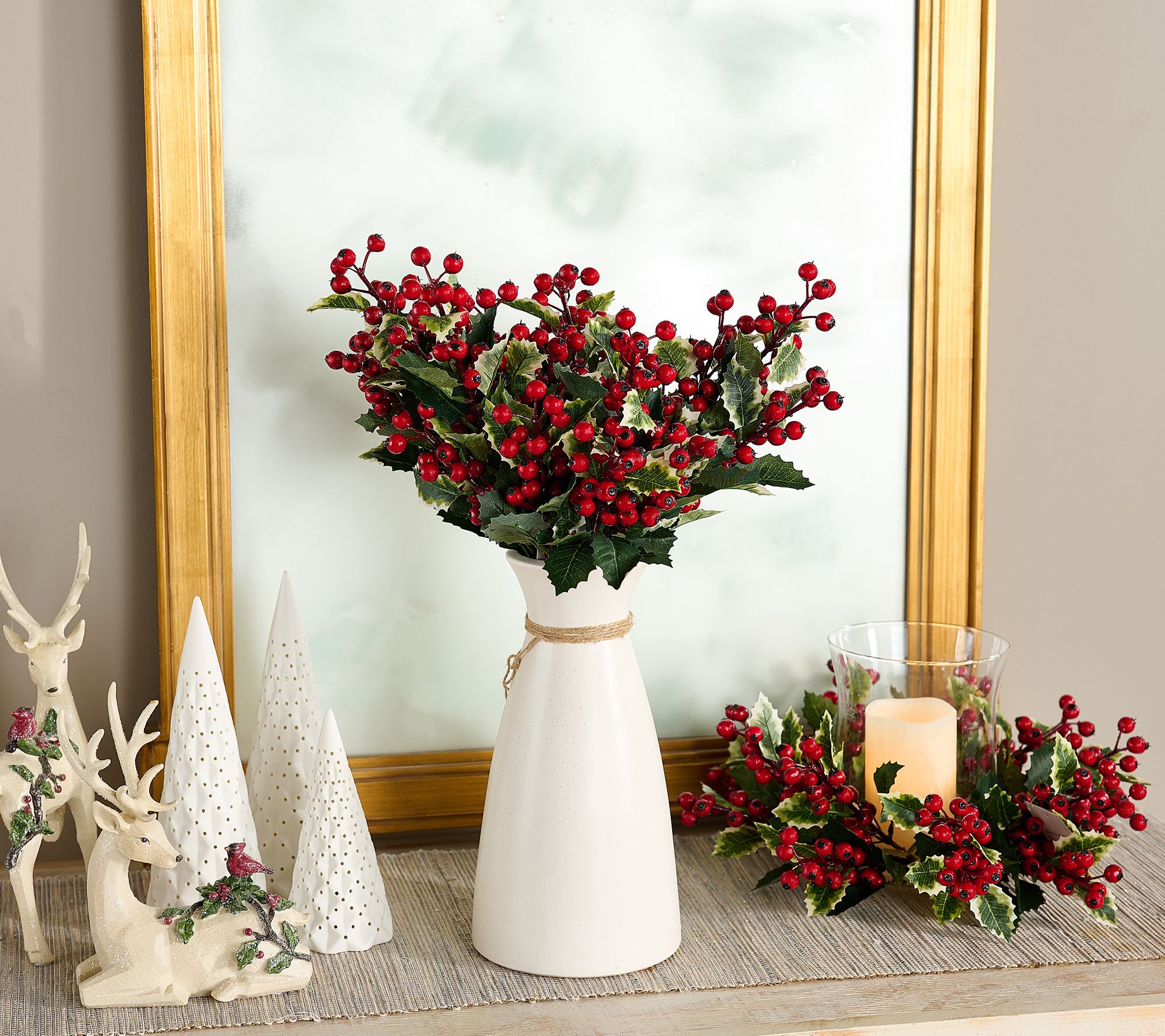 • Variegated lifelike holly leaves and red berries