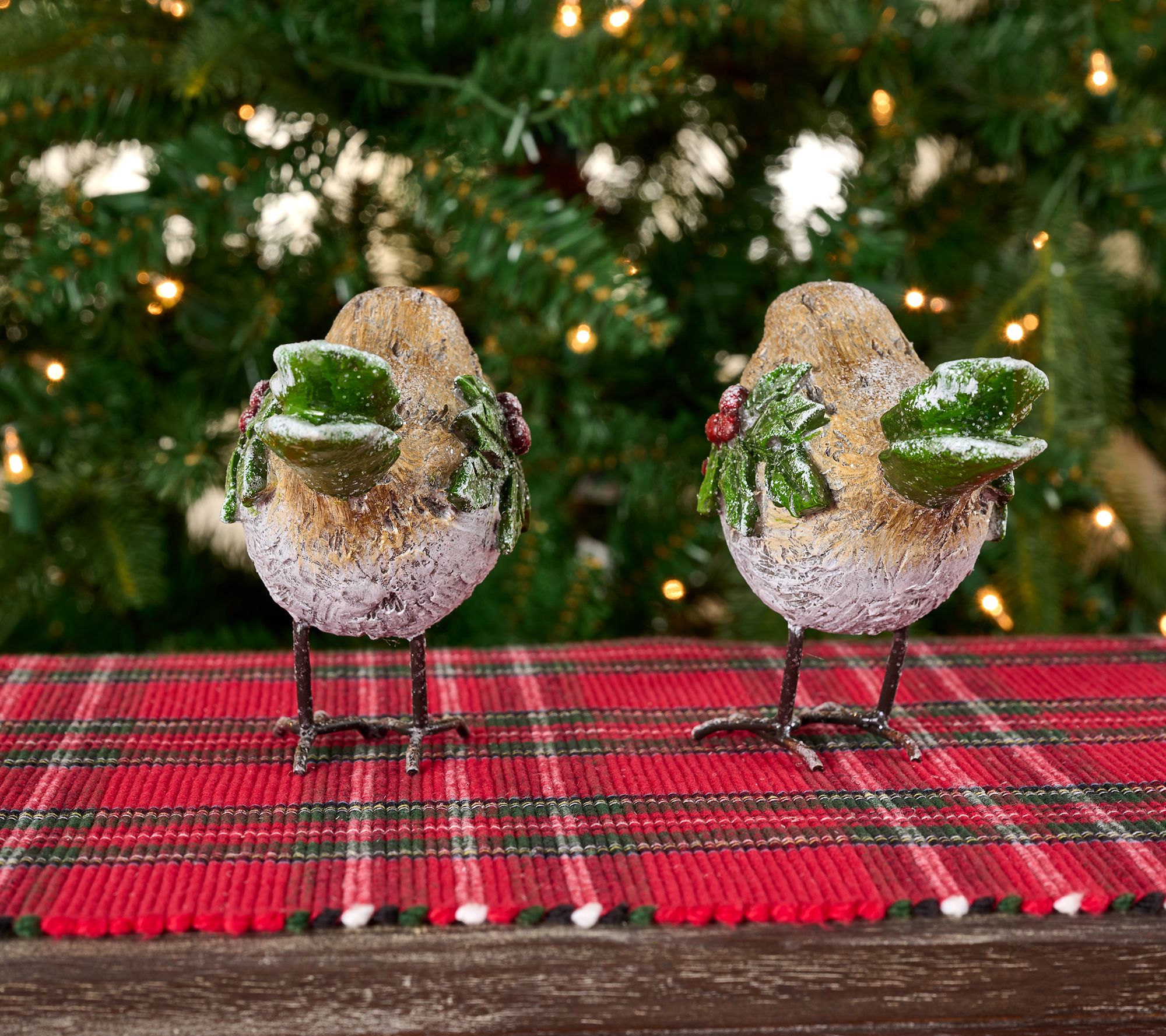 Elevate your holiday decor with this set of bird figurines. Adorned with red berries, embossed holly, and glitter accents, this delightful duo enhances your living space with whimsy and cheer. From the Valerie Parr Hill Collection.