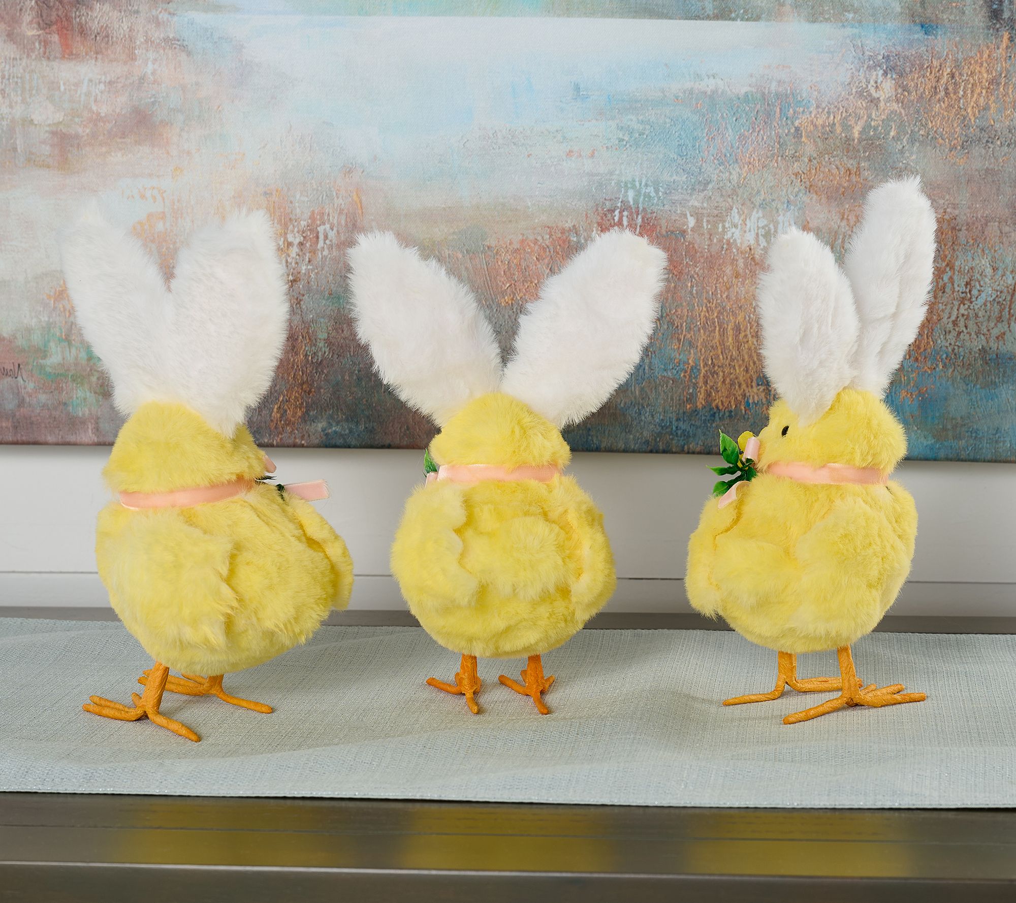 Add a touch of whimsy to your springtime celebrations with this set of three fuzzy chicks, each decked out in pink and white checked bunny ears and delicate floral neck garlands. Whether perched along a centerpiece or nestled on a windowsill, their soft fur and playful poses bring cheerful charm to your holiday decor. From the Valerie Parr Hill Collection.