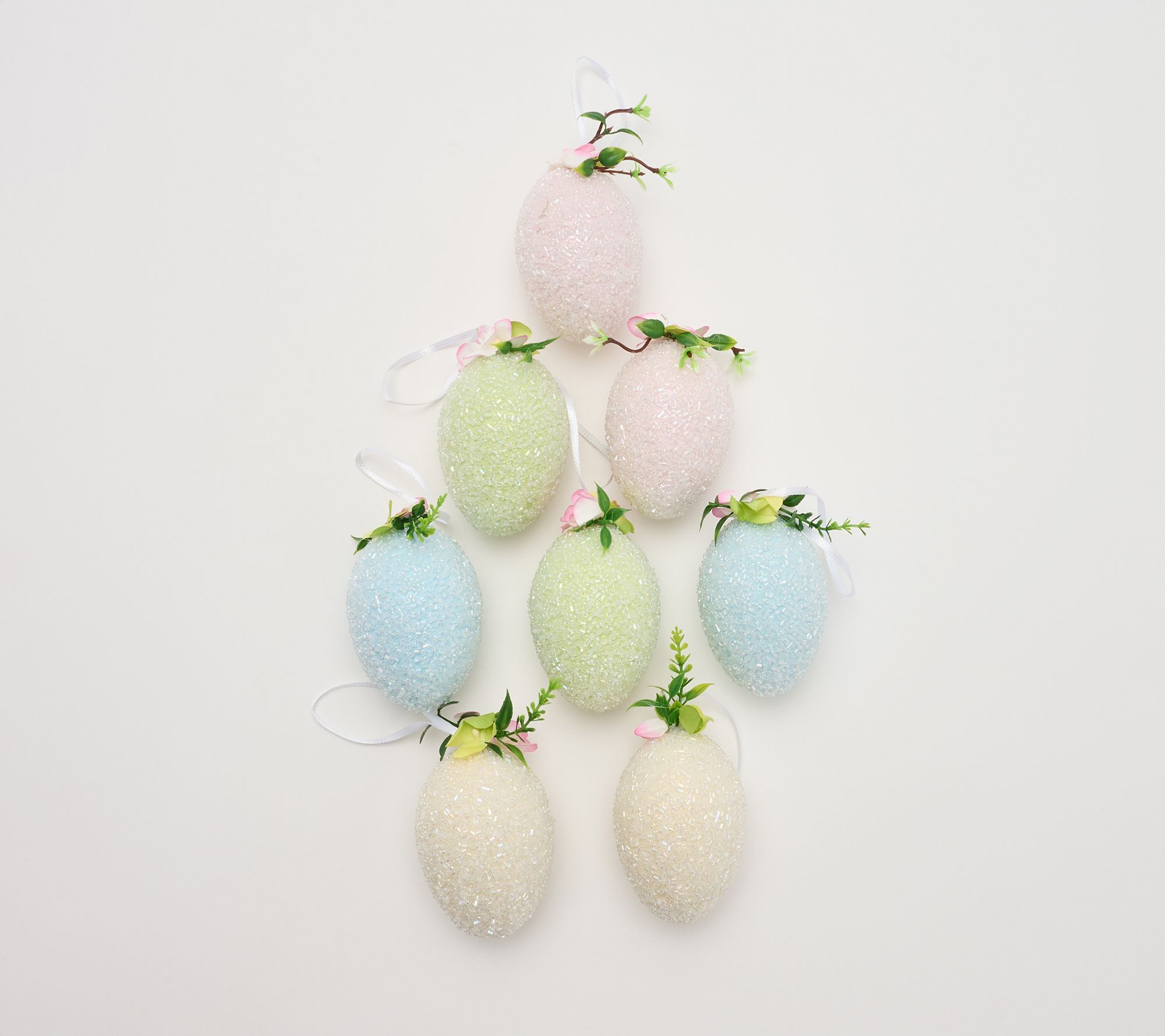 Bring a touch of sparkle and color to your spring gatherings with this set of eight beaded eggs, each finished with delicate floral accents and a ribbon loop for hanging. Cluster them in a favorite basket or hang them on decorative branches to create a cheerful seasonal display that guests will admire. From the Valerie Parr Hill Collection.