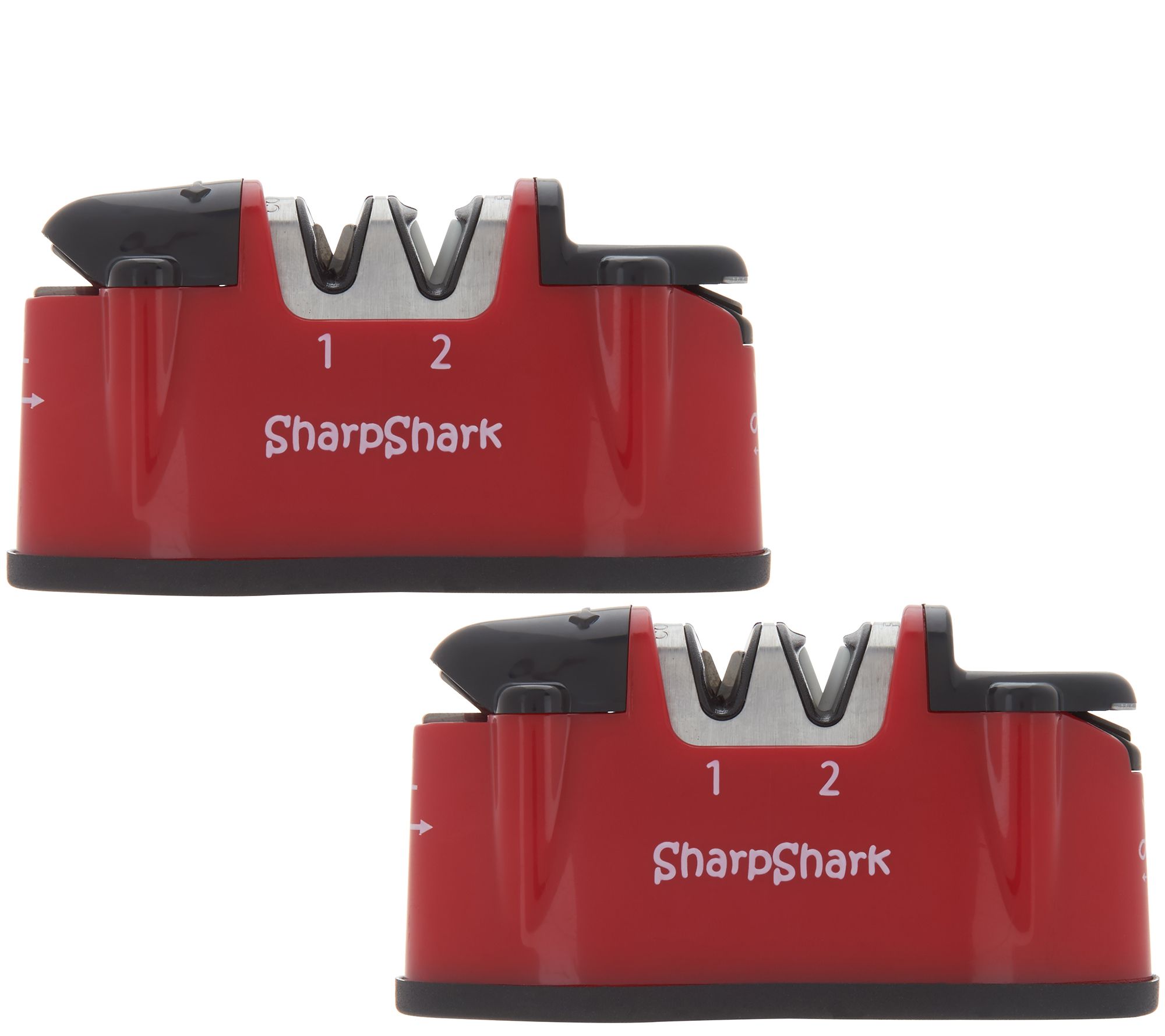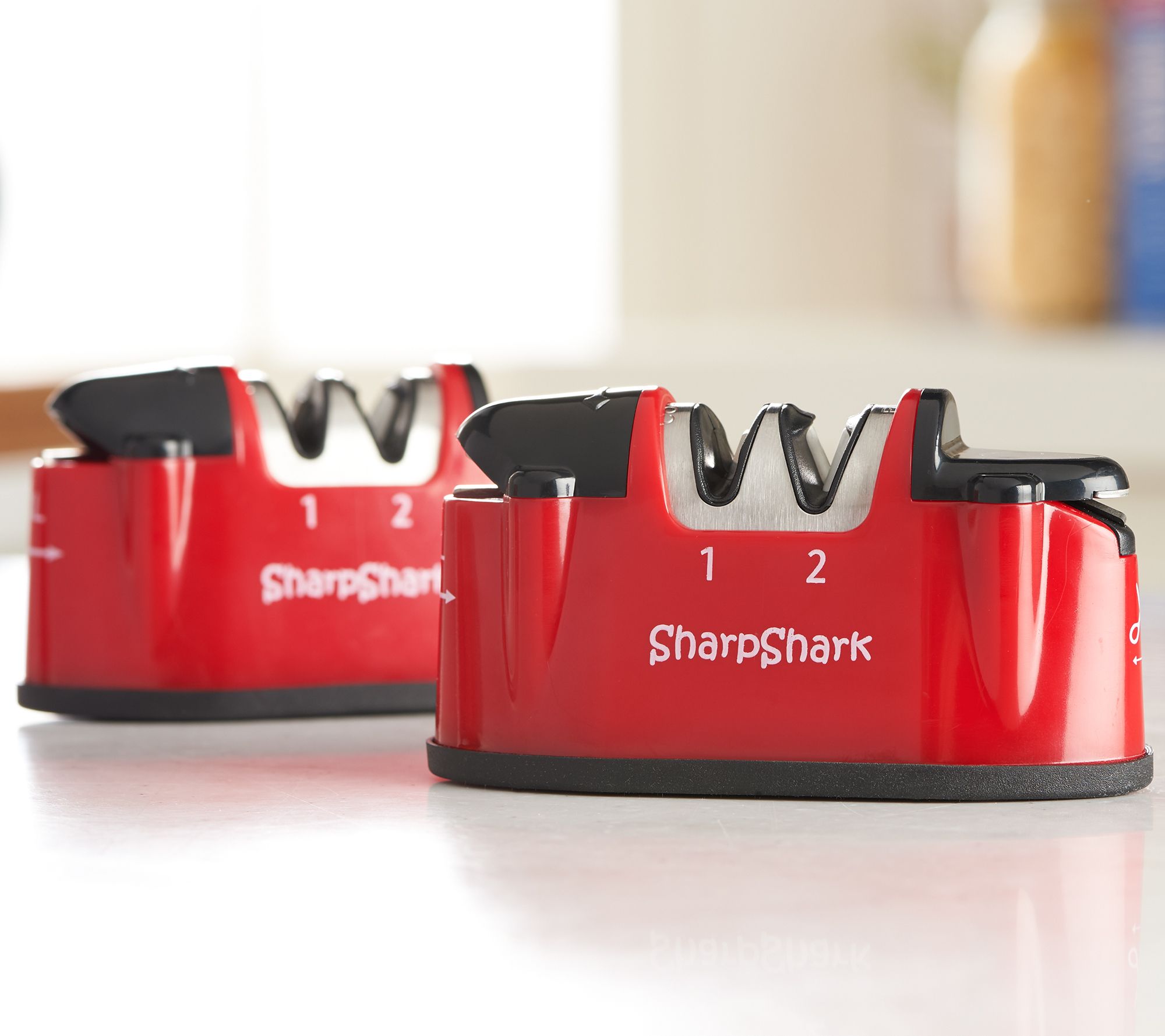 No more squashed tomatoes and ragged bread--sharpen up those knives instead! This Sharp Shark set of two deluxe knife and scissor sharpeners take a bite out of your kitchen prep by providing a an easy way to keep your busiest kitchen tools razor sharp and ready for action. From Sharp Shark.