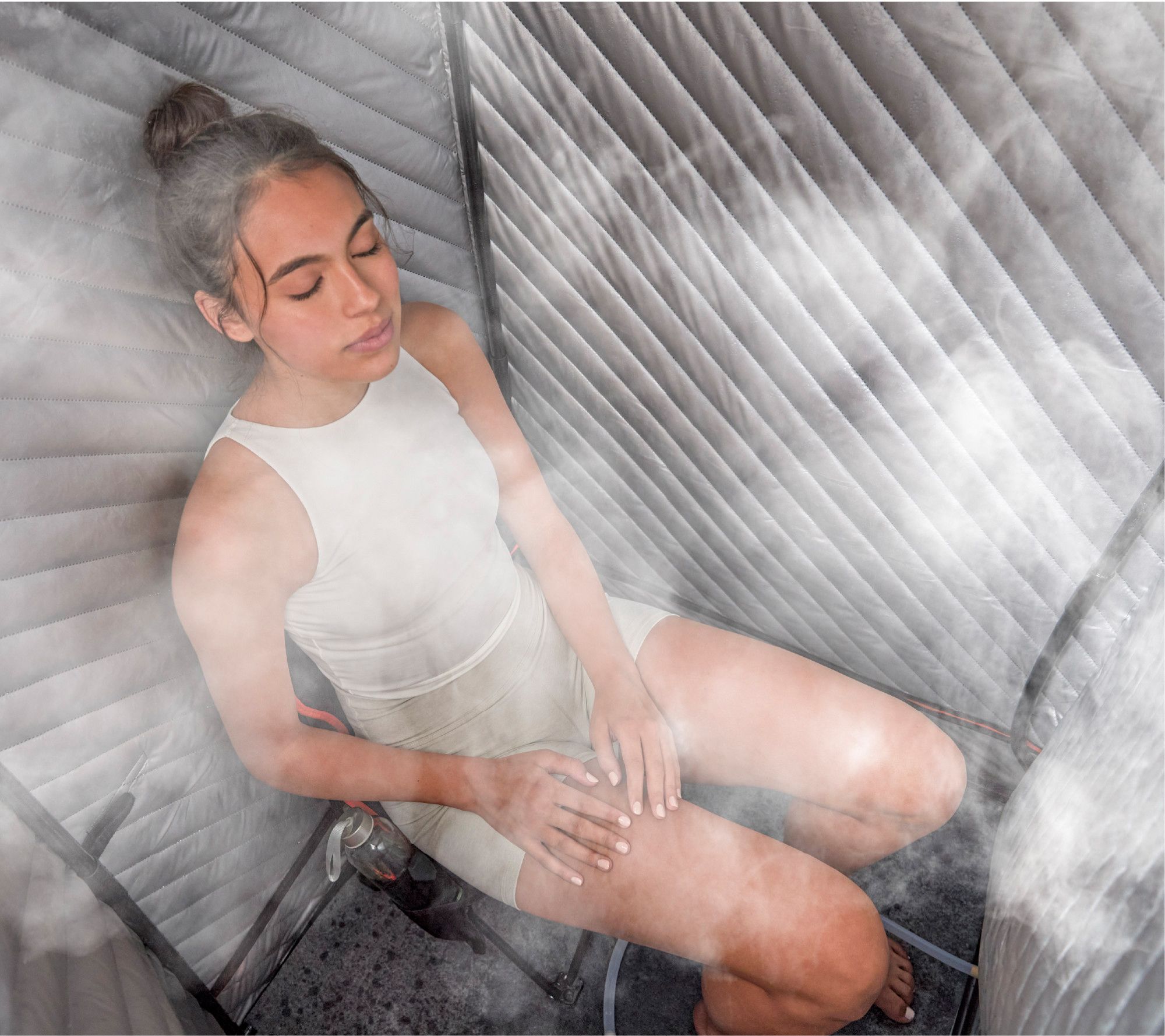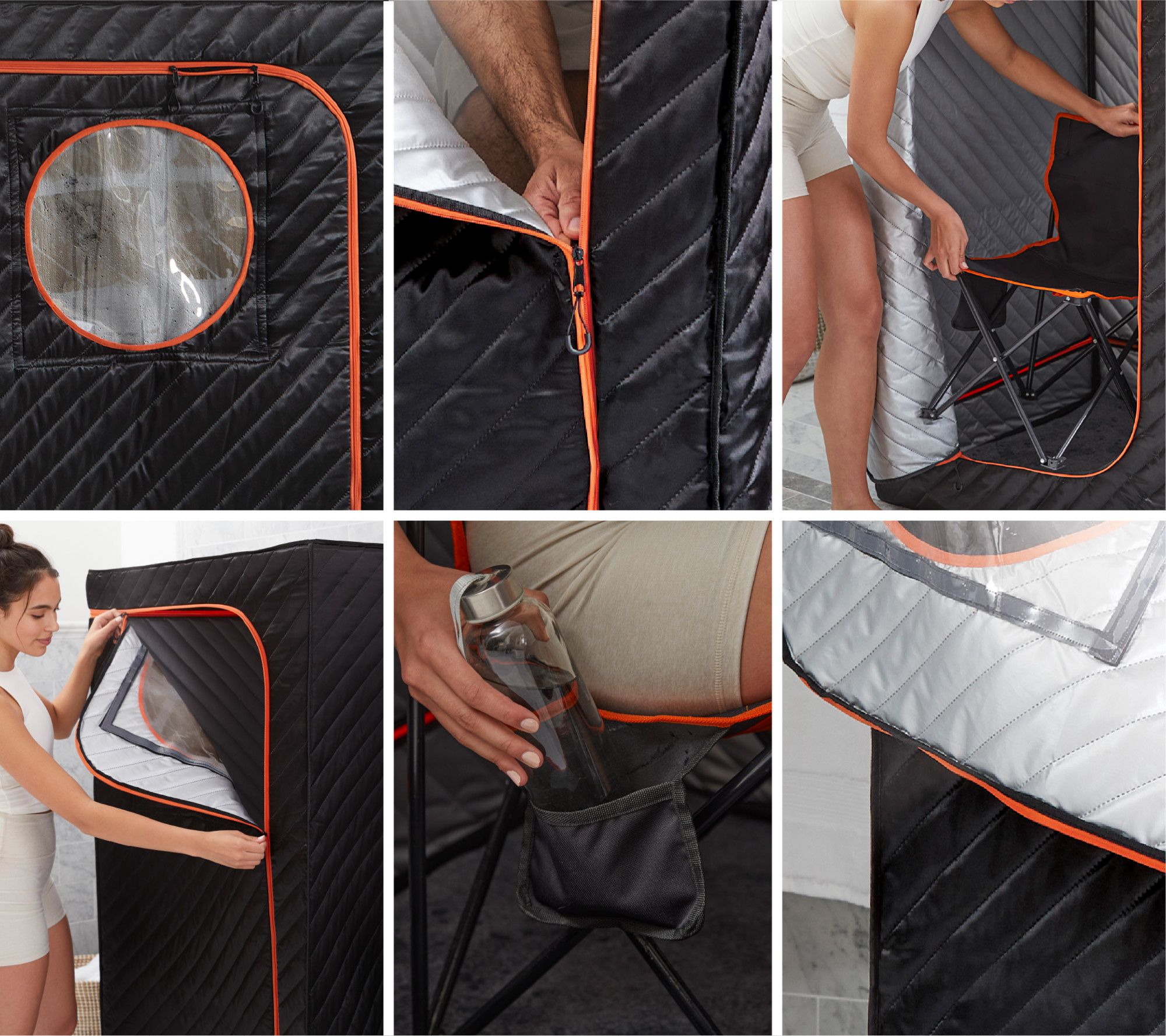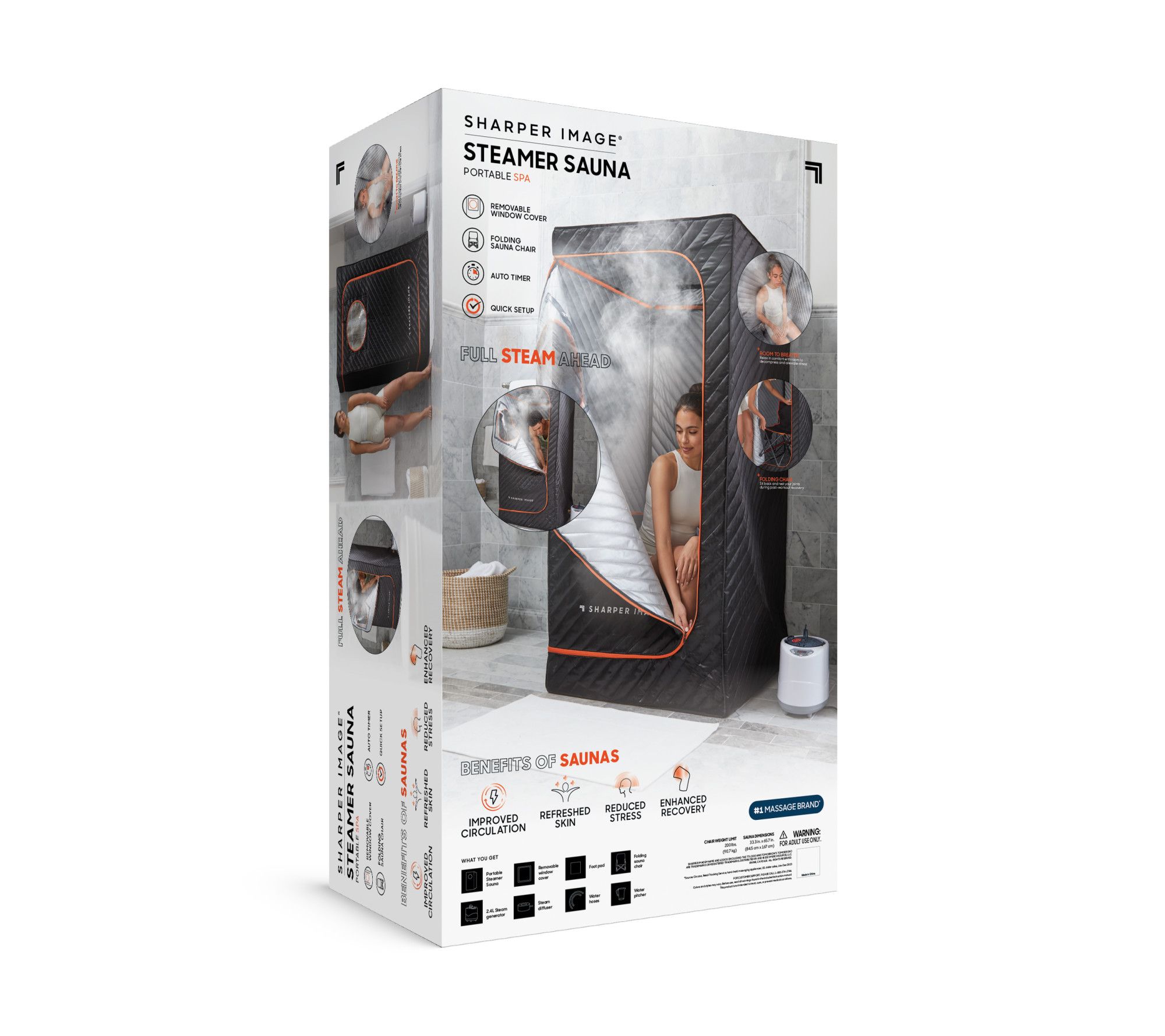 • Includes sauna with removable window, 2.4L steam generator and diffuser, folding chair, foot pad, water hoses, and water pitcher