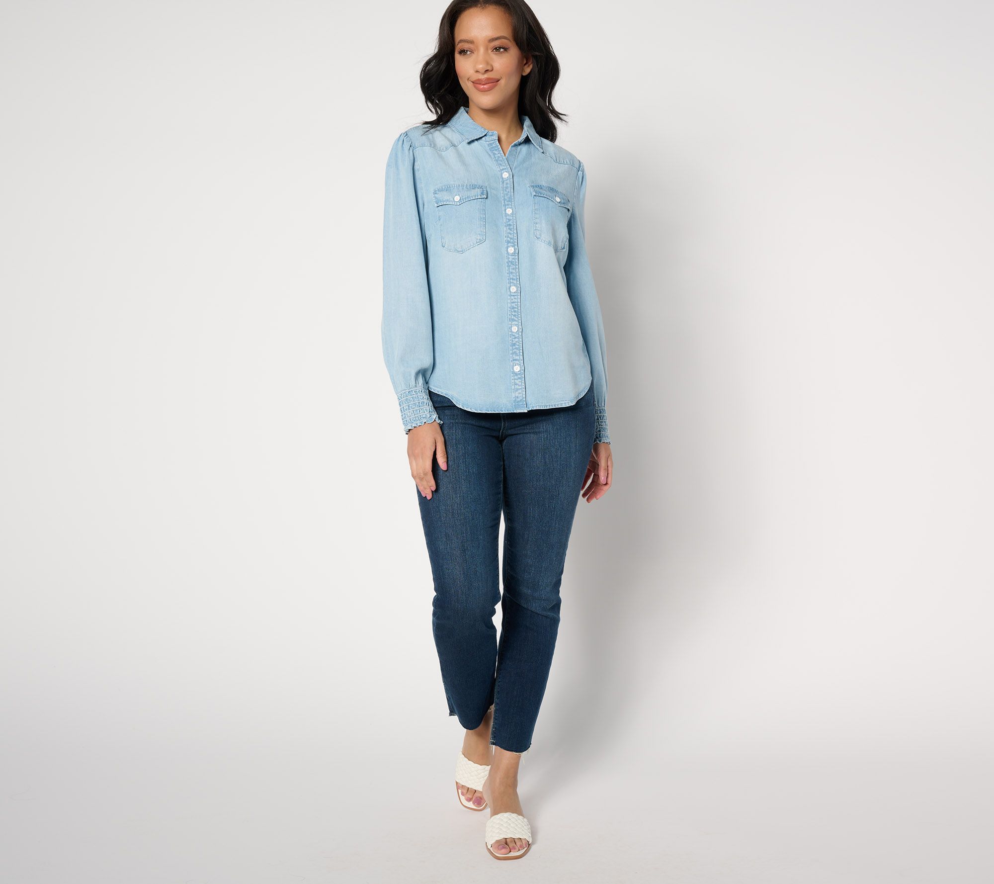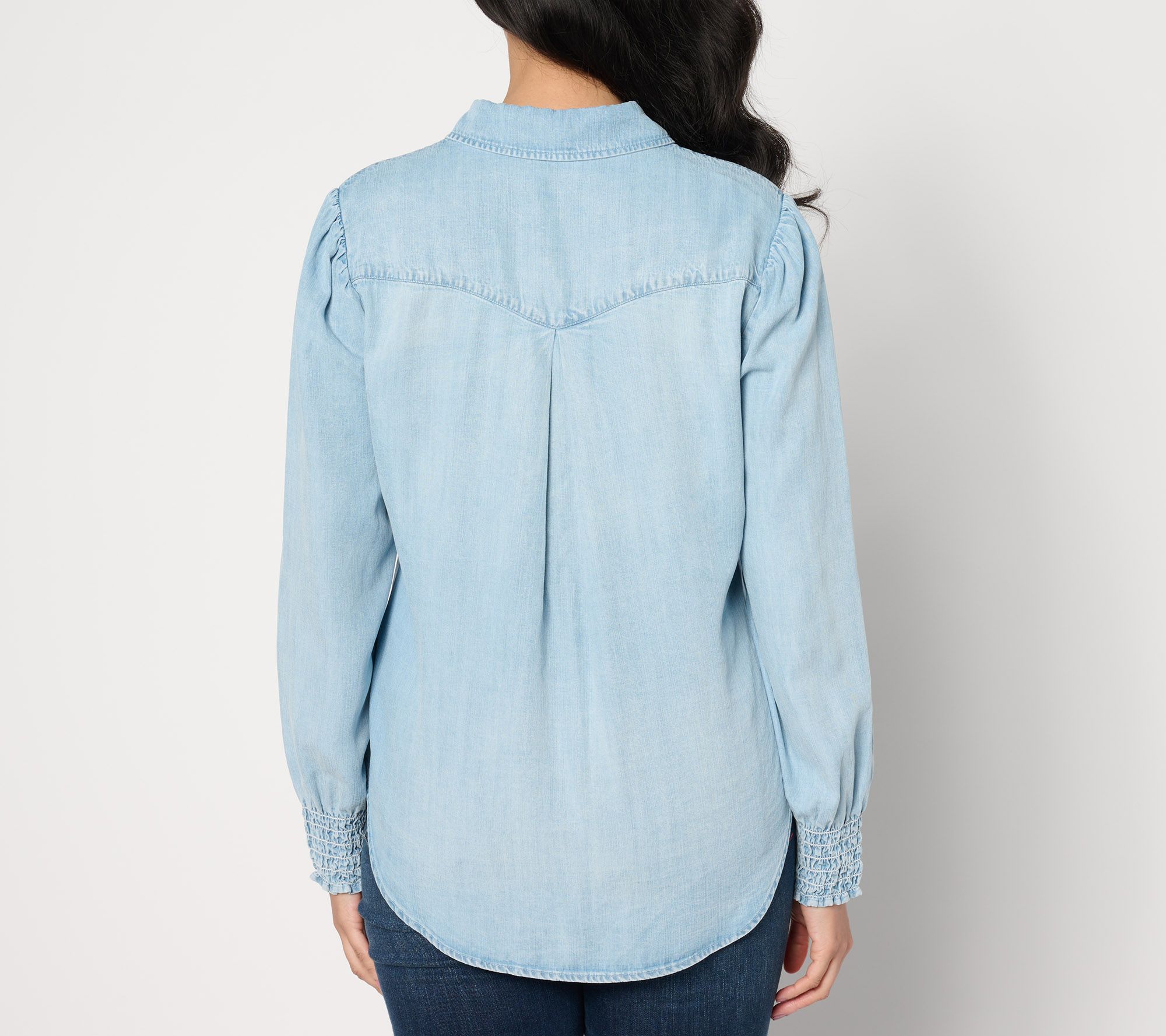 • Features: long gathered sleeves, button-front closure, blousy shoulder details, button flap pockets