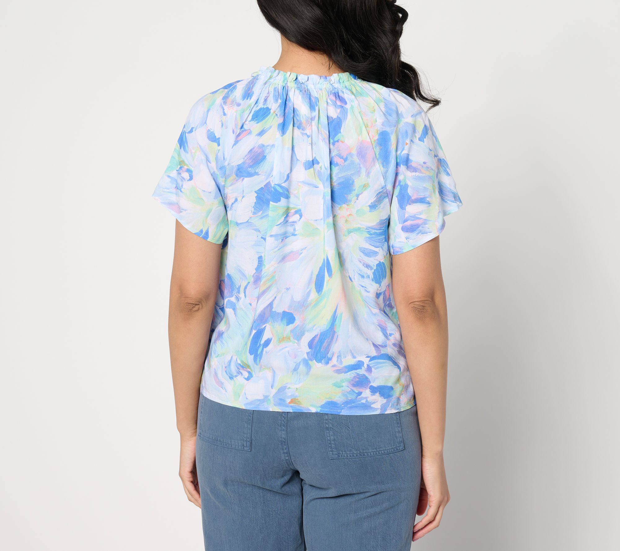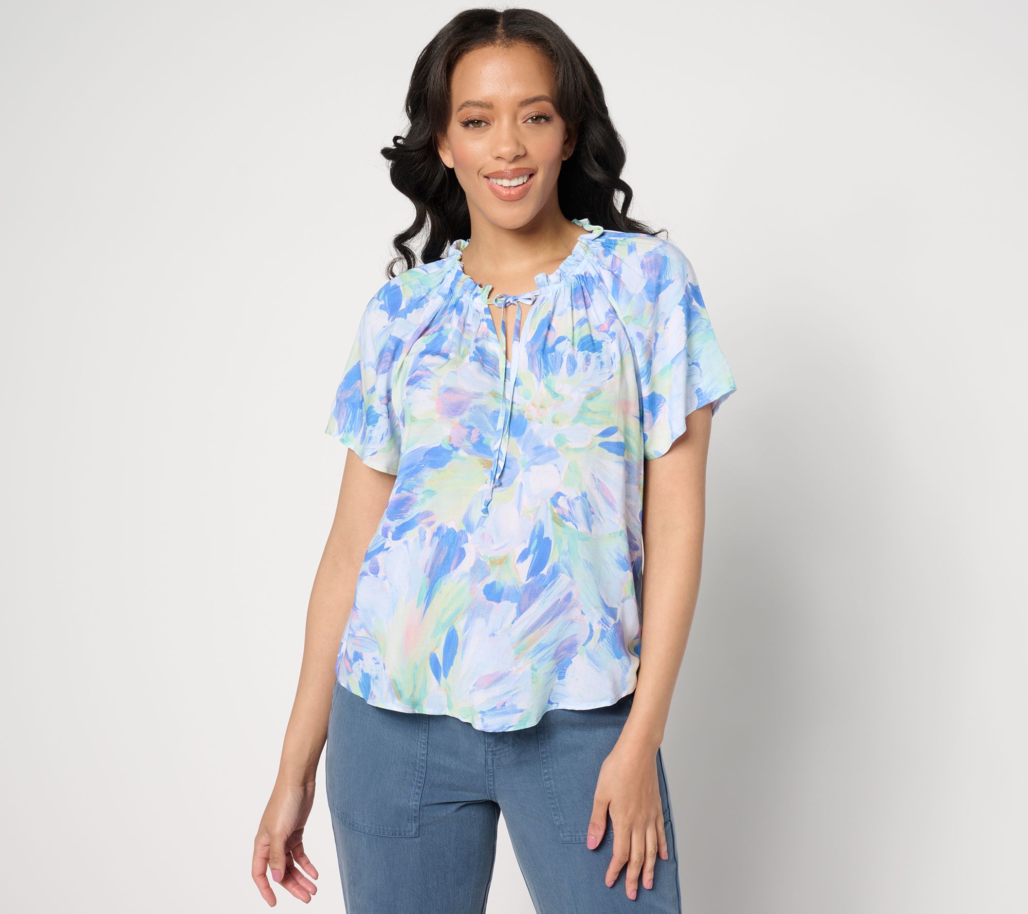 • Features: allover print, ruffled elastic V-neckline, raglan short sleeves, flowy details