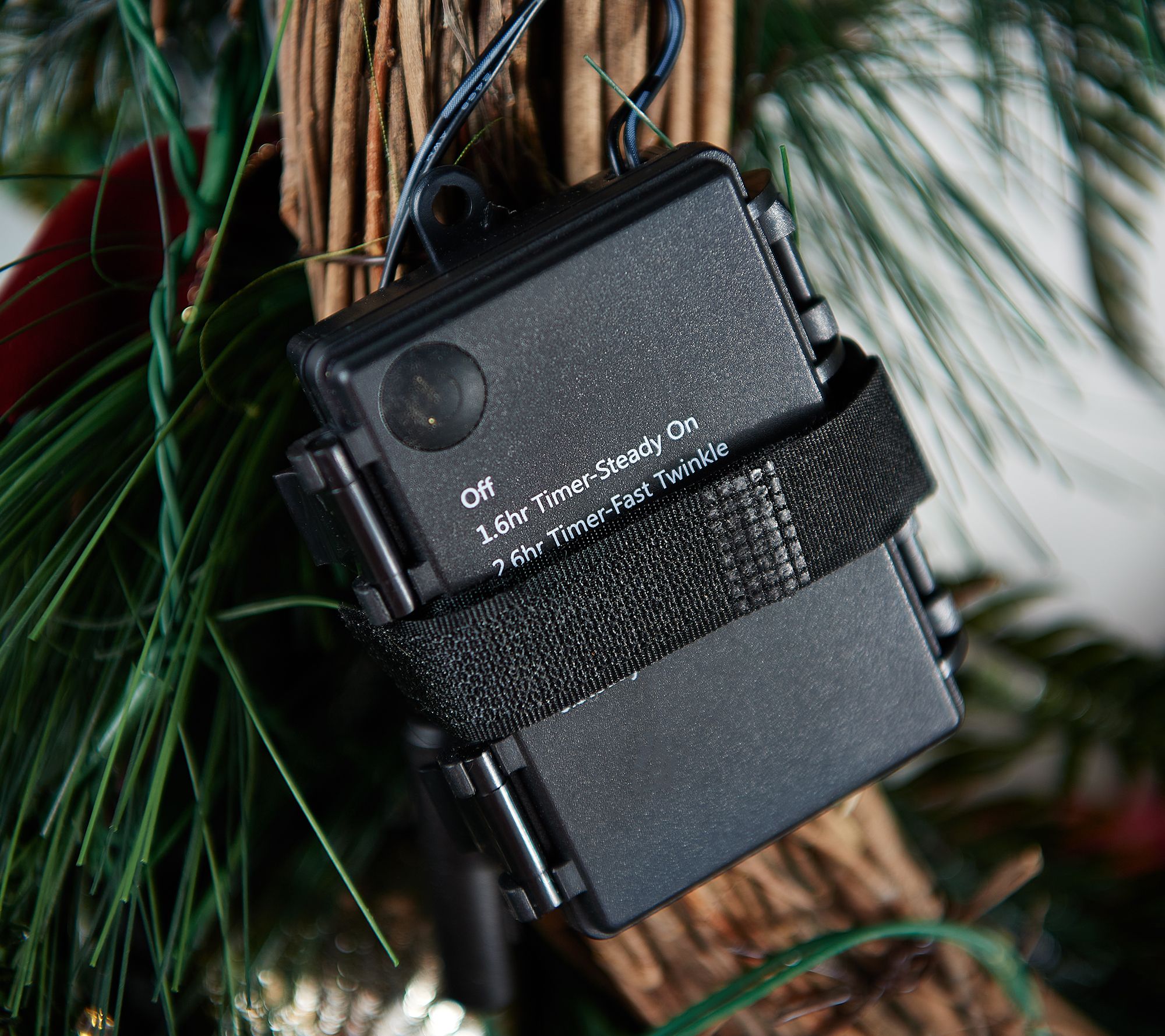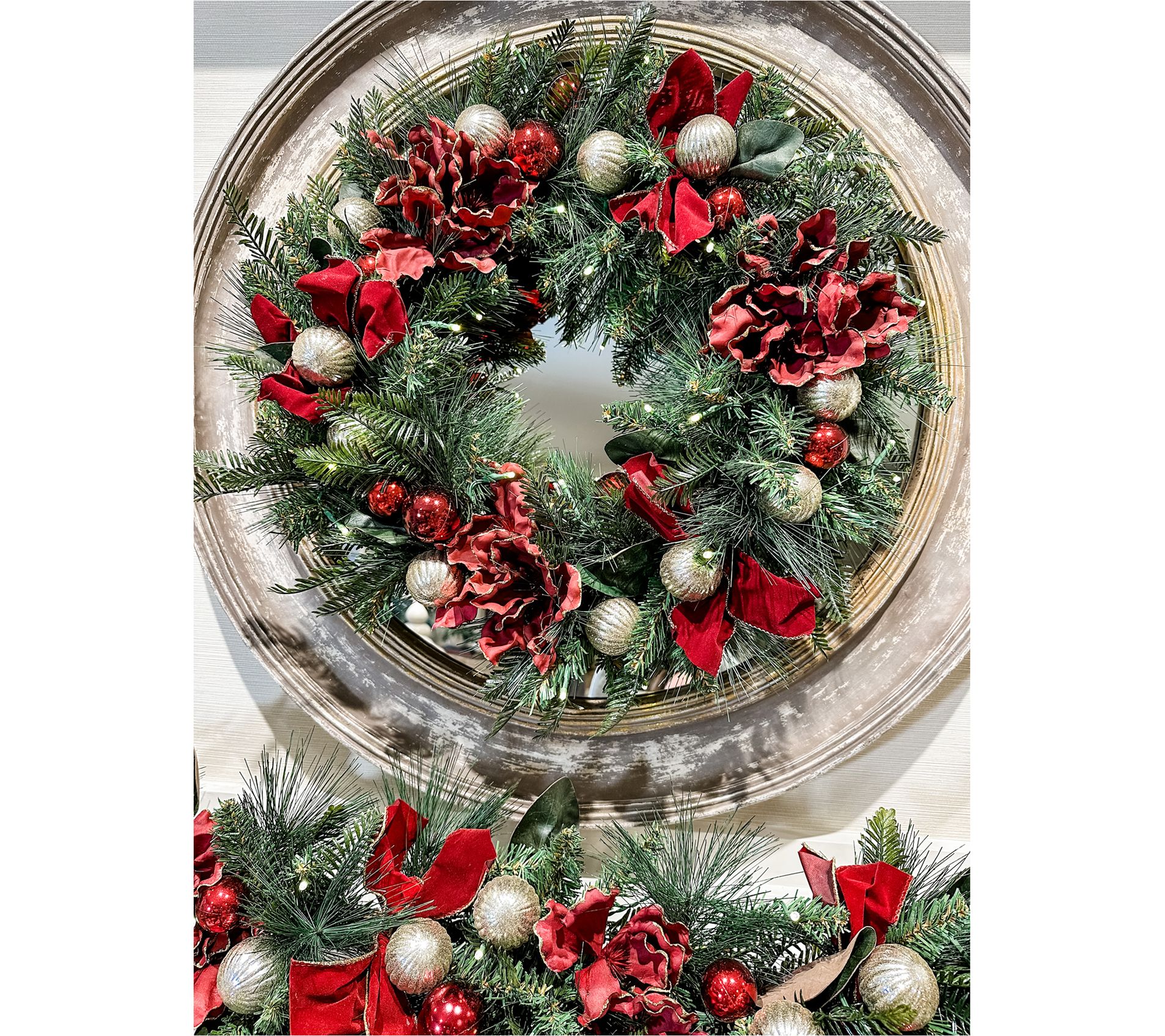 • Metallic ornaments, glitter-tipped faux magnolia flowers, mixed faux greenery and leaves, gold-trimmed velvet ribbon