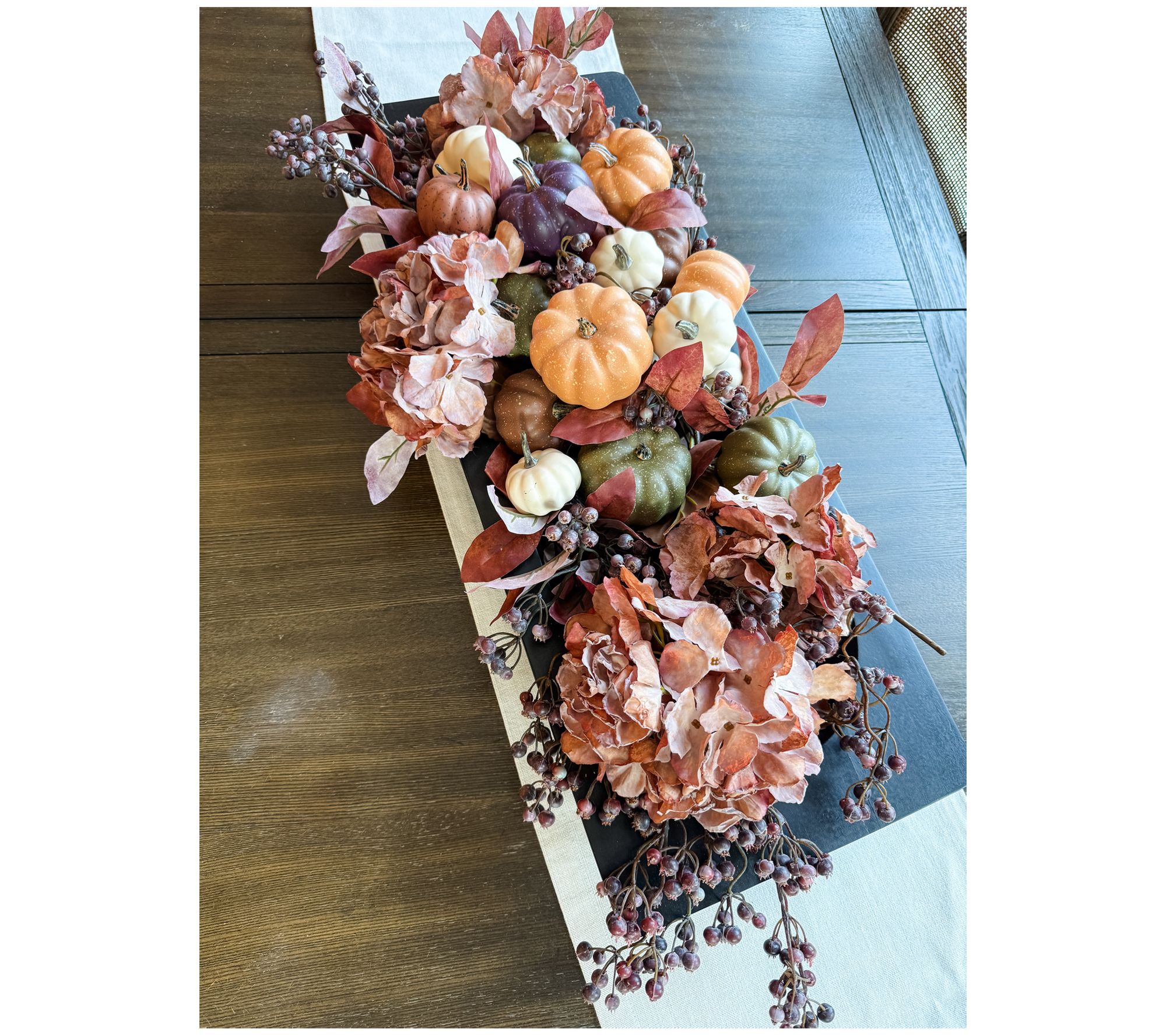 • Caramel-mauve colored faux dried leaves mimic fall hydrangea blooms