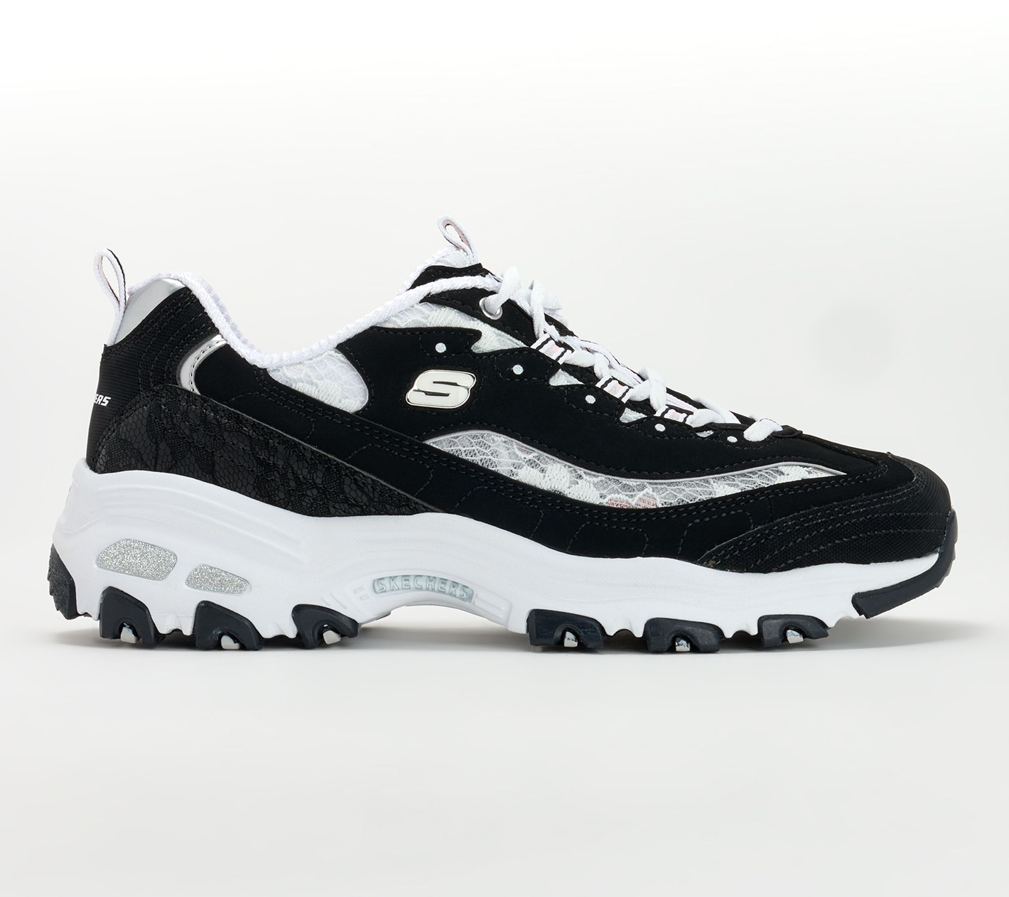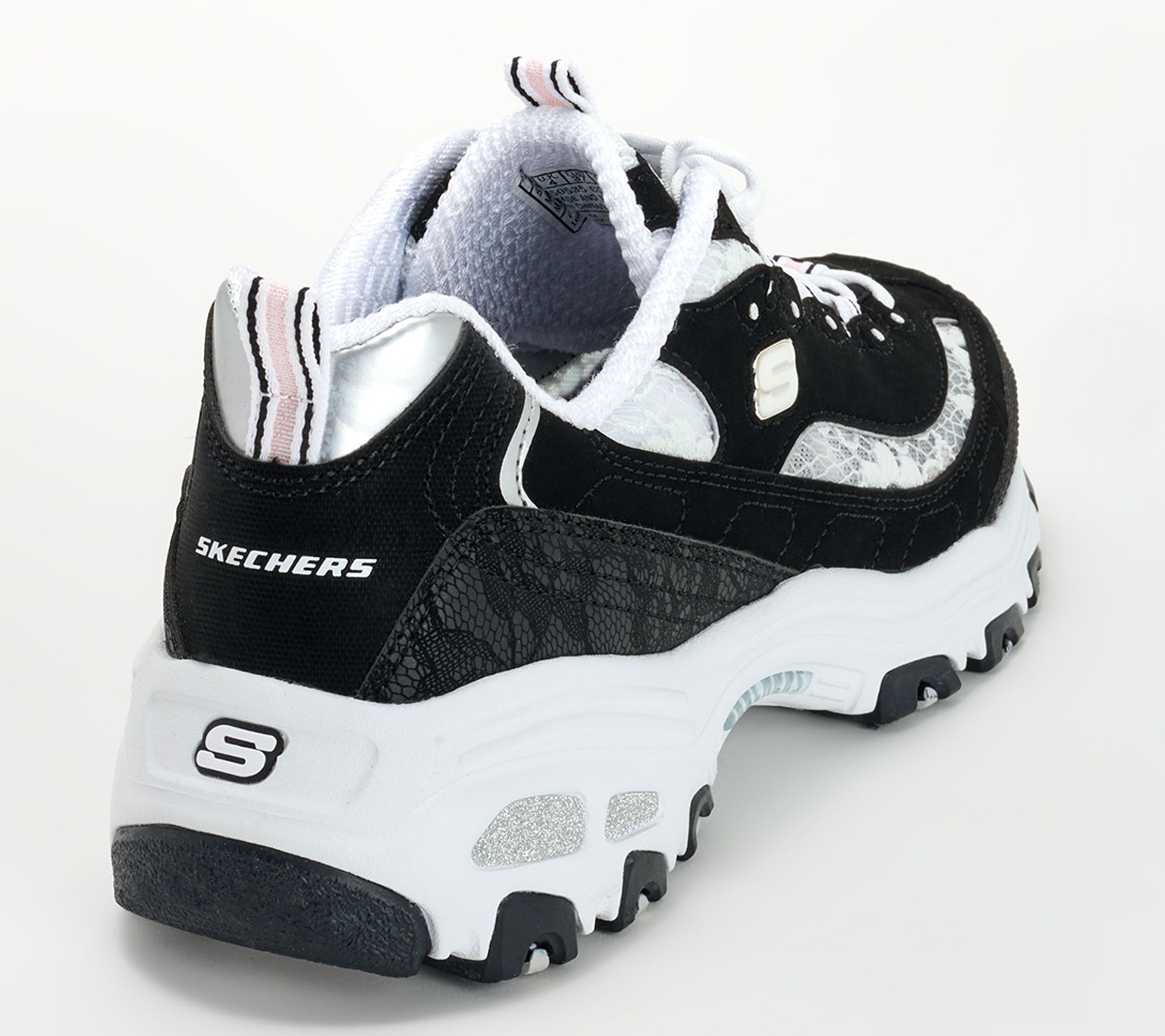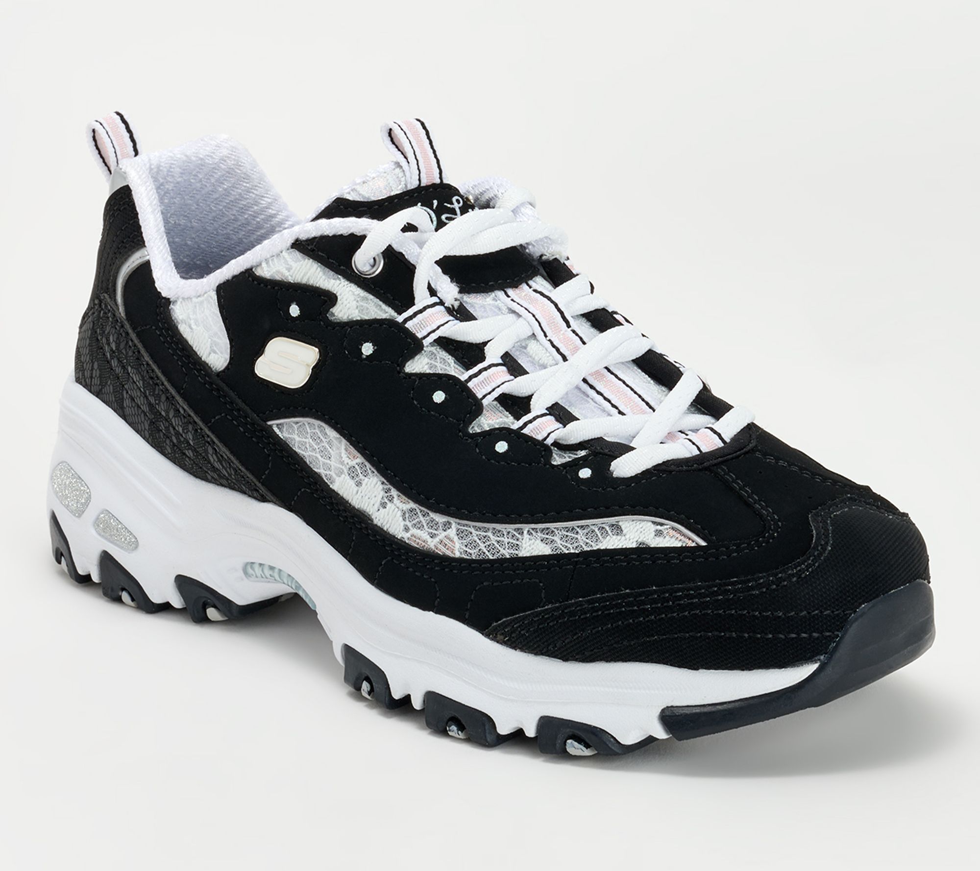 These Skechers D'Lites floral lace-up sneakers are ready for your next adventure. With delicate floral lace trim and the comfort of a memory foam insole, they'll have you walking in both comfort and style. From Skechers.