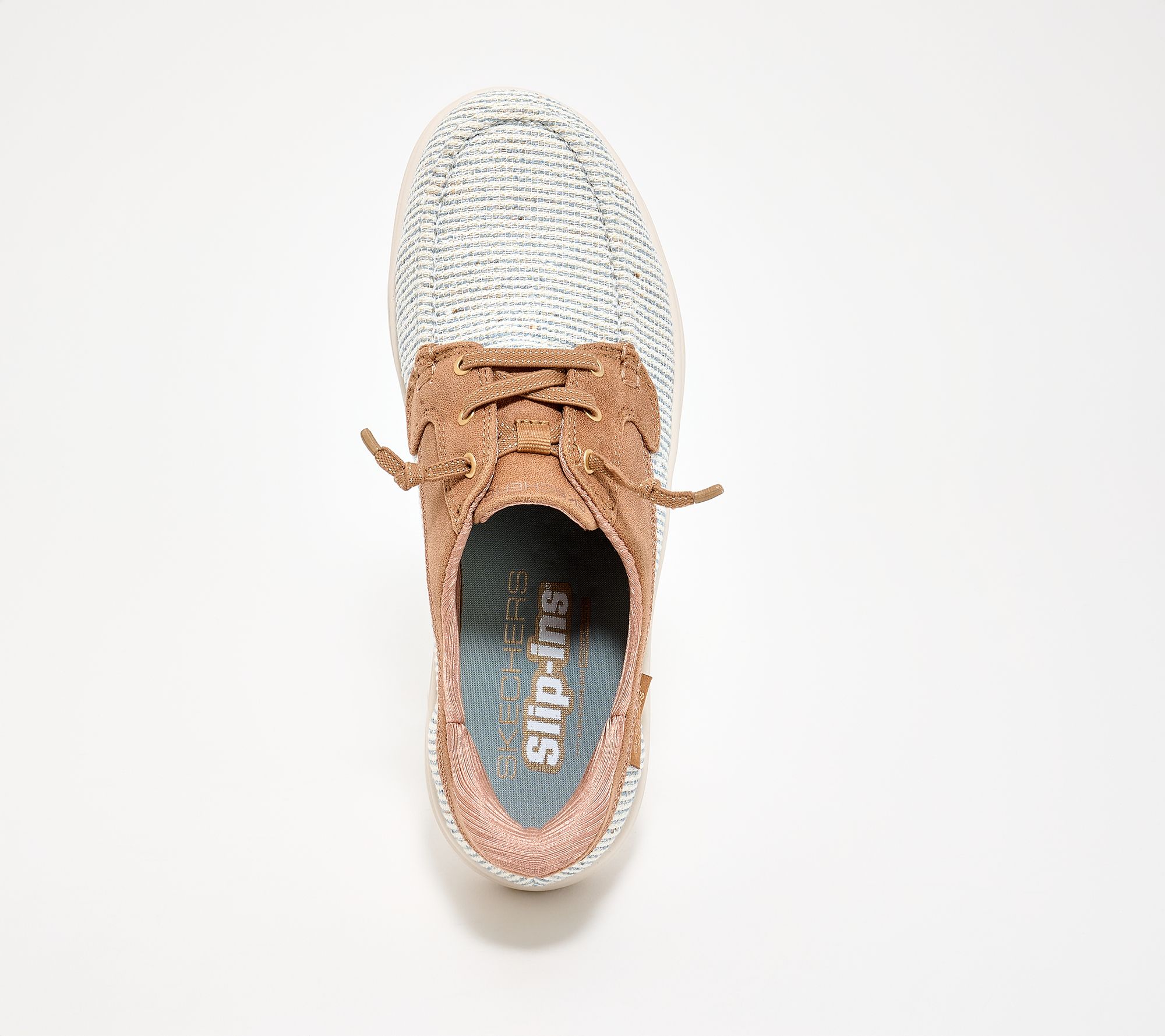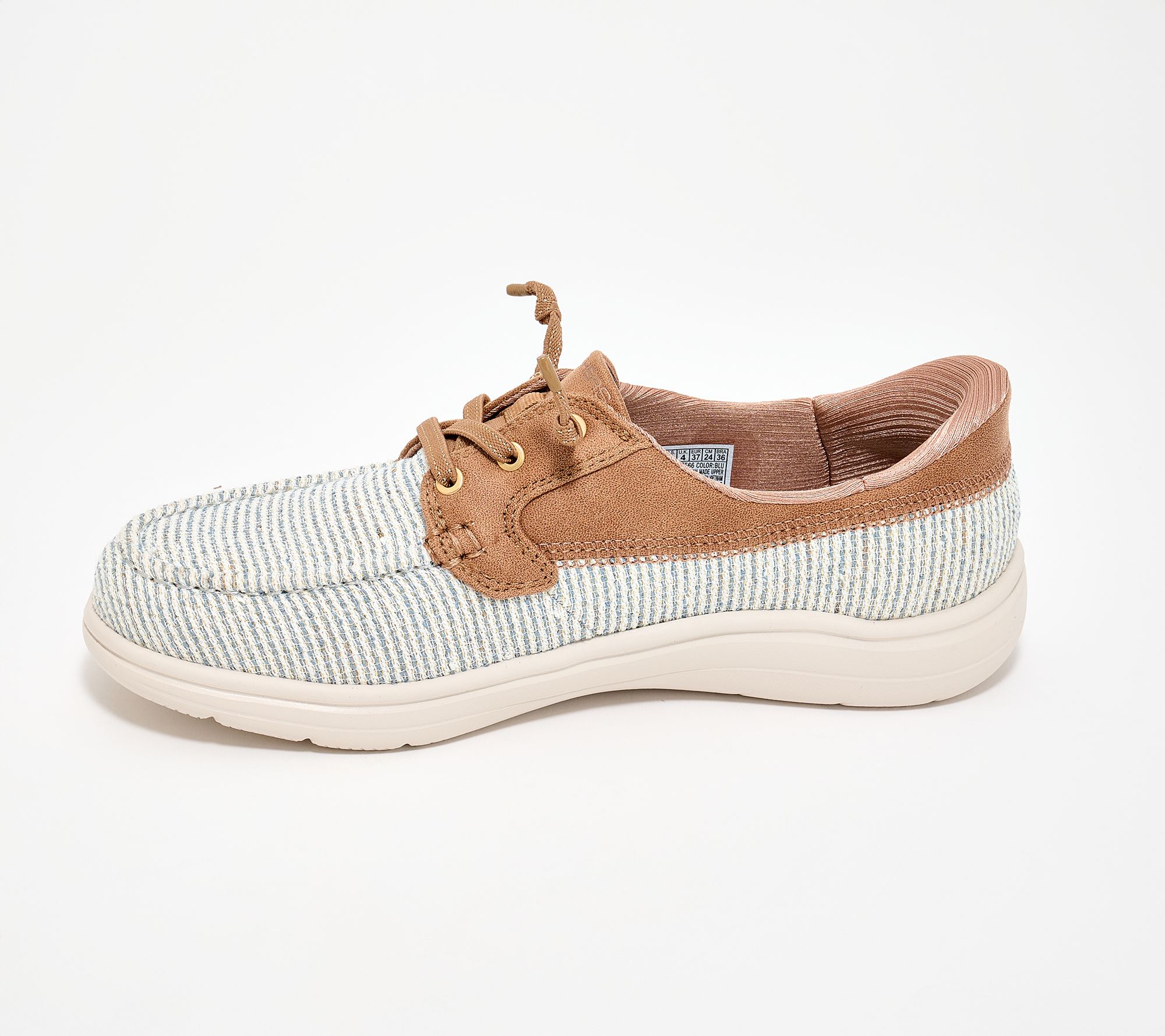 • Hands-free Slip-ins style, Heel Pillow™, glittery striped woven upper, Perform Tex saddle, tied-off stretch laces