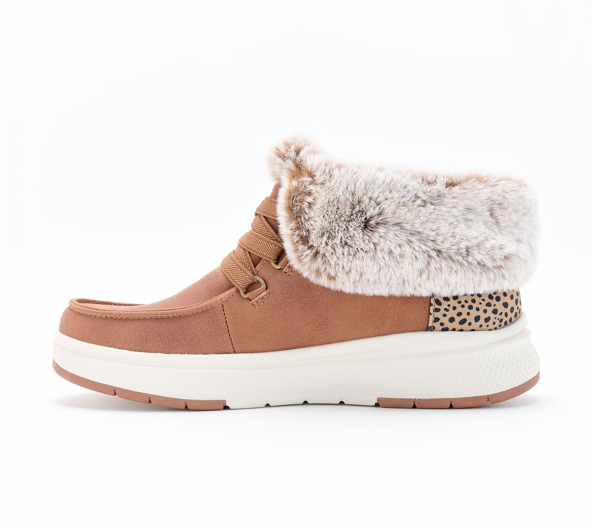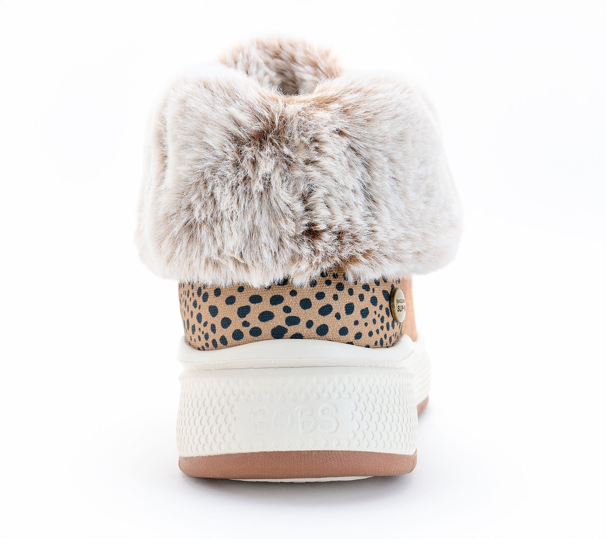 • Faux leather upper, Slip-ins style, faux fur lining, leopard print molded heel panel