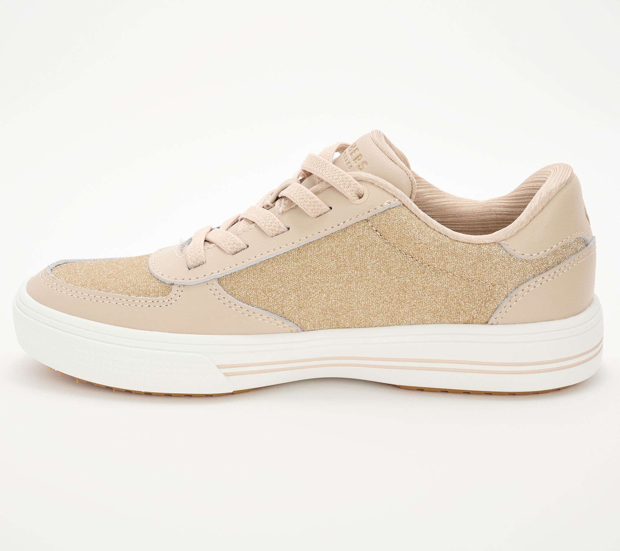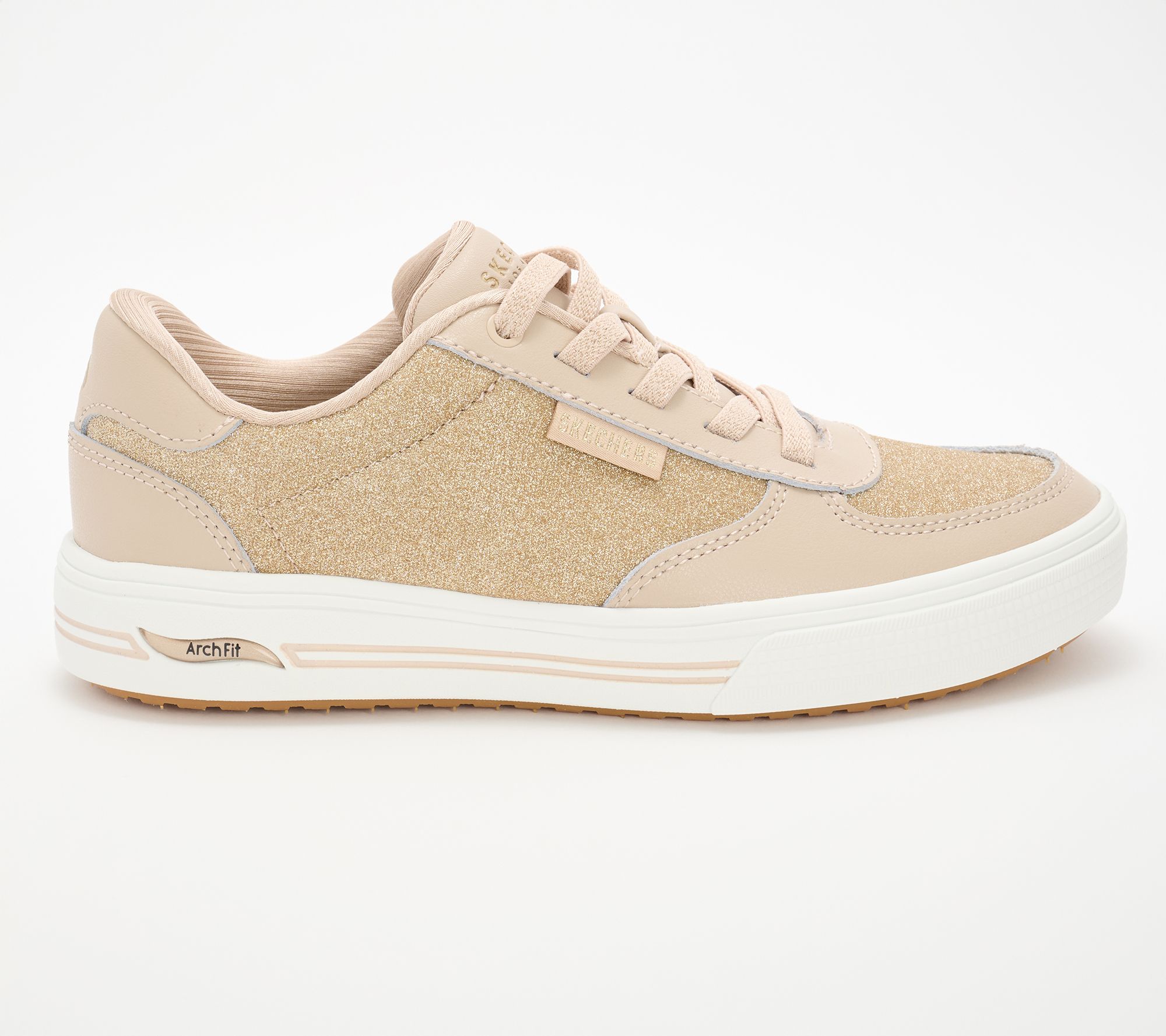 Glitter catches the light with every move in these Arch Fit Arcade sneakers, blending eye-catching style and easygoing comfort all day long. The supportive insole with Skechers Memory Foam cushions every step, while the no-tie laced design makes it a breeze to get out the door -- just right for errands, work, or time with friends. From Skechers.