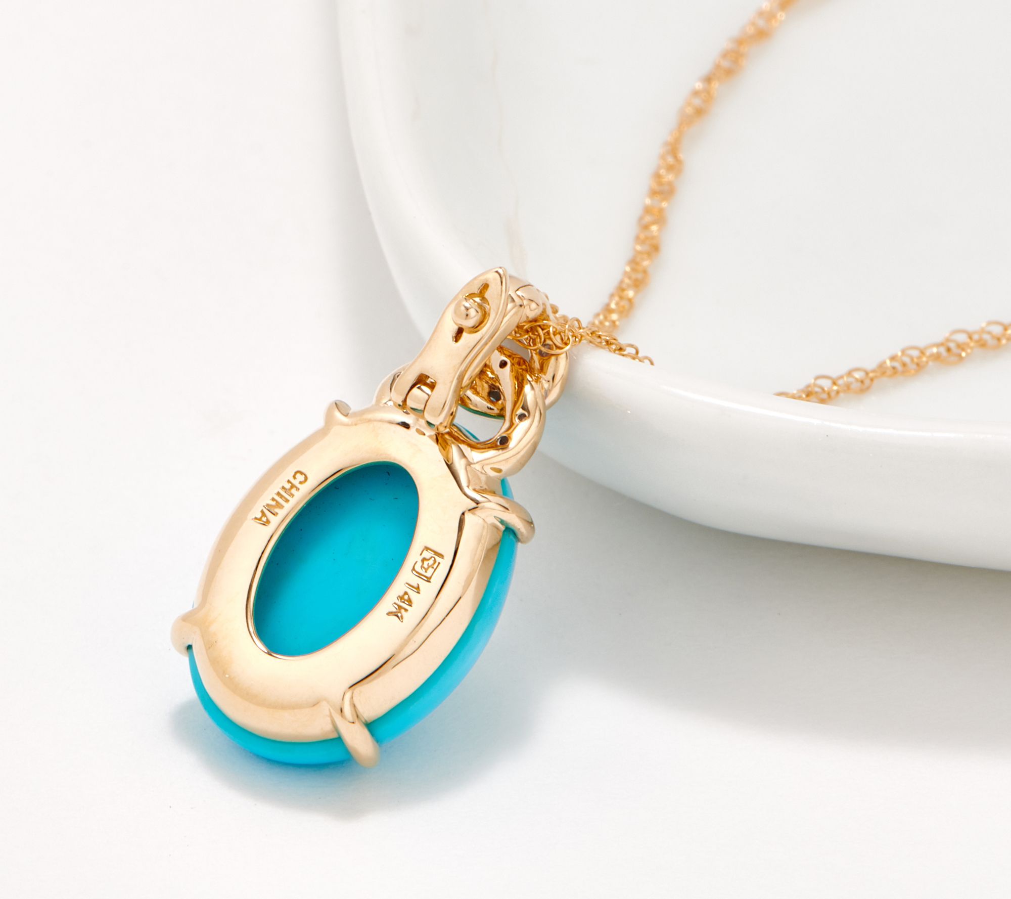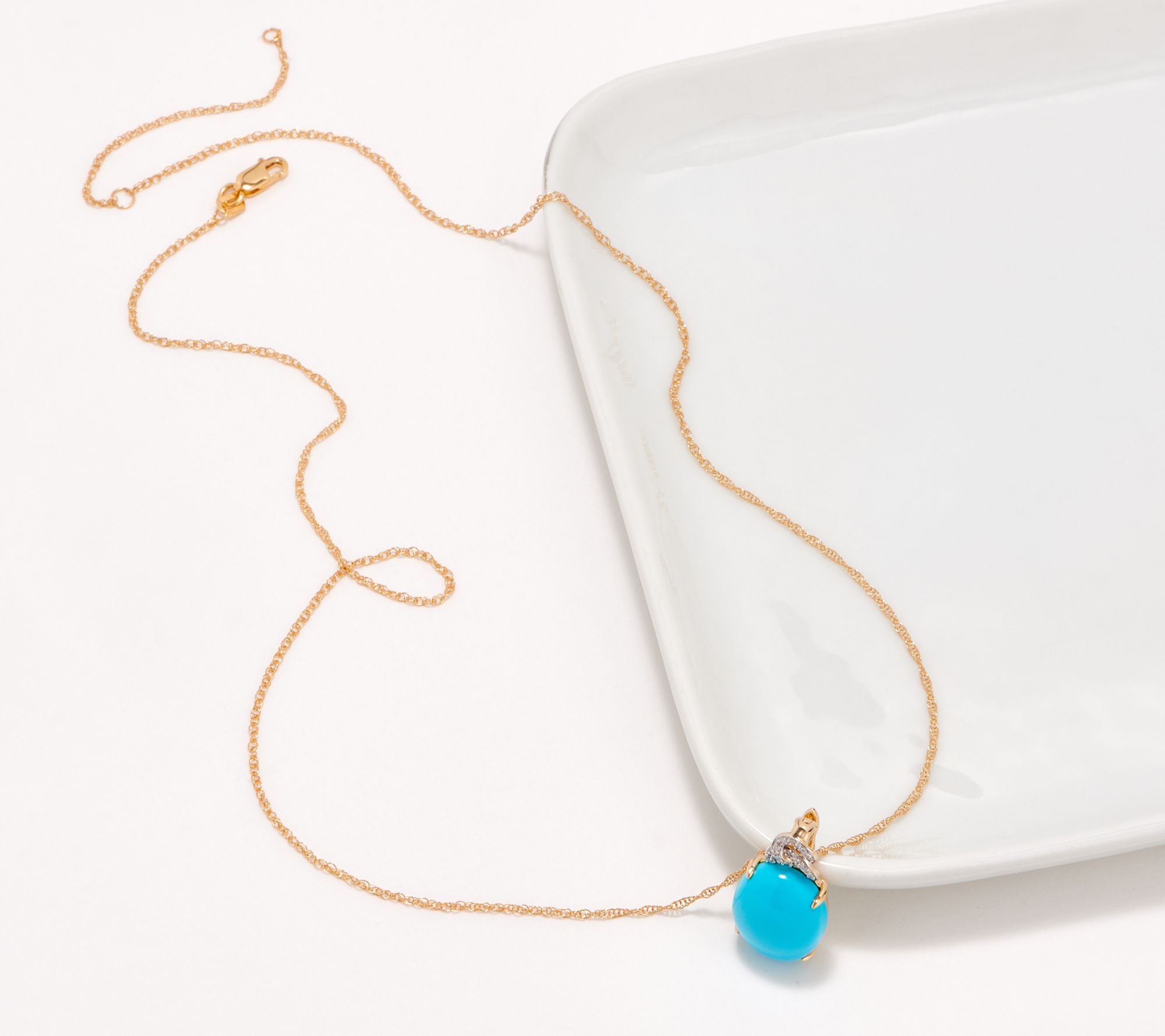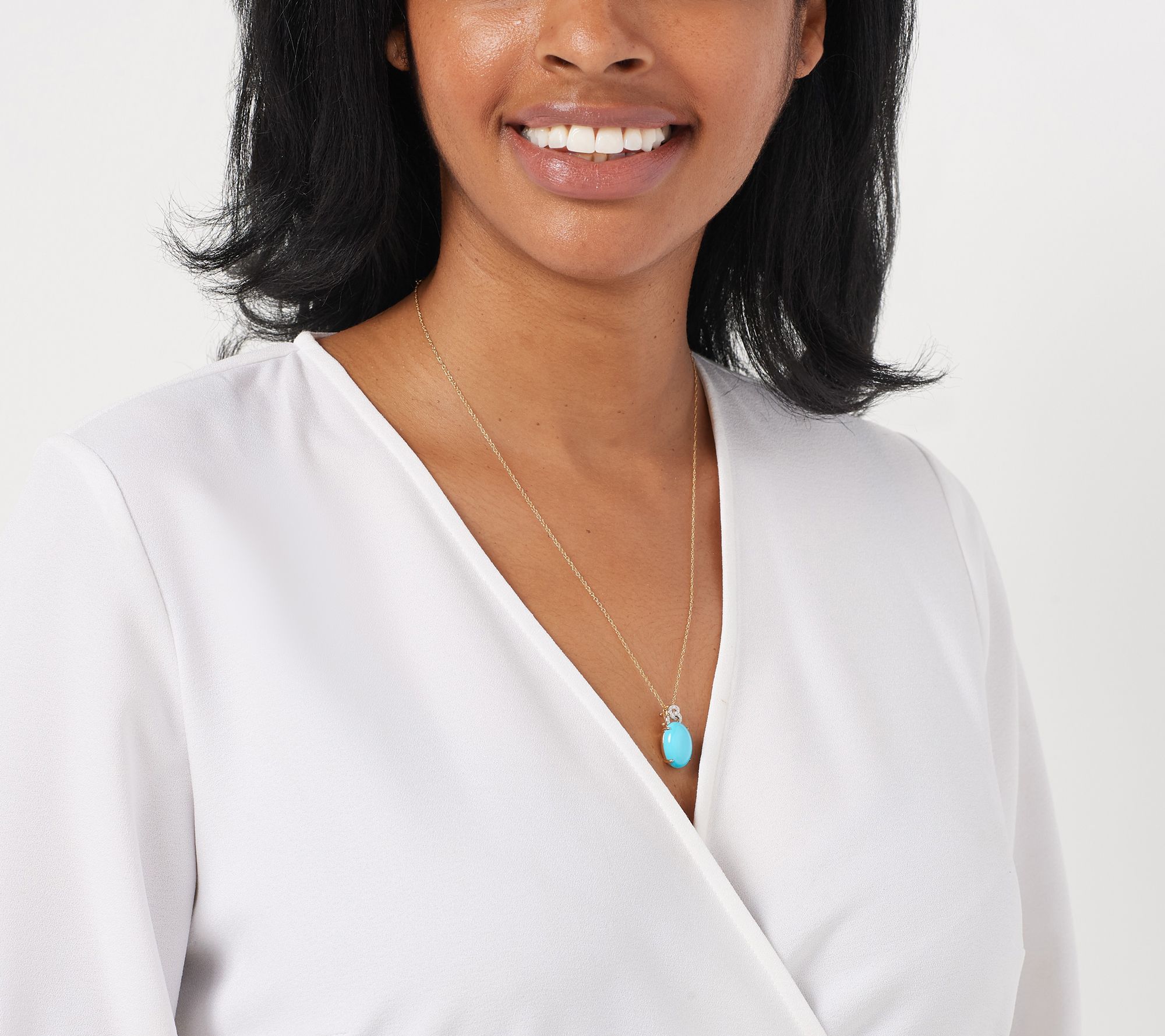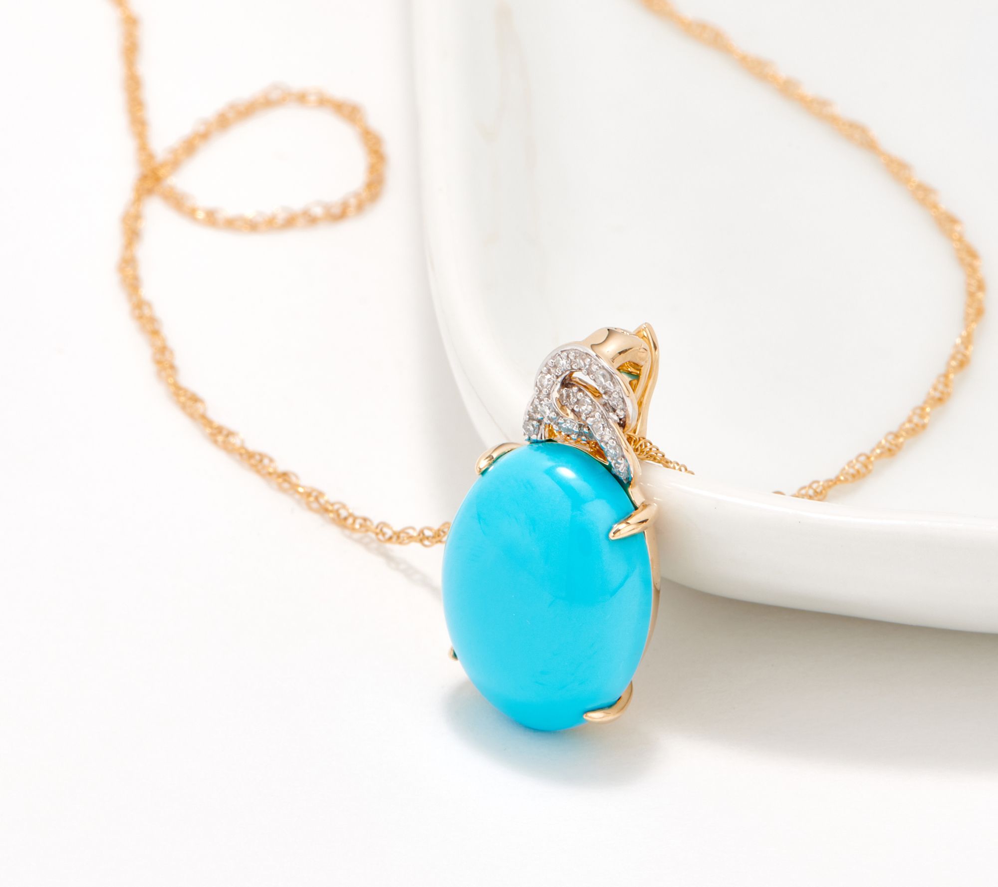 • Prong-set, oval-shaped Sleeping Beauty turquoise cabochon; snap hinge bail with bead-set, round diamonds; rhodium plating on diamond settings; polished finish