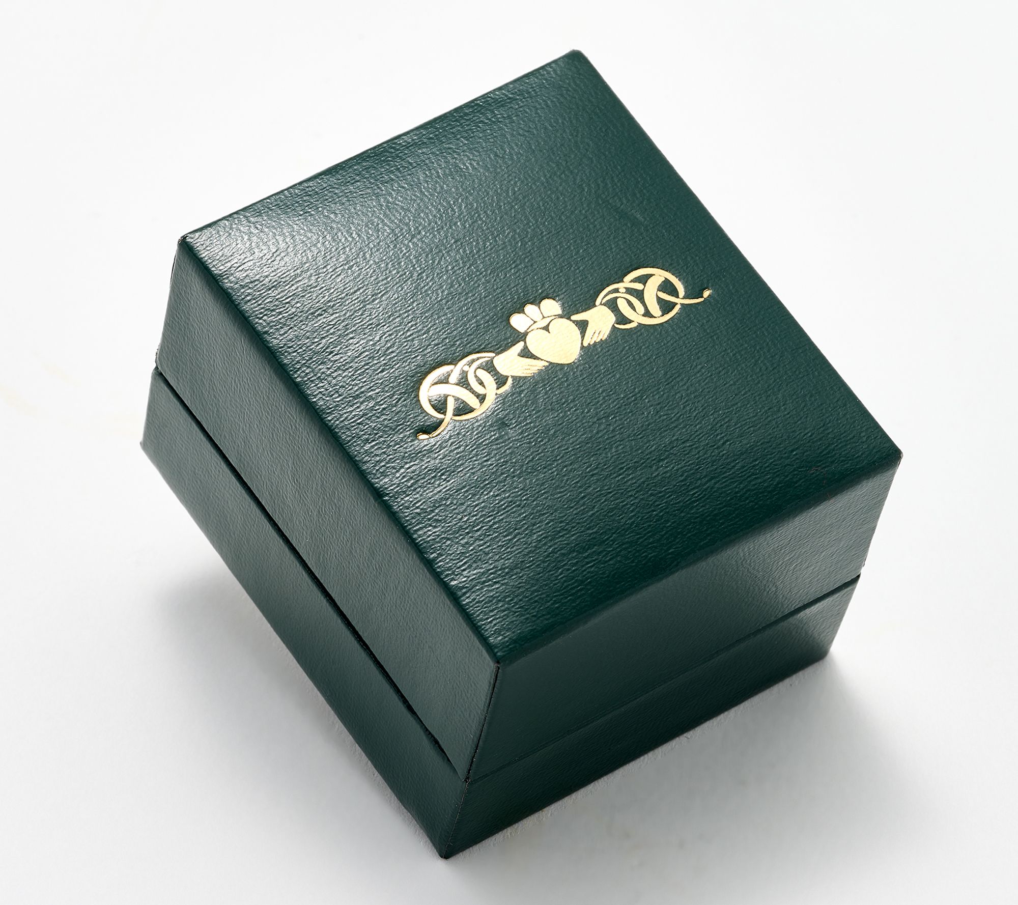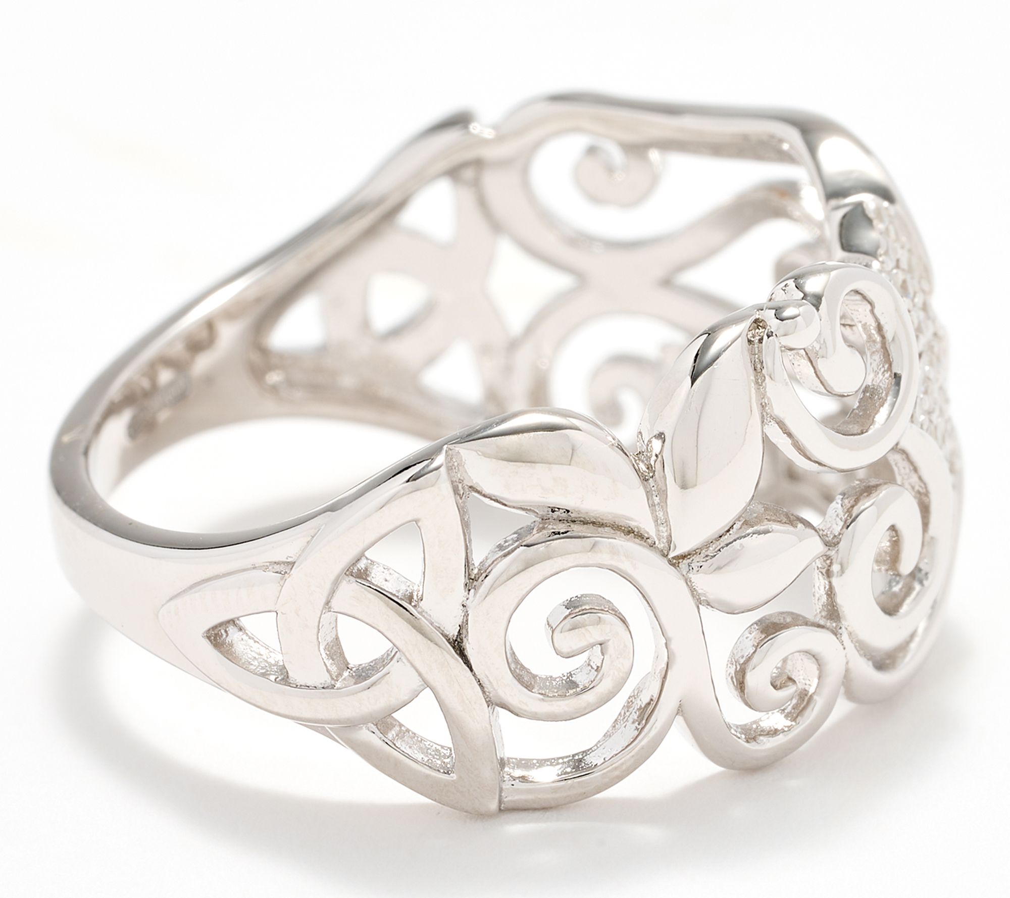 • Pave-set shamrock motif; polished trinity knot motif; Celtic swirl details; simulated diamond accents