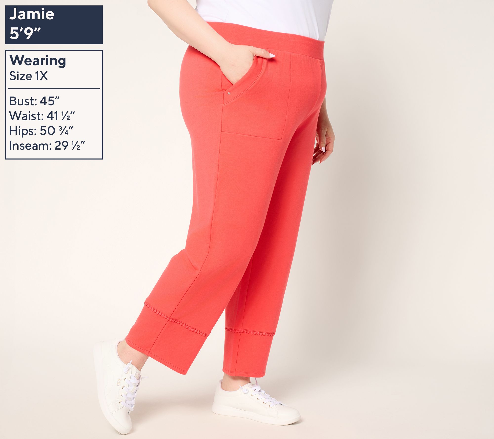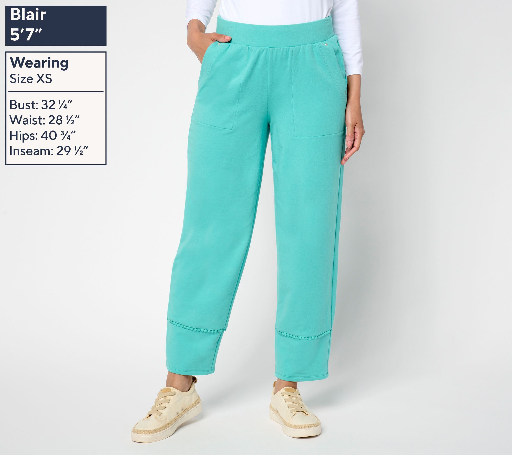 • Features: ankle length, pom-pom trim, pull-on style, flat waistband, pockets