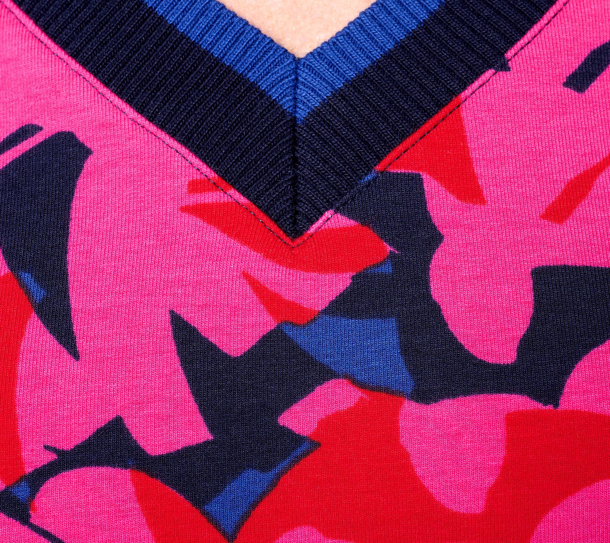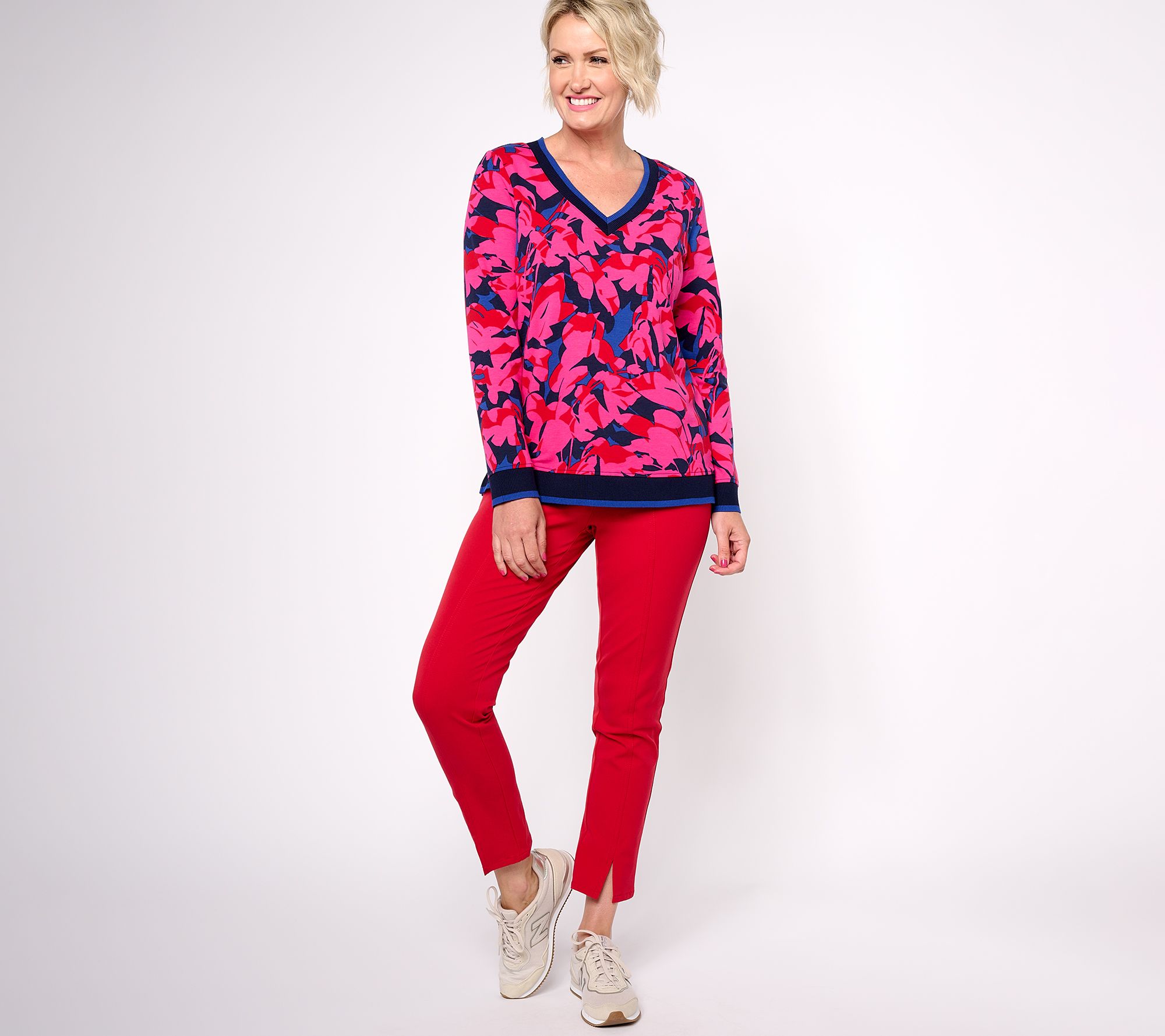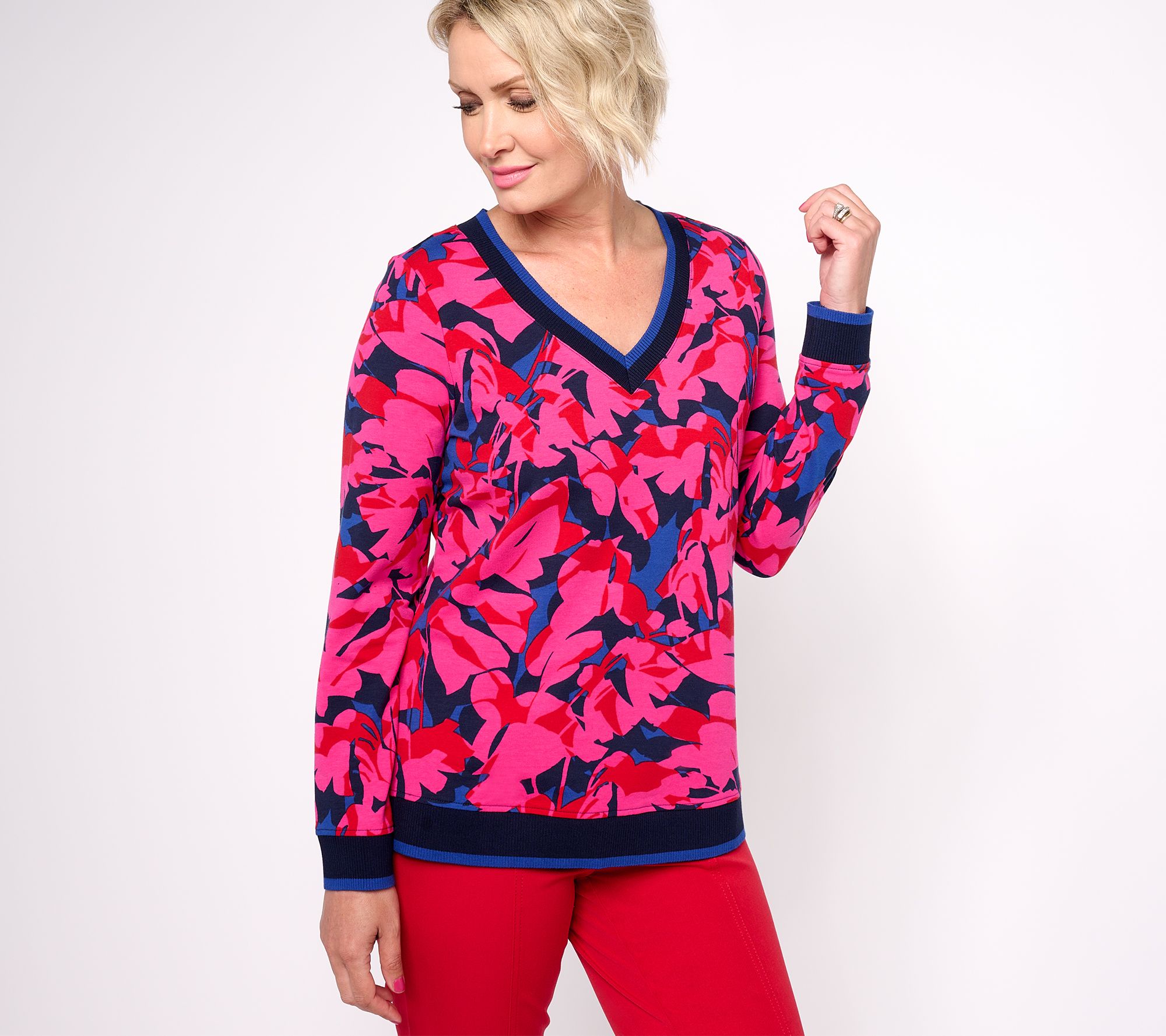 A pretty print and a contrasting V-neckline sets this long-sleeve pullover apart from the rest. Soft French terry fabric keeps you in long-lasting comfort. From Sport Savvy.