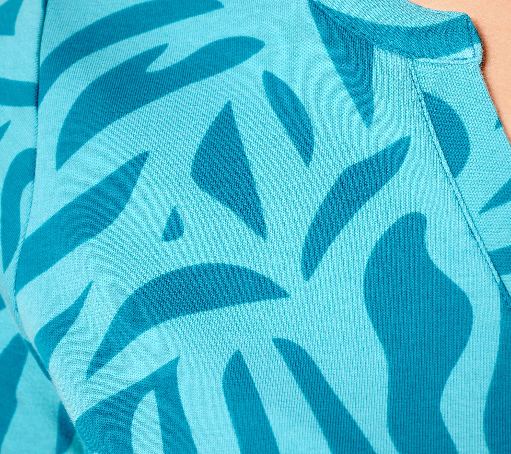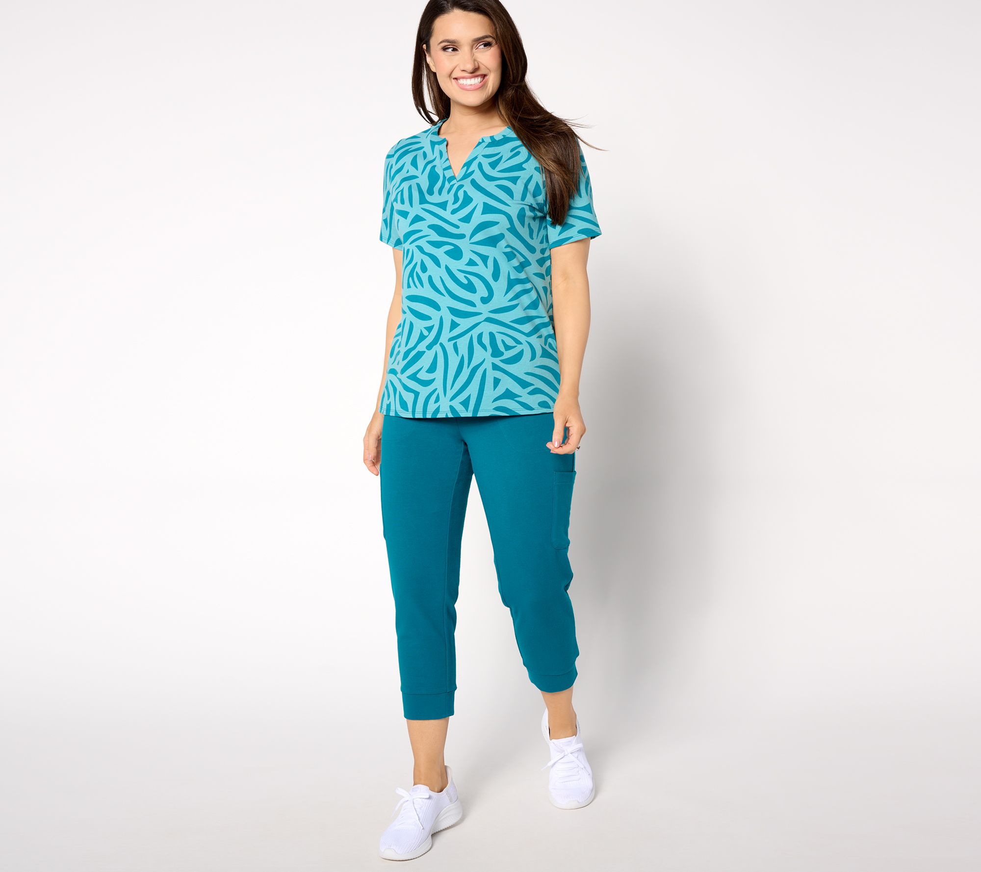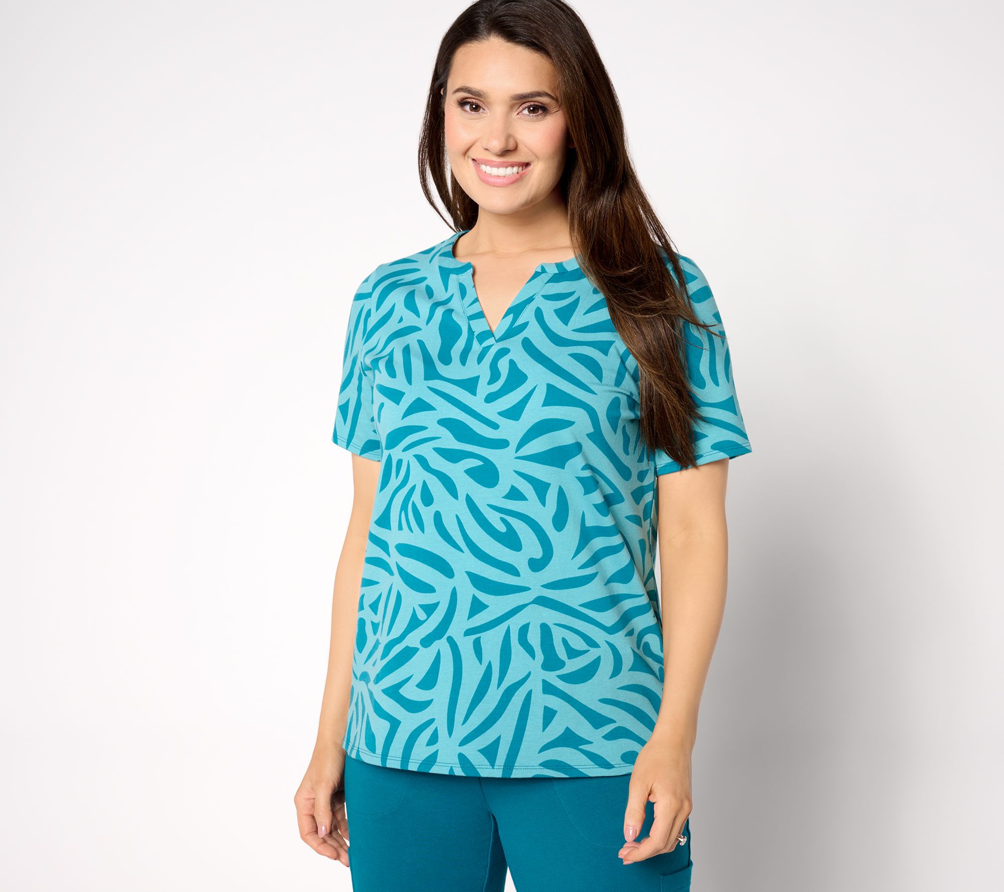 Featuring a split neck and an abstract pattern, this short-sleeve top will be in heavy rotation this summer. Wear it with capri pants, cropped joggers, or your favorite denim and finish with a cute pair of kicks. From Sport Savvy.