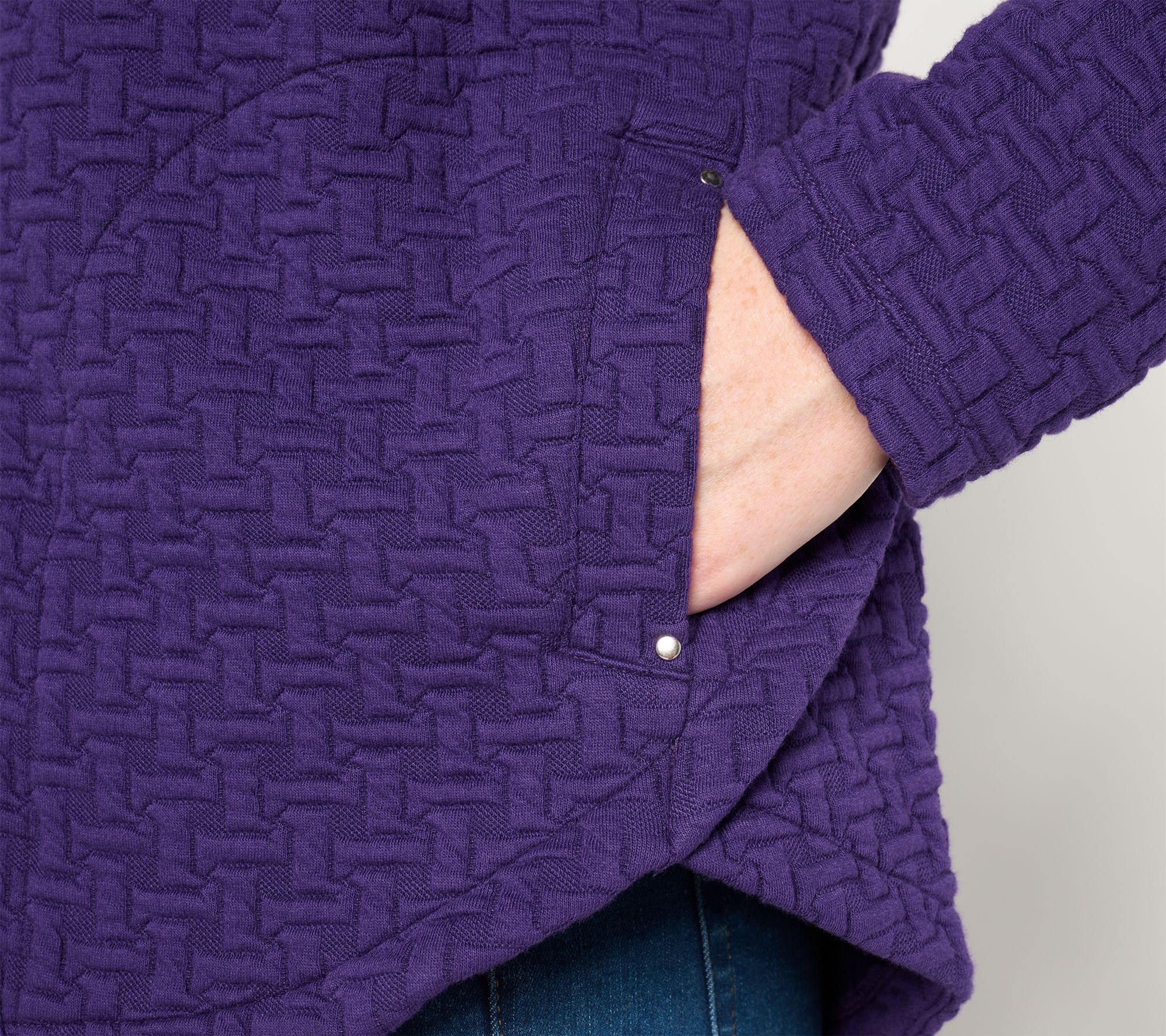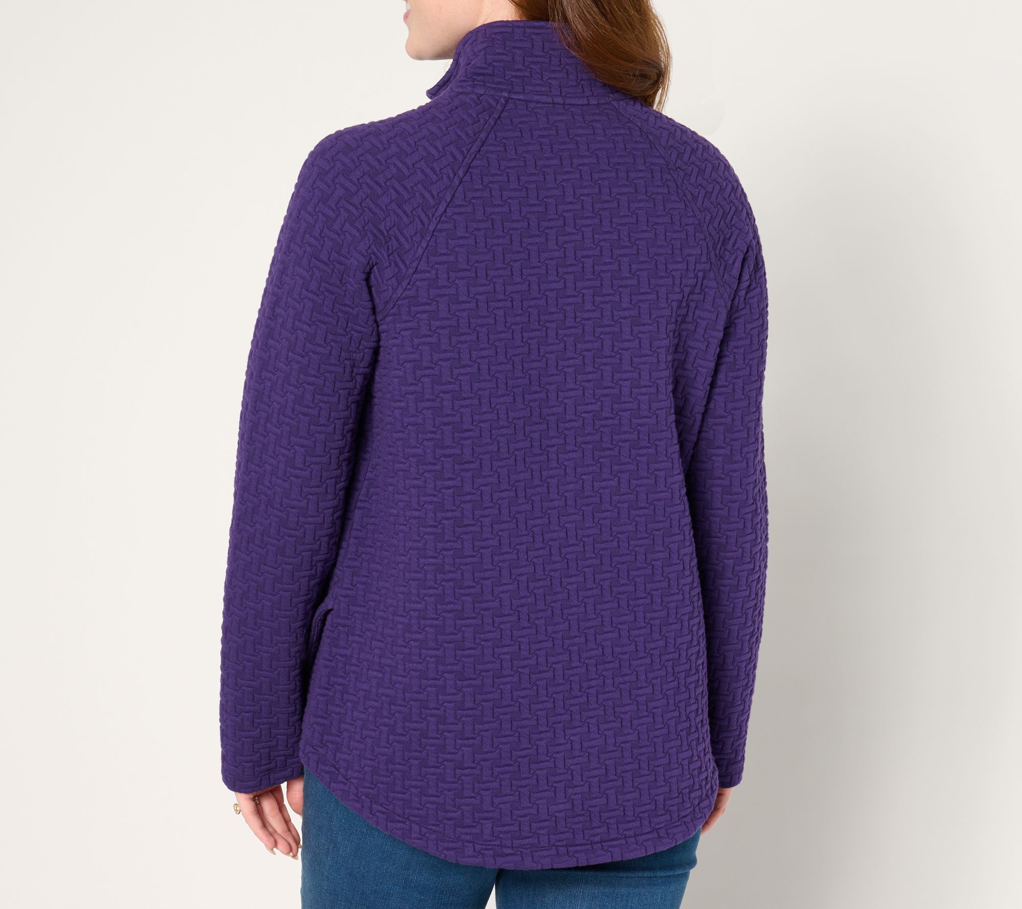 • Features: puff jacquard, mock neck, back neck tape, raglan shoulder seams, on-seam welt pockets, hi-low curved hem with side tulip detail