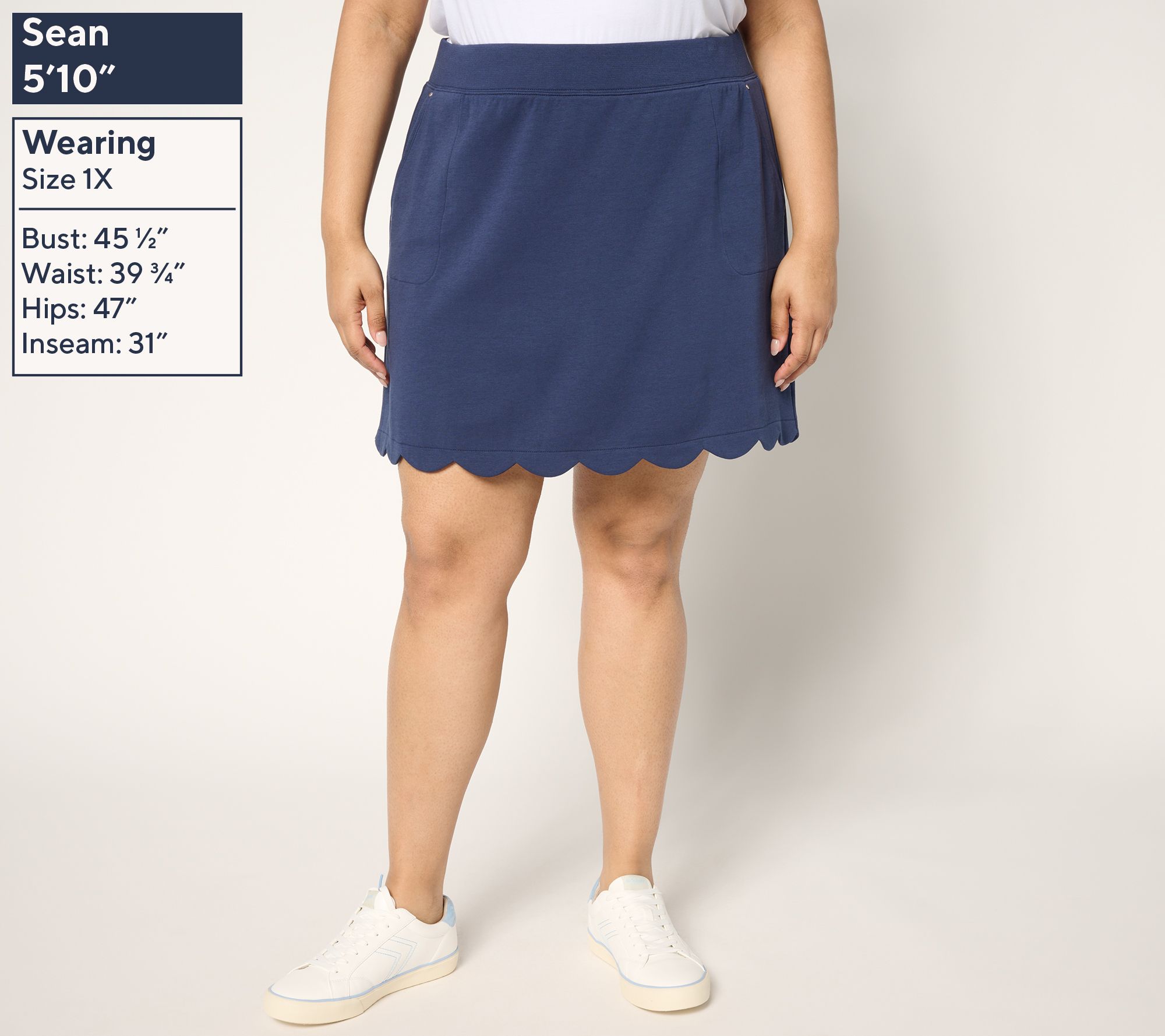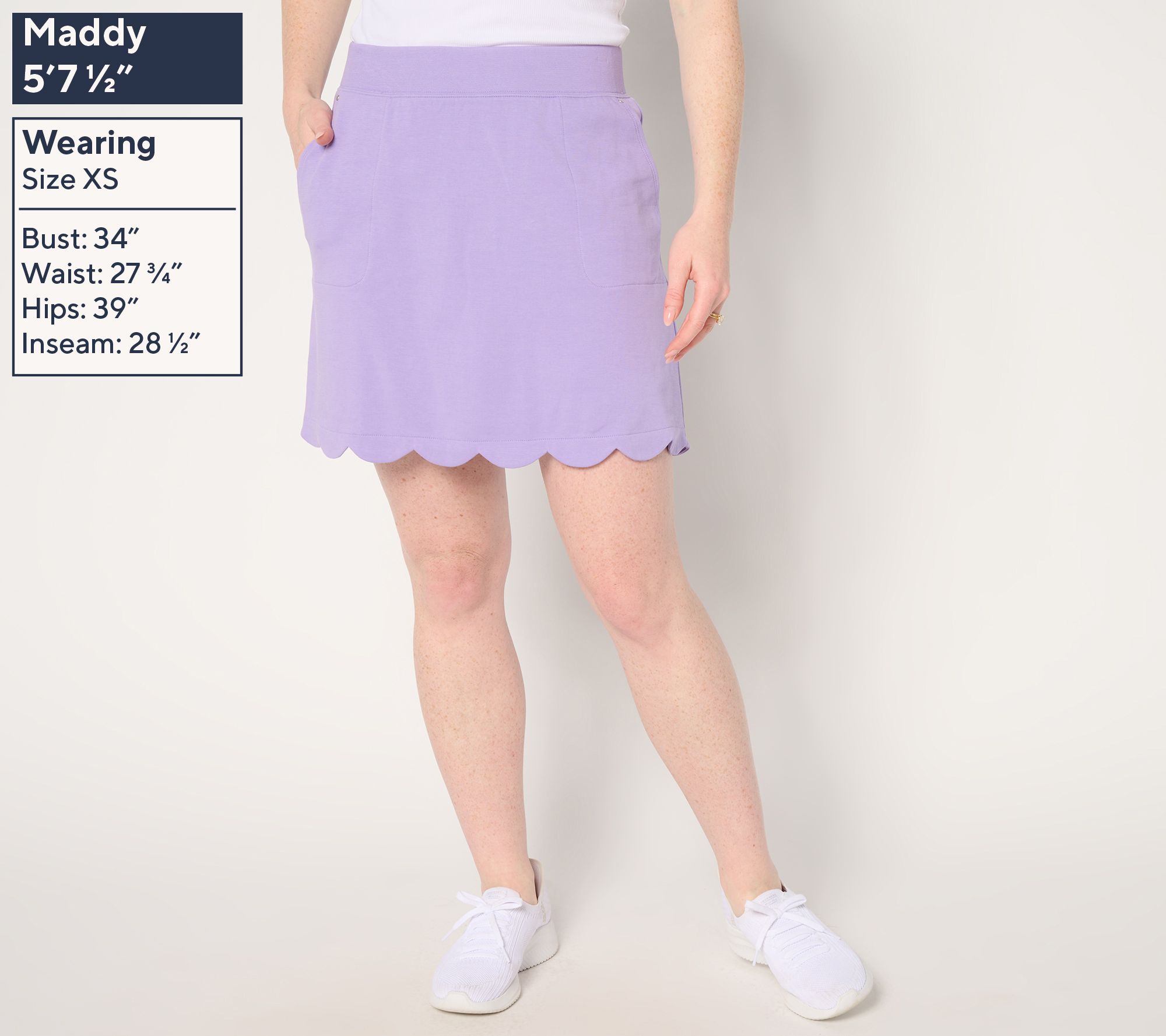 • Features: scalloped hem, pull-on style, flat waistband, slant pockets, attached knit short
