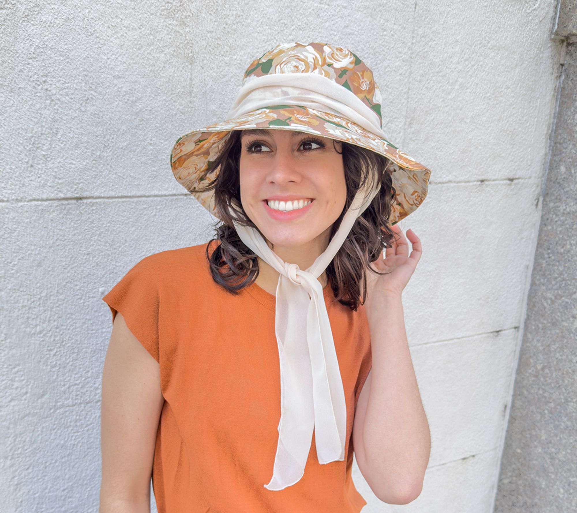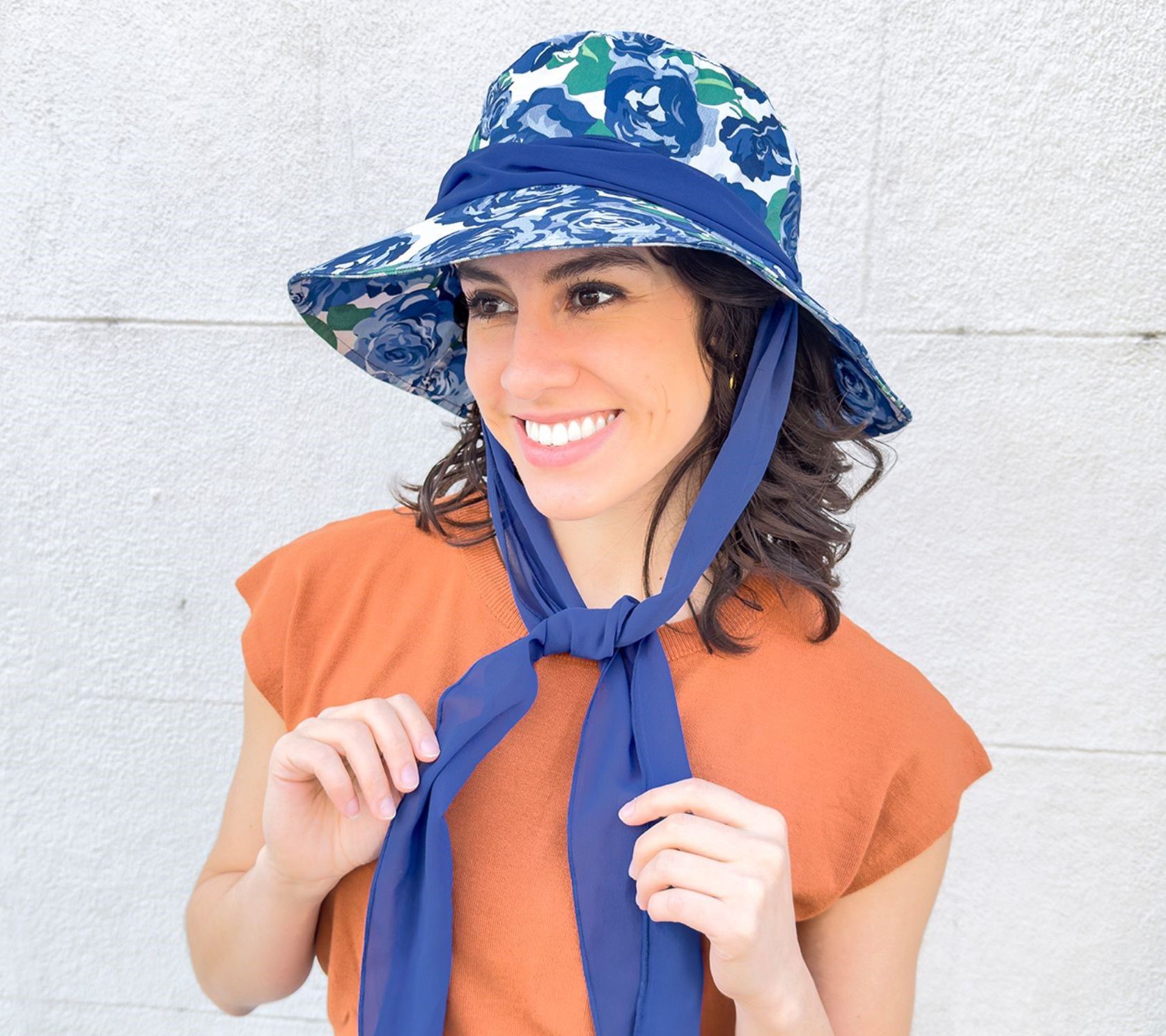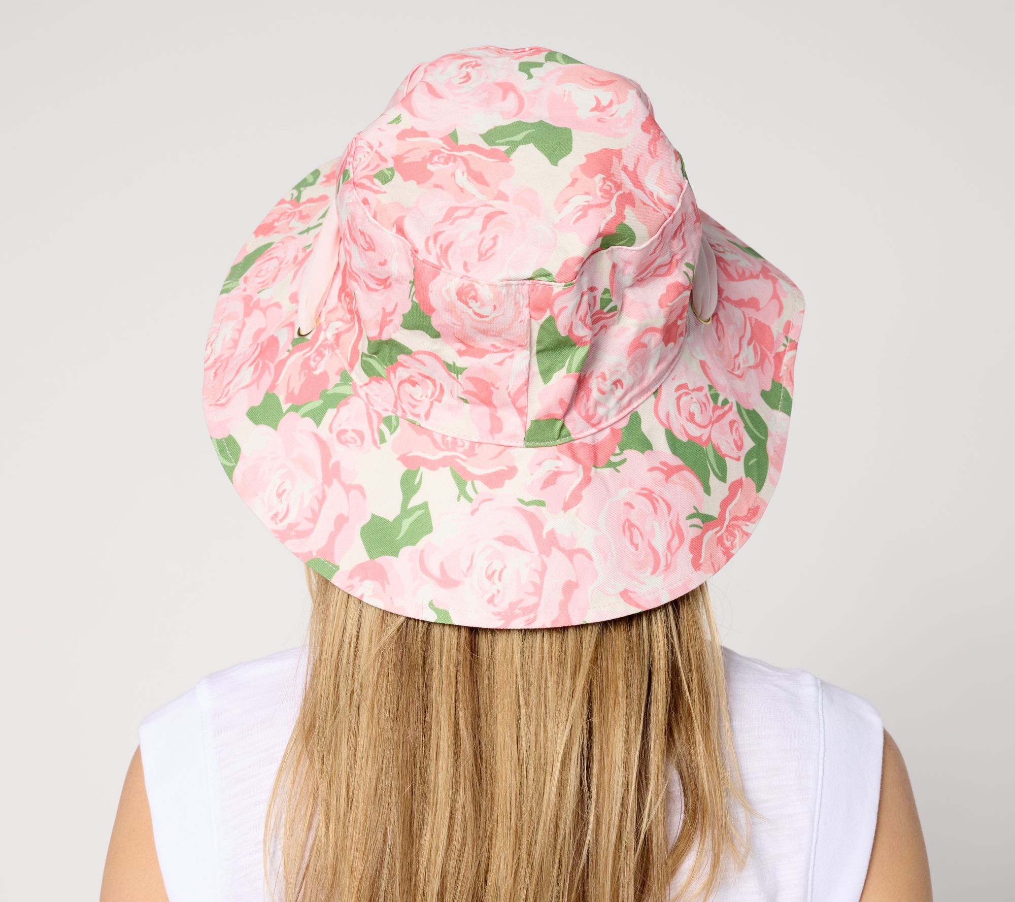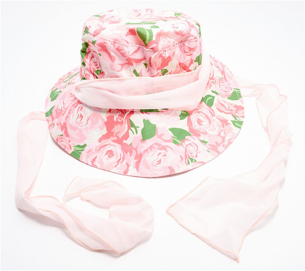 For garden teas, bridal showers, and barbecues, come dressed to impress in this charming rose-print hat. And welcome a warm, gentle breeze to the party -- a generous chiffon tie helps secure the fit. From Sprigs.