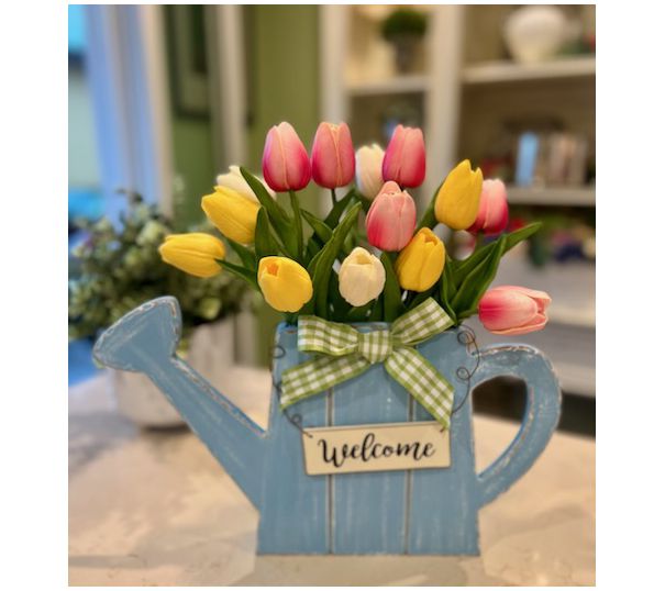 • Wooden watering can with 14 faux tulips and fabric green-and-white checkered bow