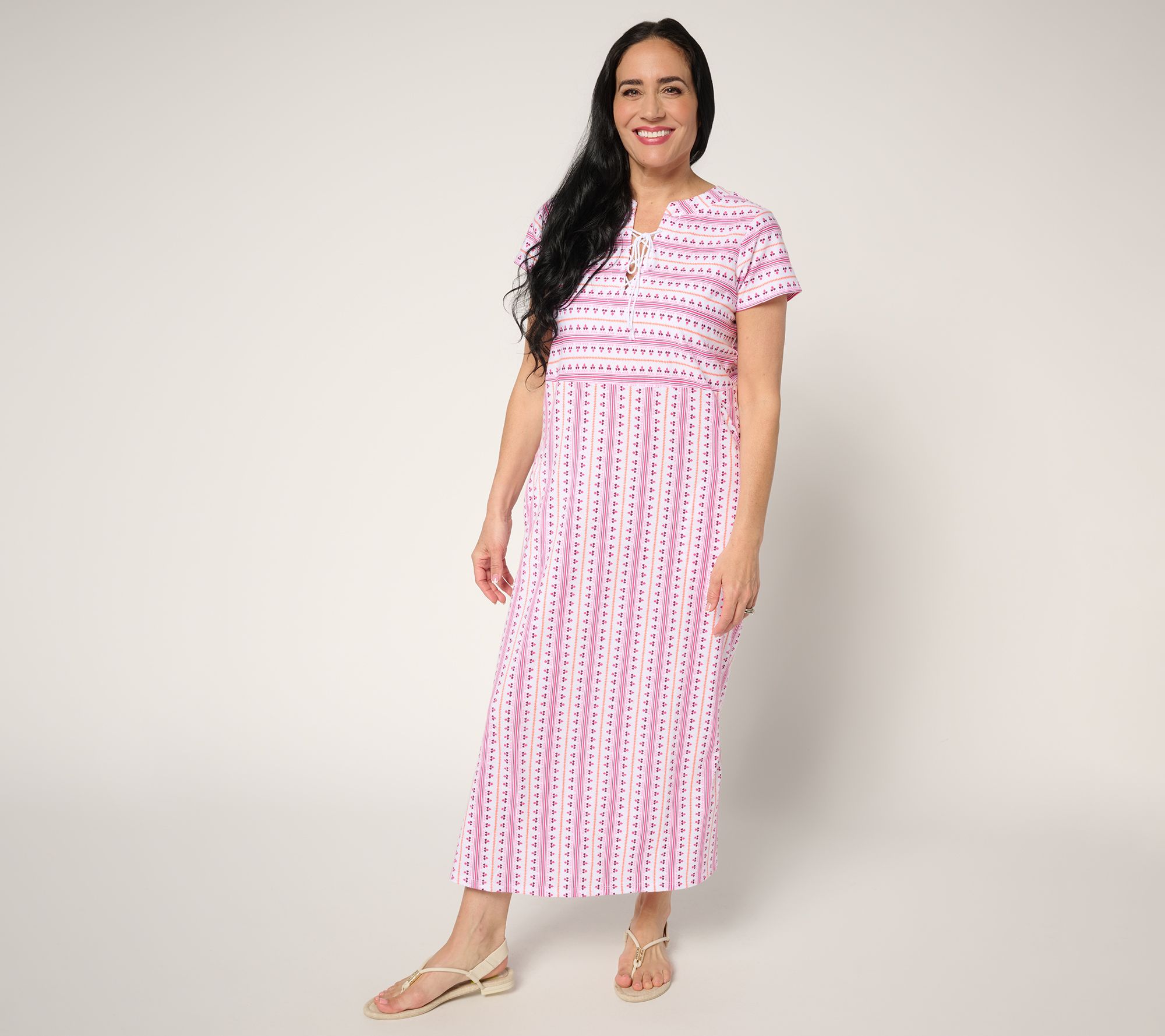 Relax and unwind in the comfort of this delightful caftan, whether you're indulging in a lazy day at home or making the most of your lounge time. The playful print and lace-up neckline add a touch of charm to your effortless look. From Stan Herman.