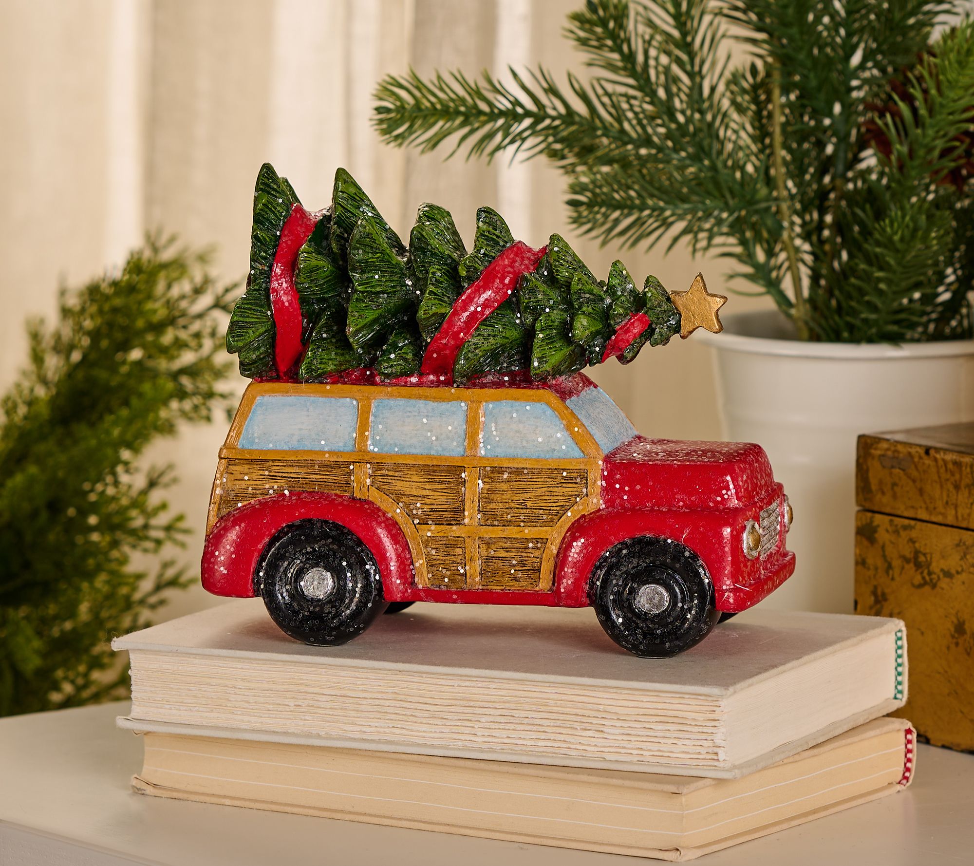 Winter roads and childhood memories come rushing back as this festive station wagon rolls into your holiday decor. Shimmering with glitter and topped with a classic Christmas tree, it looks right at home nestled among your seasonal accents or perched on a mantel. Wooden-look panels and whimsical details bring plenty of charm to brighten your celebrations. From the Valerie Parr Hill Collection.