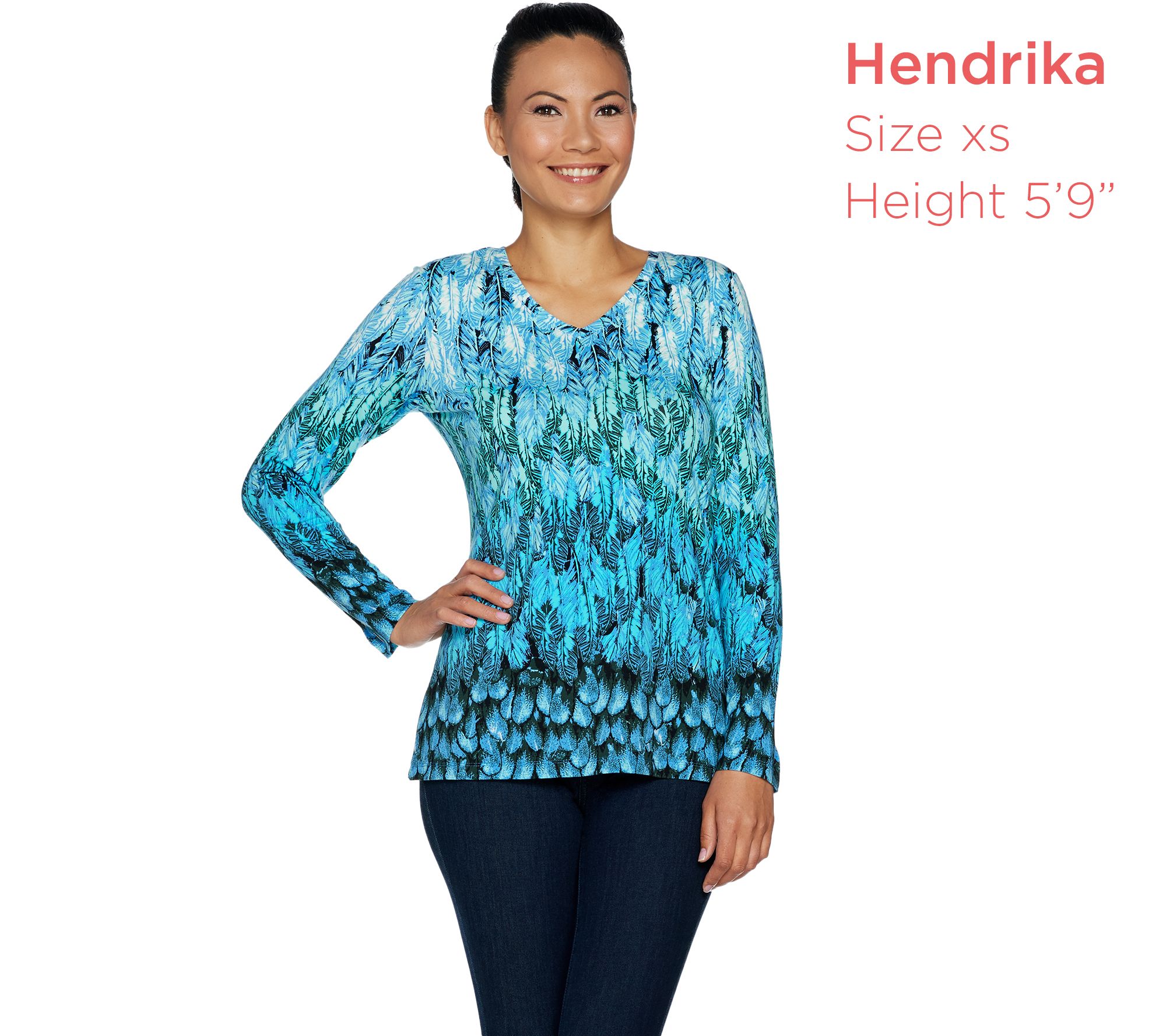 • Features: long sleeves, V-neckline, allover feather print