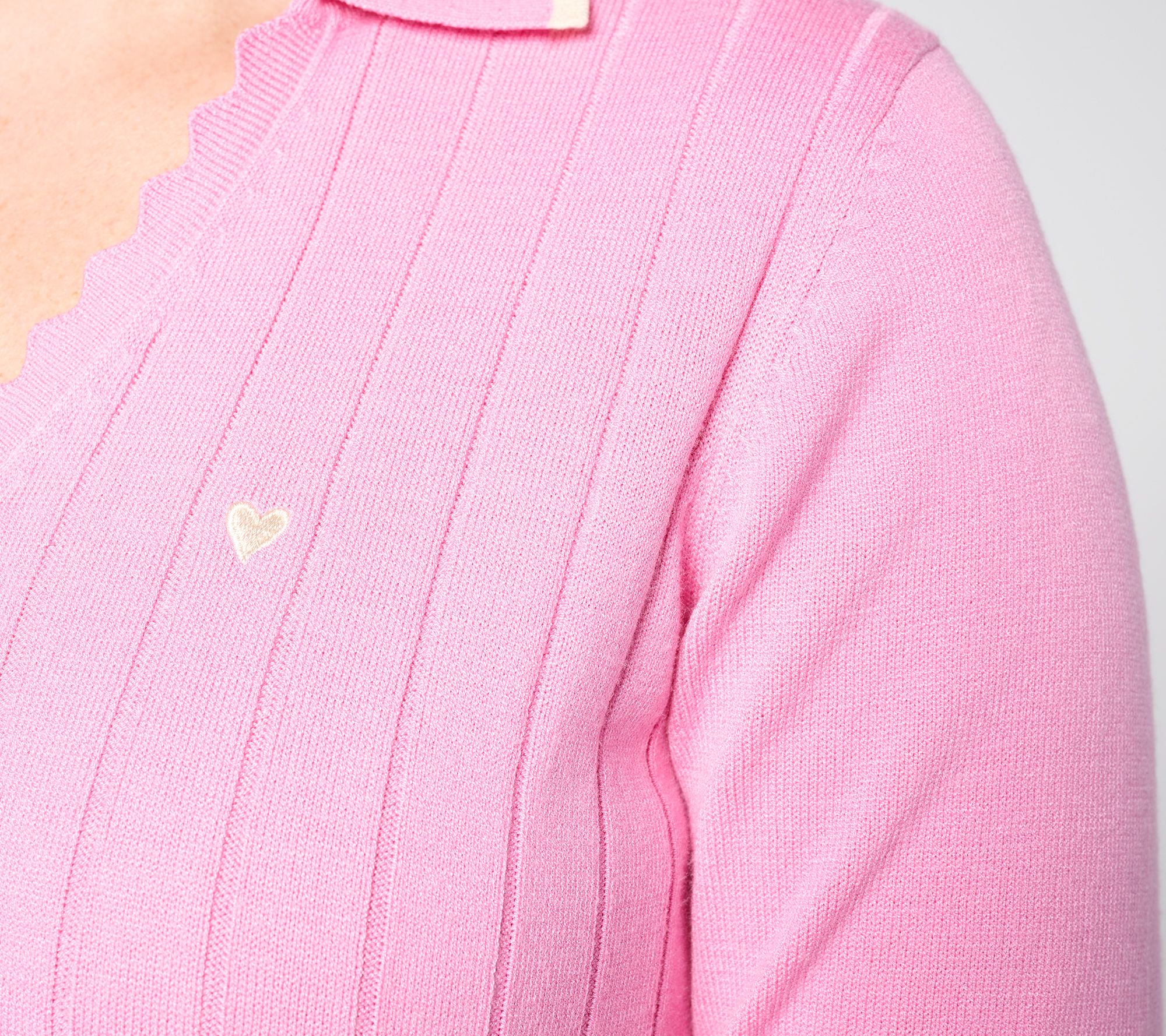 • Features: color pop details, rib polo collar, scalloped neckline, short sleeves, straight bottom hem