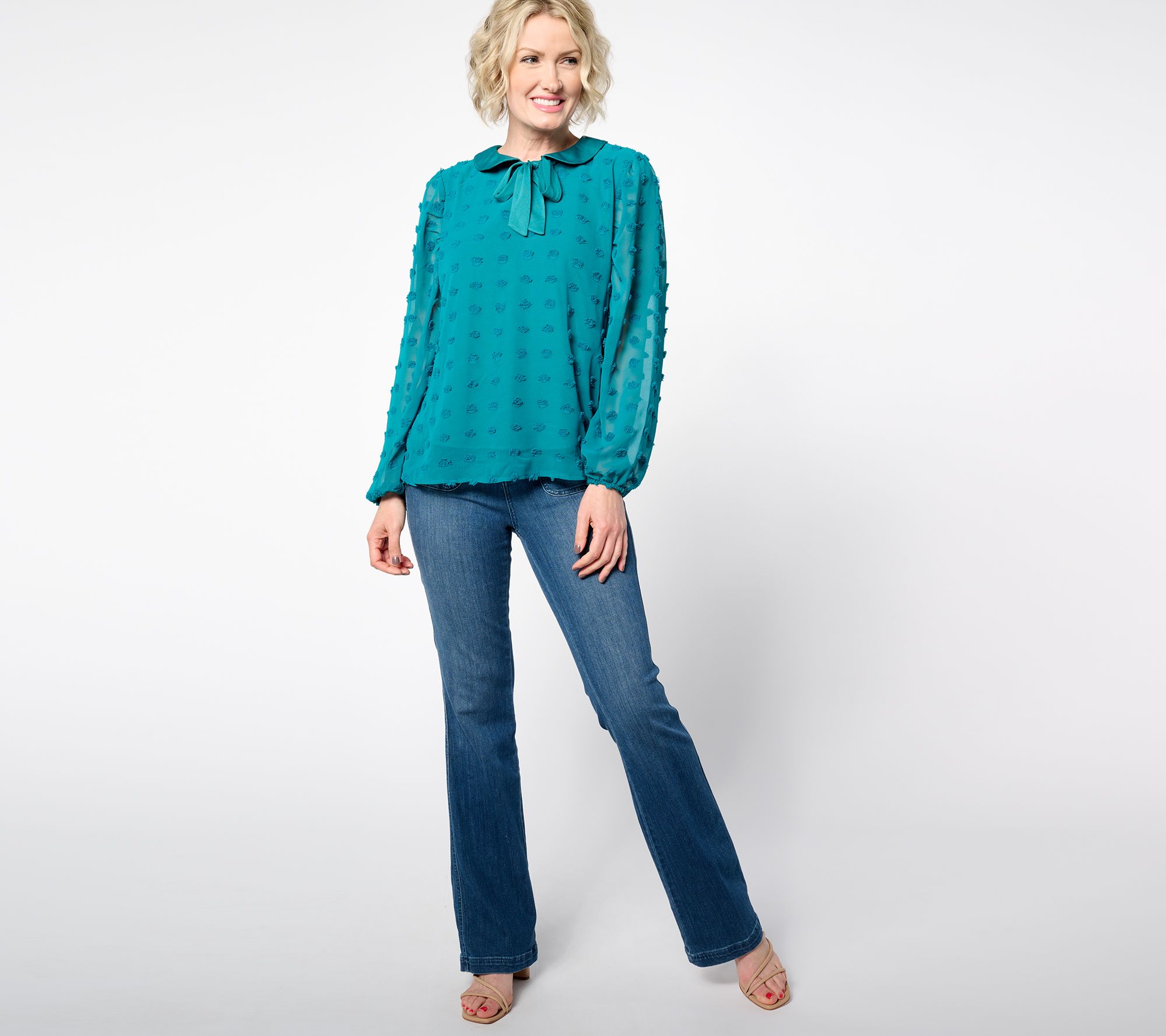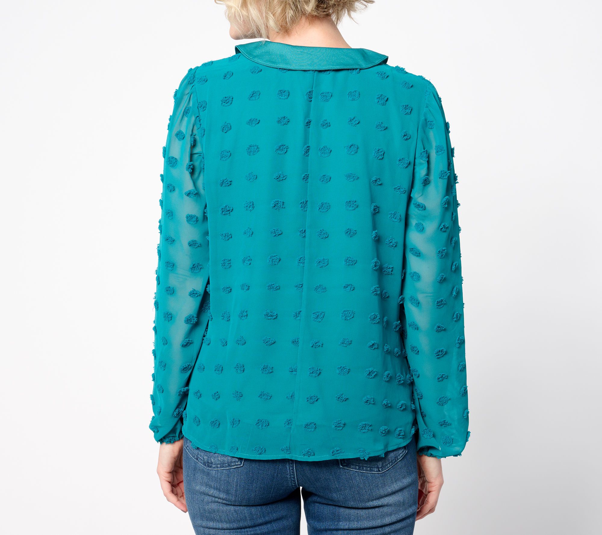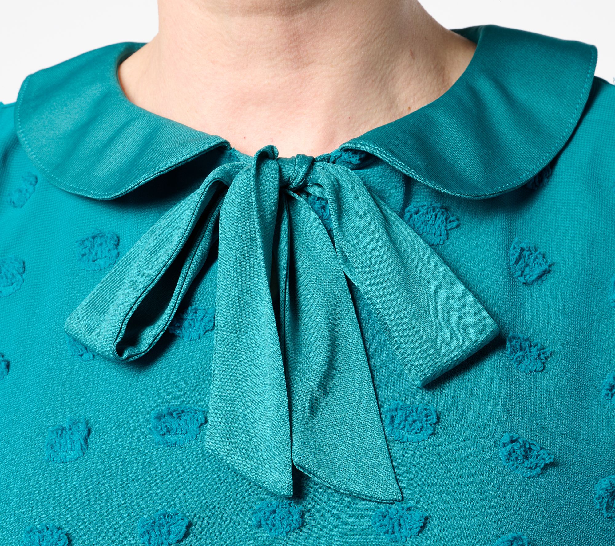 How sweet! This textured top looks effortlessly elegant with boot-cut denim and a pair of pumps. The charming Peter Pan collar with a functional bow adds a touch of sophistication to any outfit. From Studio Park x Ali Carr.