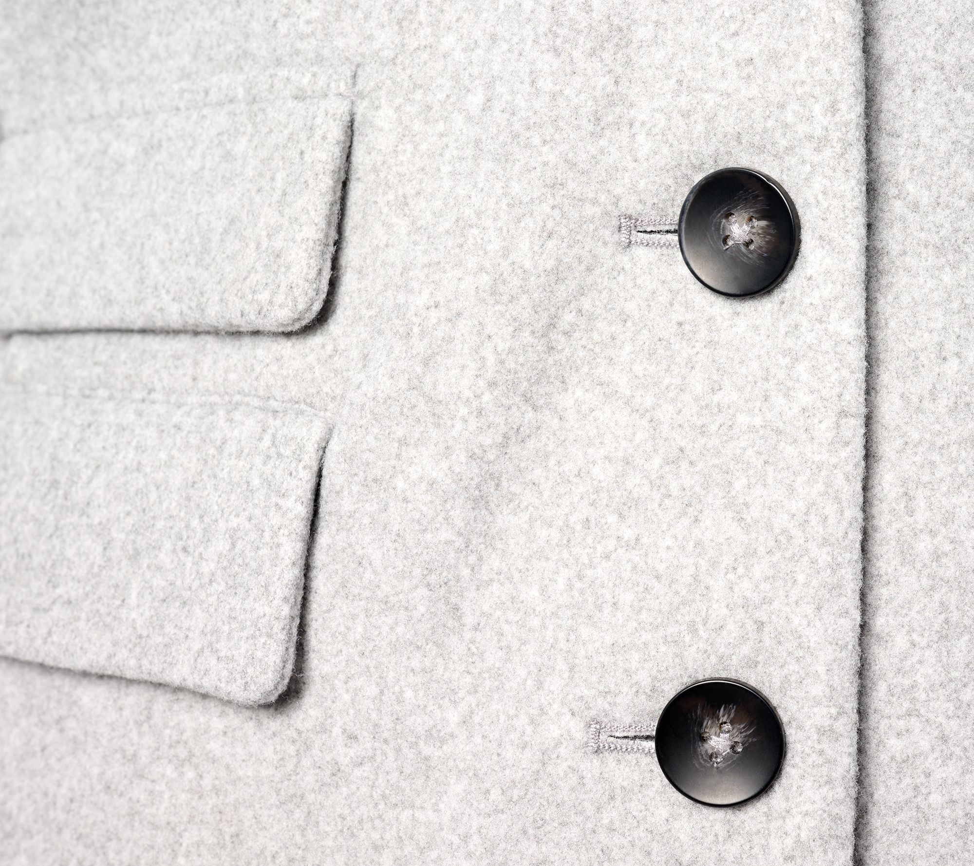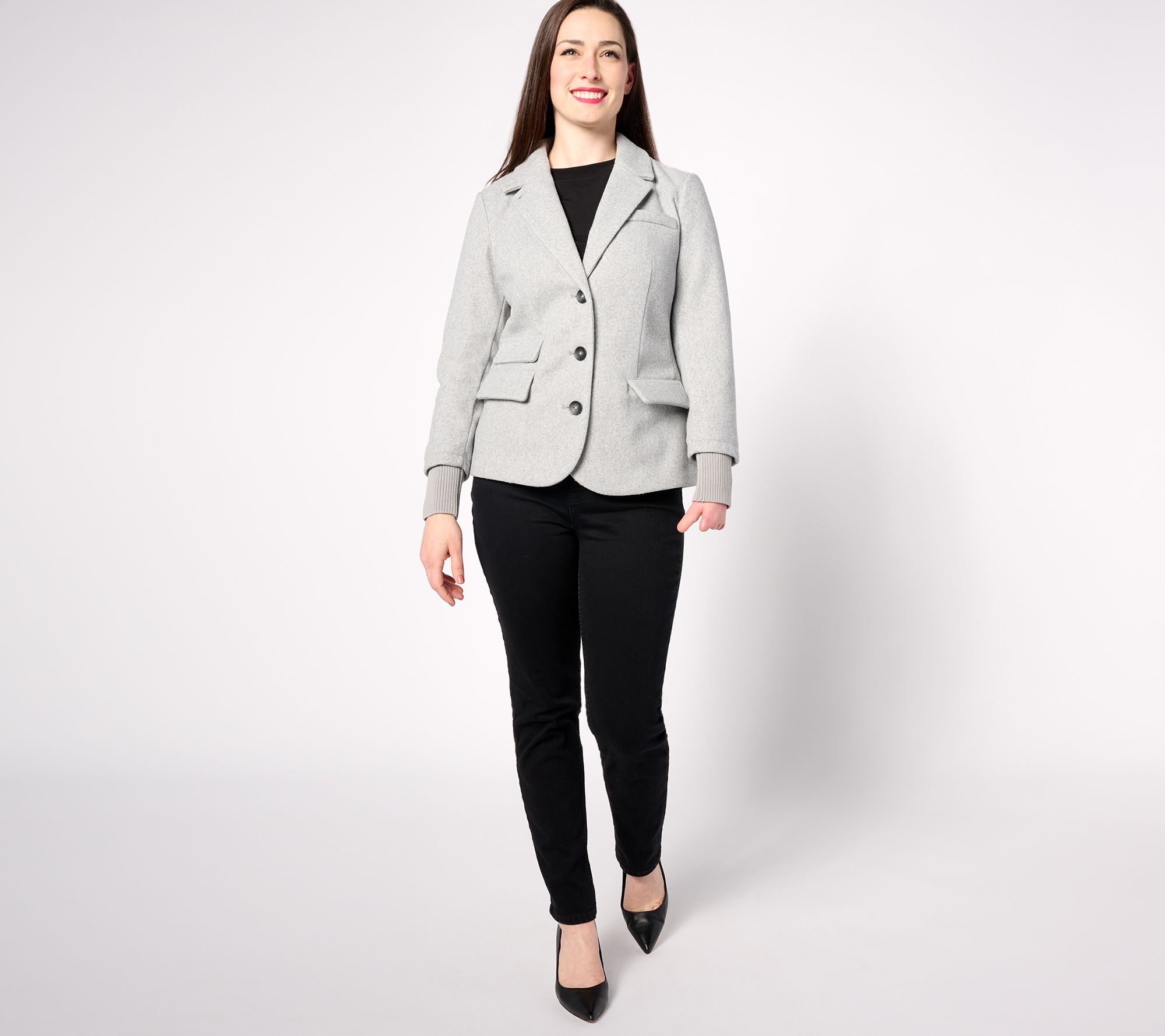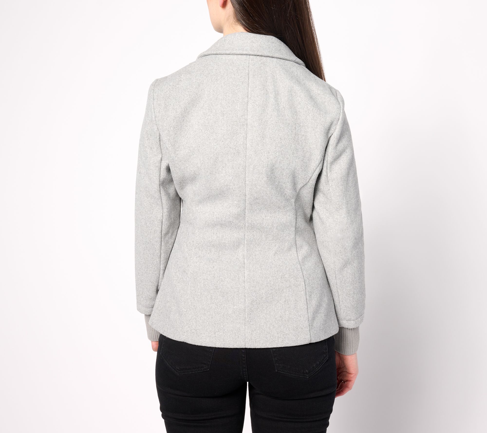 • Features: notch lapel, button-front closure, locker loop, faux welt pockets, long sleeves, rib cuffs, center-back seam, princess seaming, curved bottom hem
