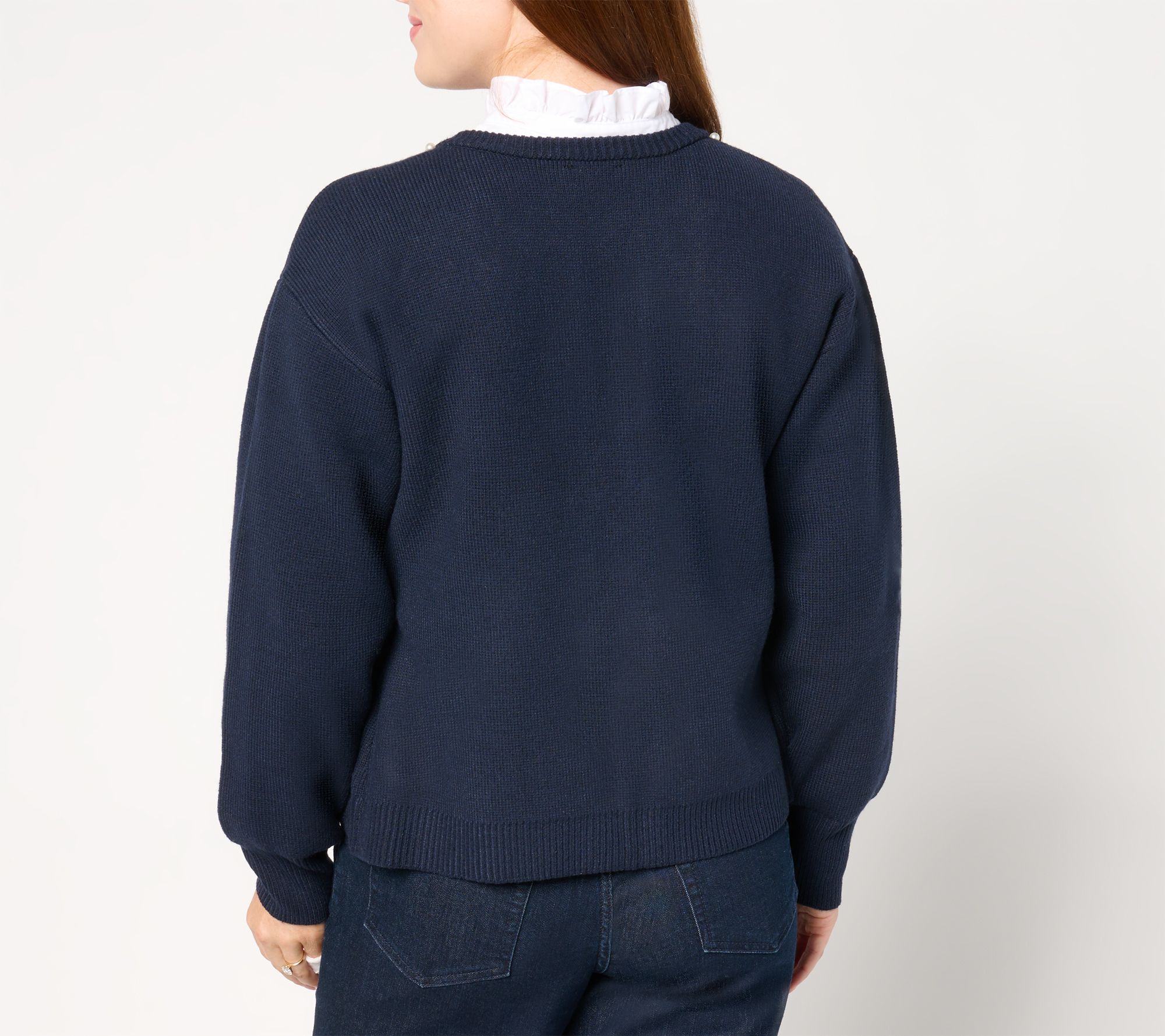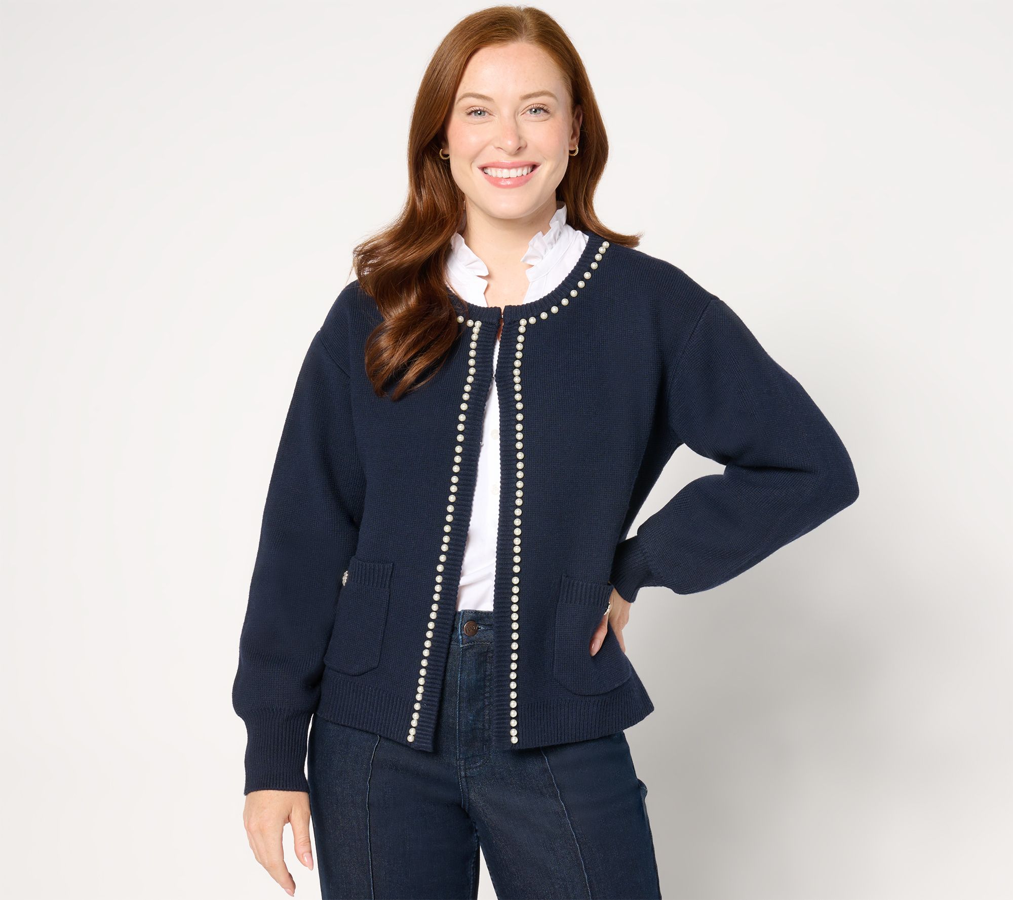 Not just another cardigan, this pretty option is fashioned with faux pearls along the trim and ribbing details at the neckline, placket, pockets, sleeve openings, and hem. From Studio ParkTM x Amy Stran.