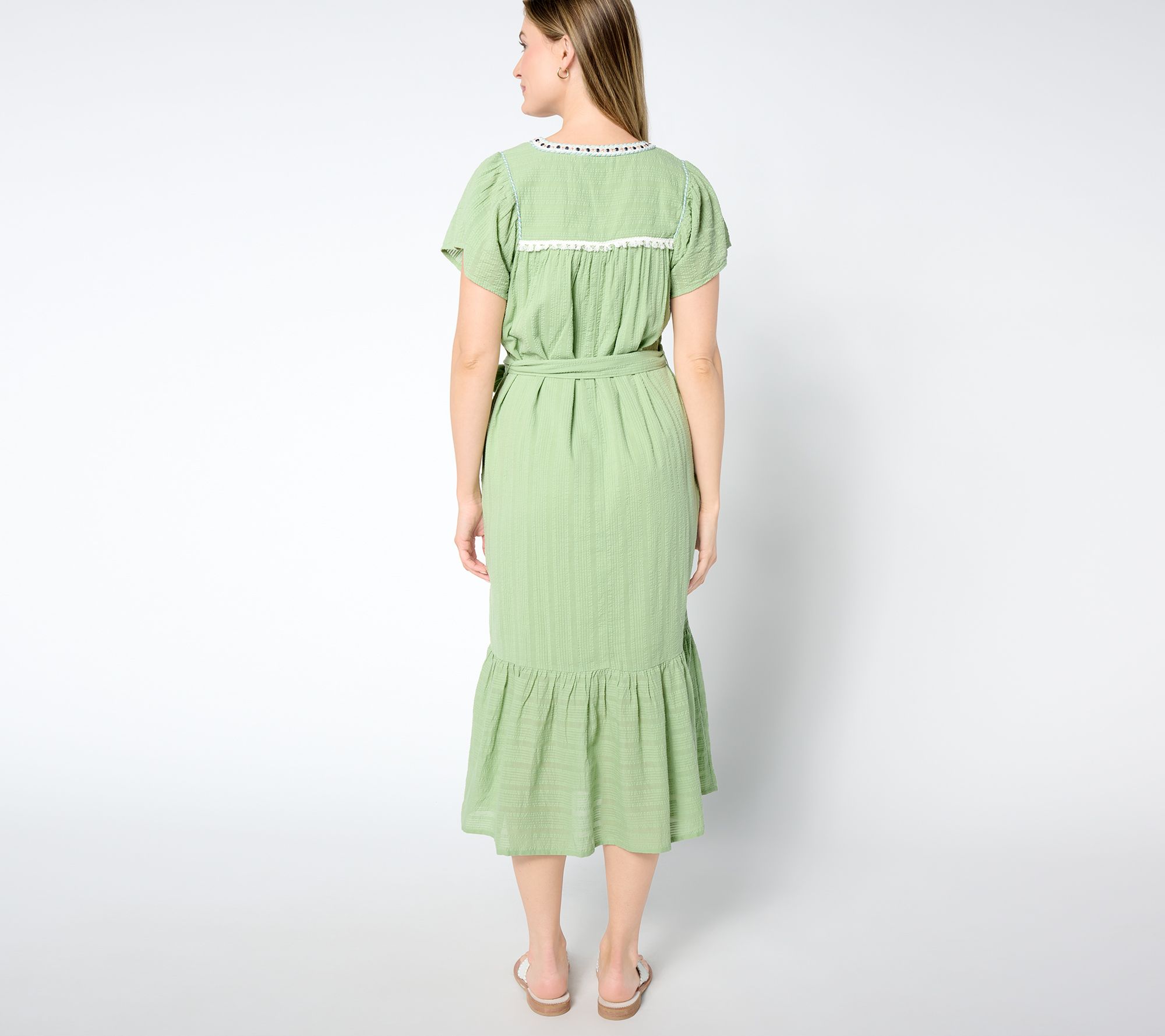 • Features: midi length, short sleeves with gathering, V-neckline, embellished pieced big, self-tie belt, side pockets, back yoke, center-back seam