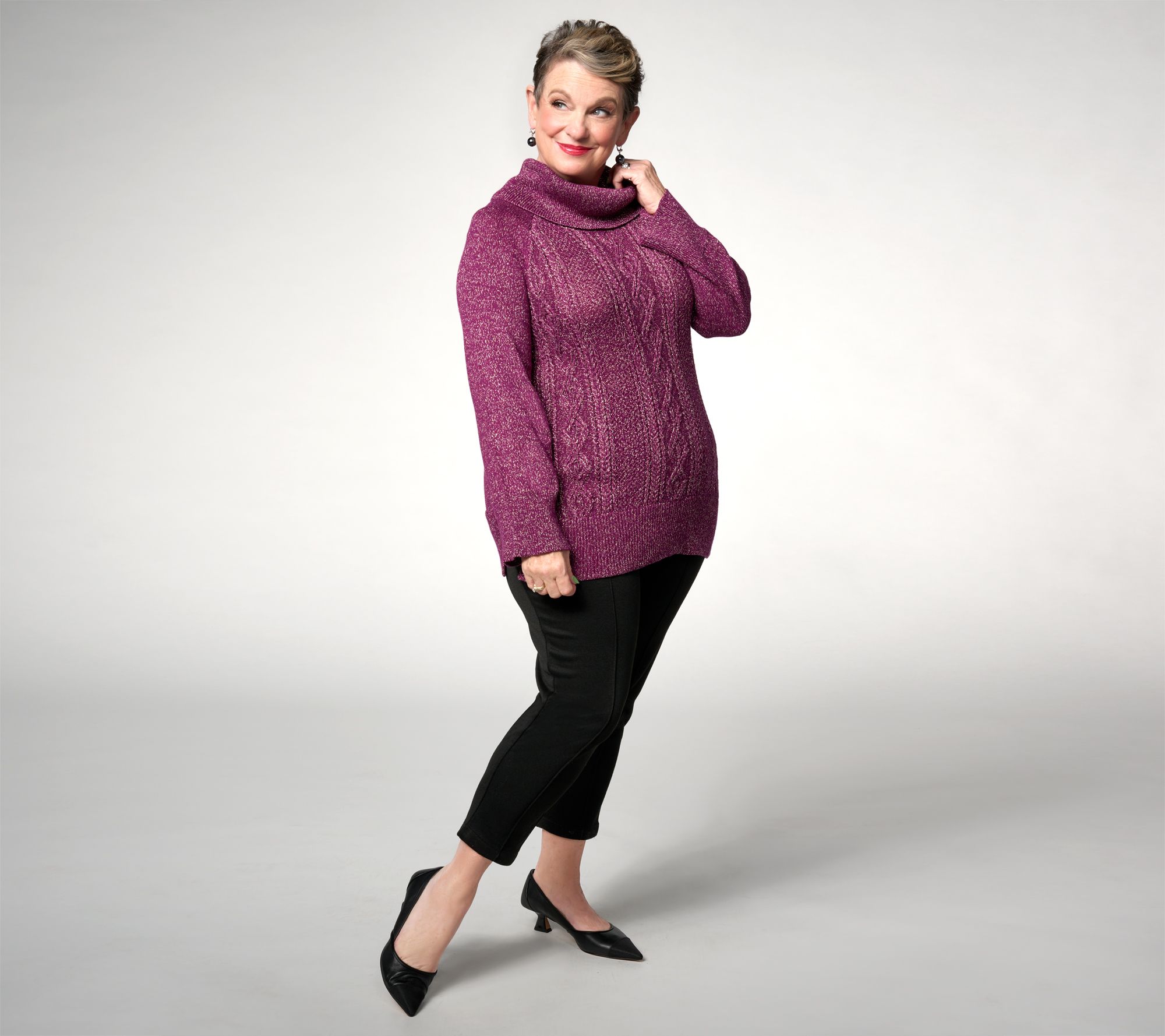 Sparkle more! This cabled cowl neck sweater is a beautiful way to reflect your joy in being together with friends and family this season, or to celebrate a milestone in an everyday kind of way. From Studio ParkTM x Jane Treacy.