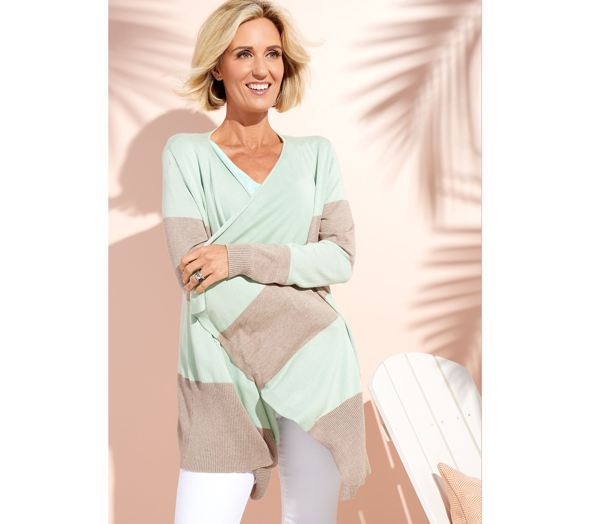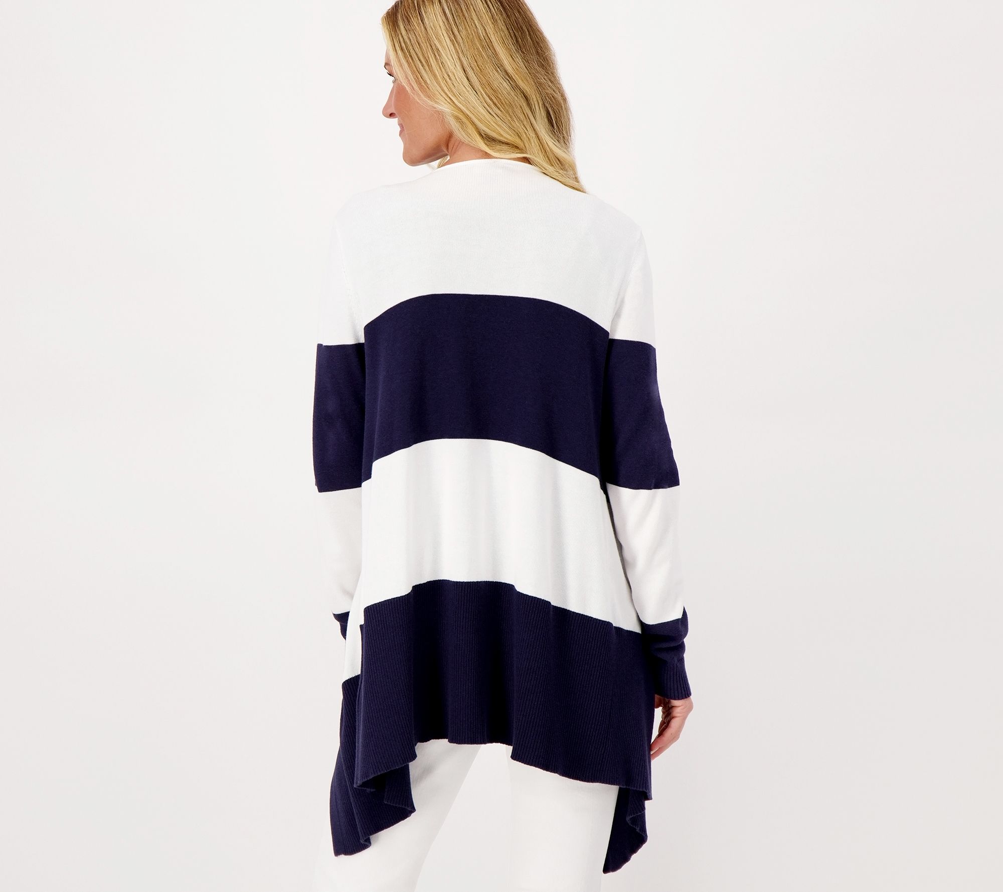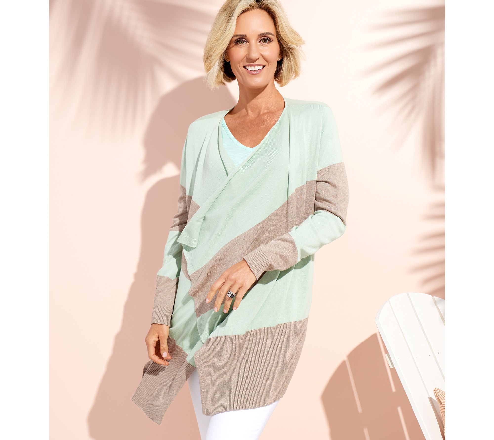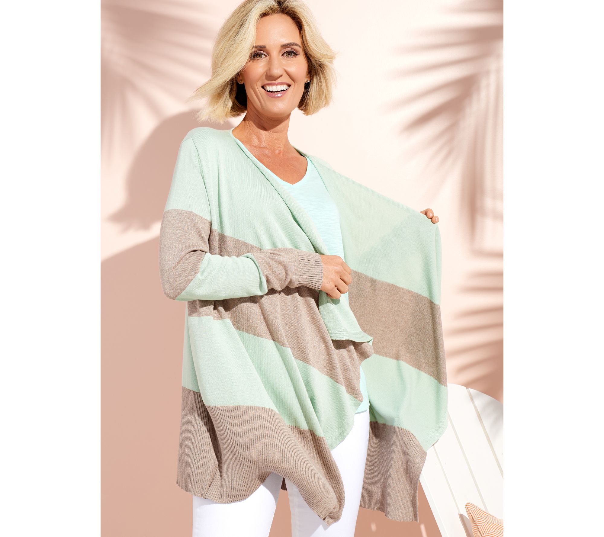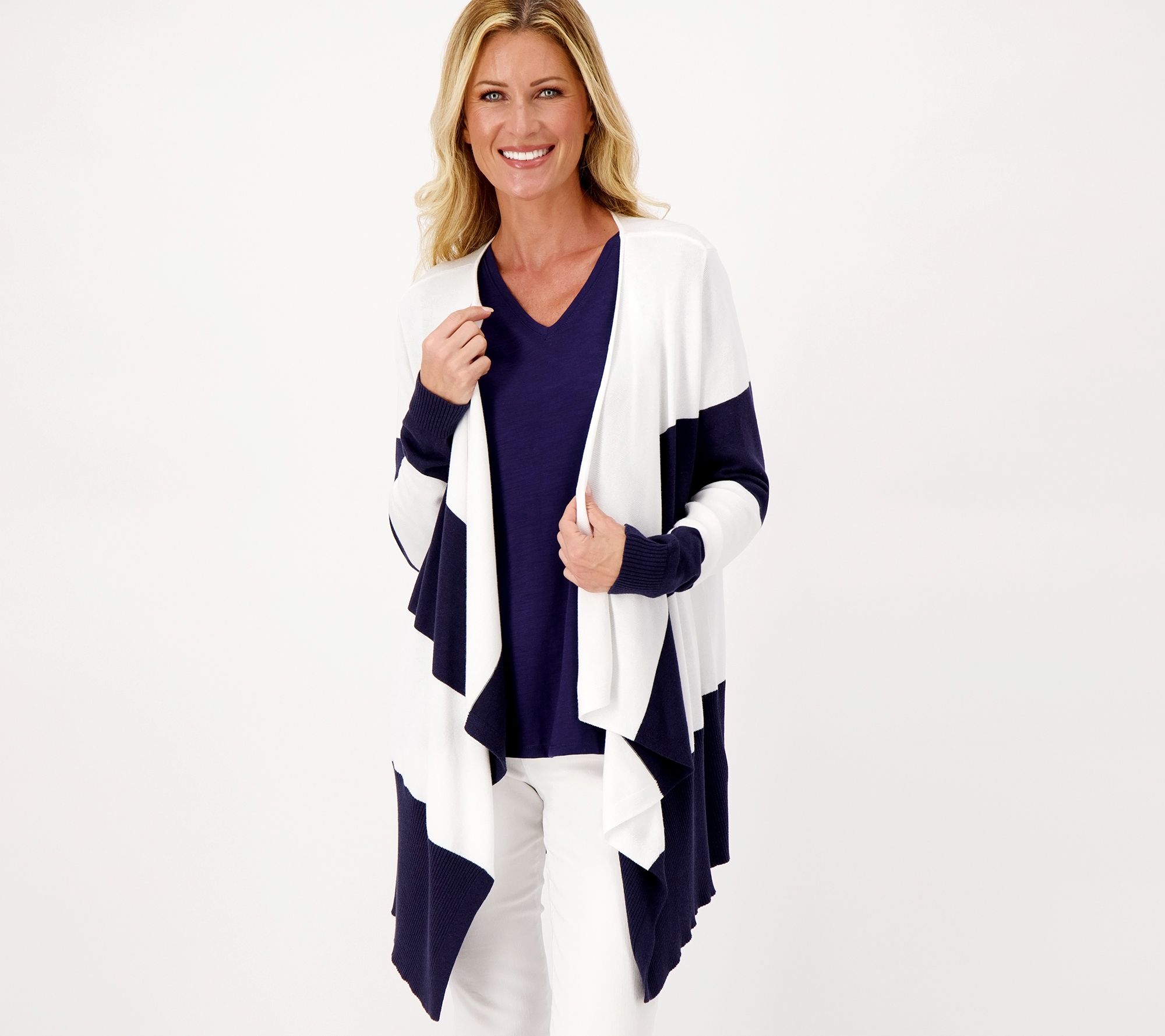 For windy afternoons at the shore, dinners on the water, and morning strolls with your sweetie, this stylish cardigan dresses up with capris or down with leggings. It's that find of the summer. From Studio Park.